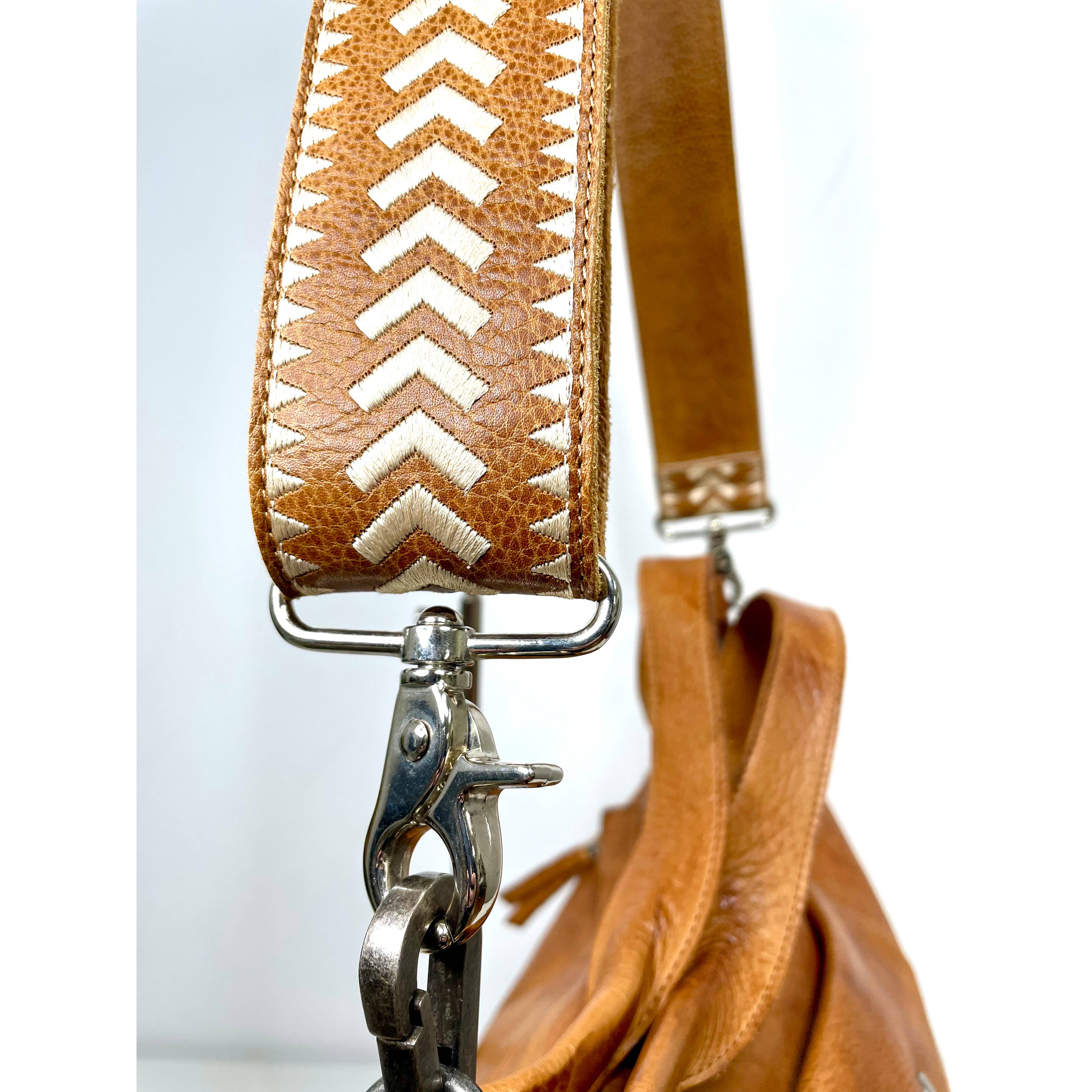 Our Newest Add-On is now available! Accessorize your Latico with our handcrafted adjustable wide leather embroidered shoulder strap with arrow detailing. Details 100% Full-grain leather handcrafted by artisans in South America and India. Every hide is unique so you will notice natural variations in the grain texture and shading which are hallmarks of high-quality. 2" wide leather detachable strap with adjustable length 27" minimum length, 50" maximum length