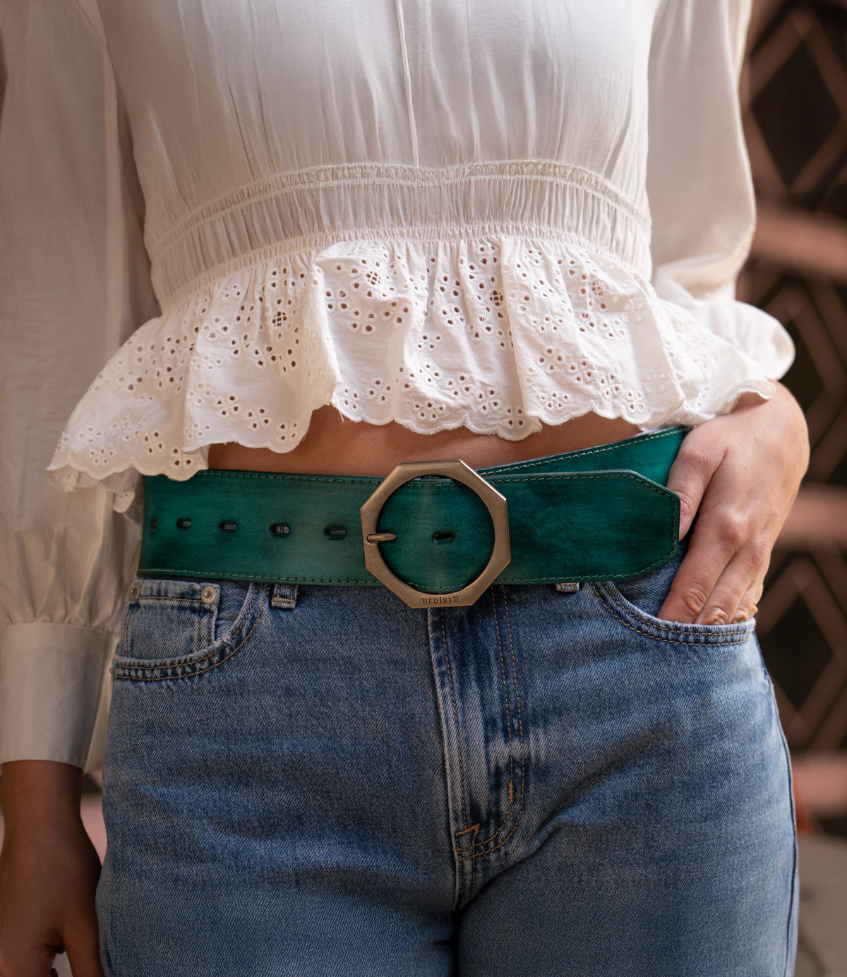 - Wide boho-inspired leather belt with clean edge stitching