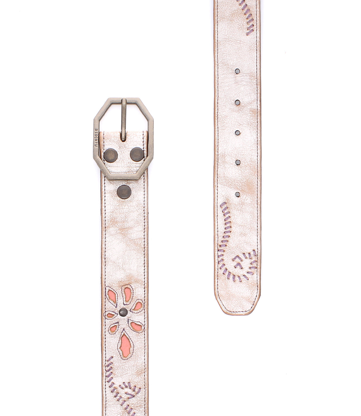 Upswing II brings handcrafted charm to a classic belt silhouette. The soft, vegetable-tanned leather is accented with a delicate floral design and subtle contrast inlays, giving it a warm, artisanal feel. An octagonal metal buckle adds a modern touch while keeping the look timeless. Finished with hand-stitched detailing, Upswing II is the kind of belt that elevates anything you pair it with.
