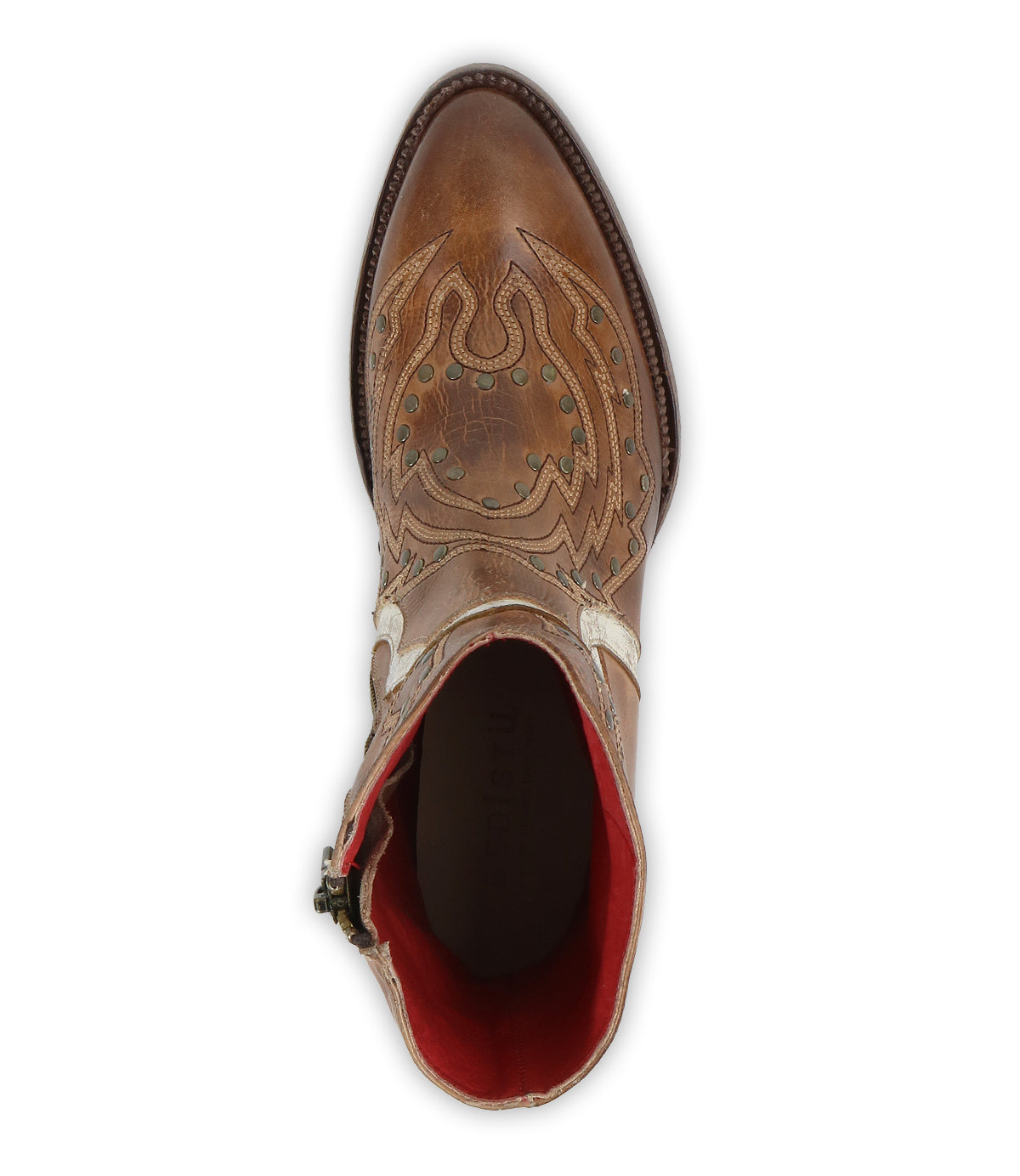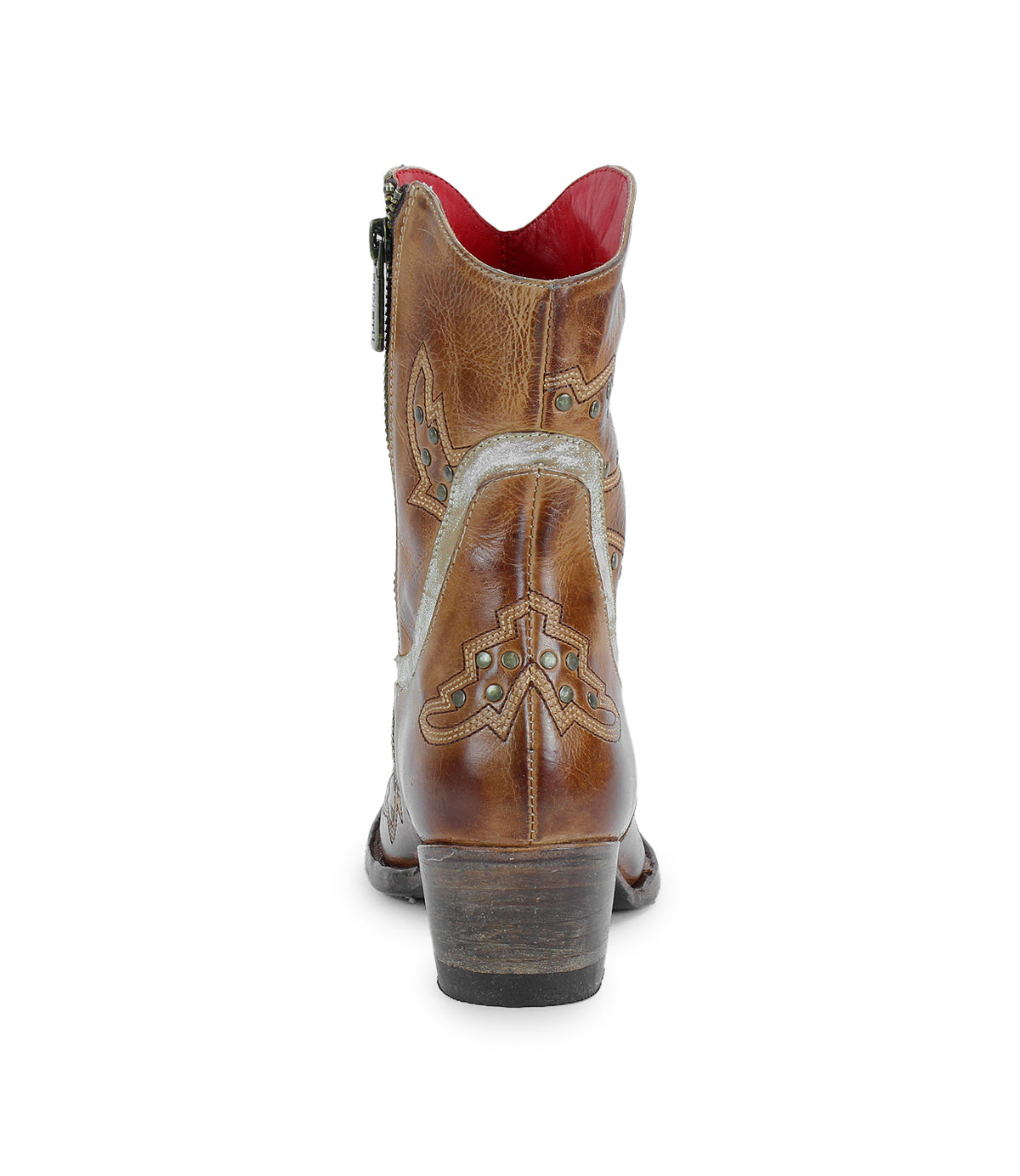 Chamise shows western charm meeting modern edge in this mid-height boot crafted for standout style and everyday ease. Featuring layered leather inlays, antique brass stud accents, and shimmering metallic piping, this boot is full of personality from every angle. A convenient side zipper offers easy on and off, while the stacked leather heel provides comfort and stability. Finished with a snip toe, red leather lining, and hand-burnished detailing, this boot delivers bold attitude and undeniable flair in every step.
