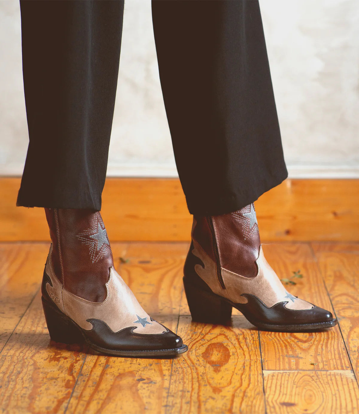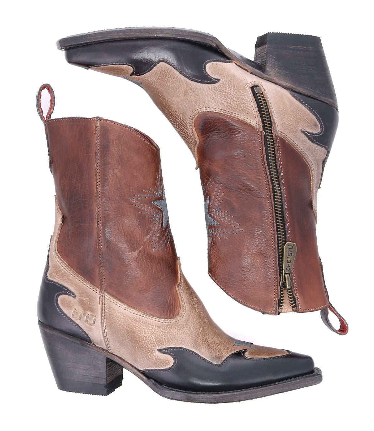 Hyperspeed is a western-inspired leather boot, handcrafted from vegetable-tanned leather. This standout pair features three distinct leather finishes, adding a touch of artistry to your ensemble. The boots are elevated with leather stacked heels and meticulously constructed using Goodyear welt for enduring quality. With a convenient side zipper, slipping into these boots is effortless, ensuring both style and ease of wear.