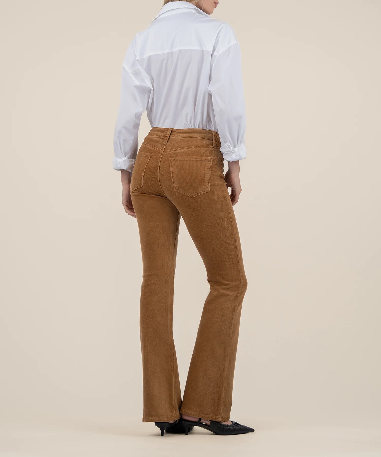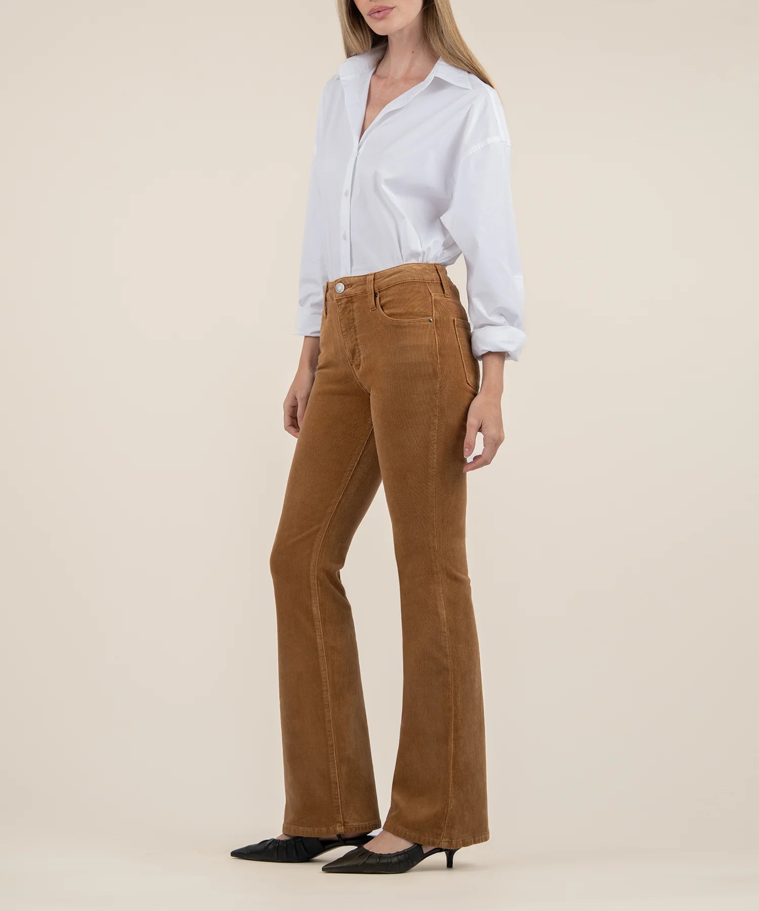 - These flared corduroy pants complement your figure with floor-grazing legs and Fab Ab front pockets that shape and smooth.