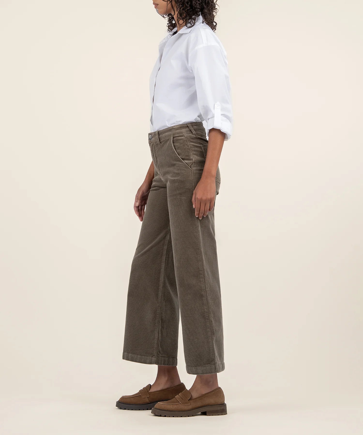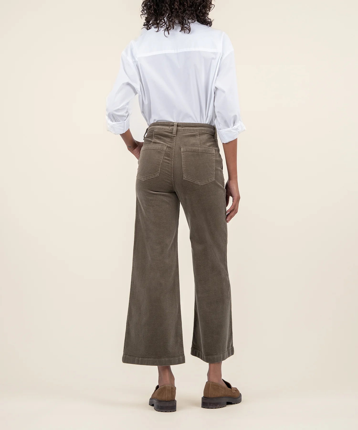 Rock a vintage-chic look in these high-rise, ankle-length flare jeans made from super soft corduroy and finished in a rich olive. Add Kut from the Kloth's fab ab front pockets to smooth and add comfort to these great pants