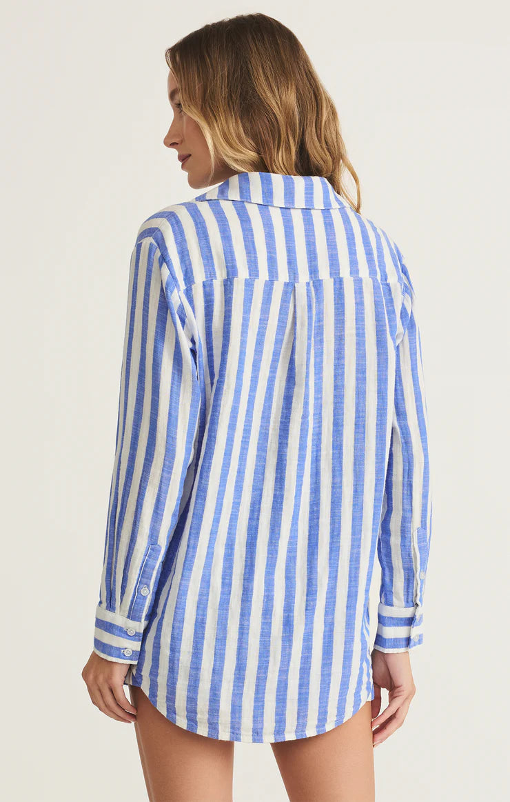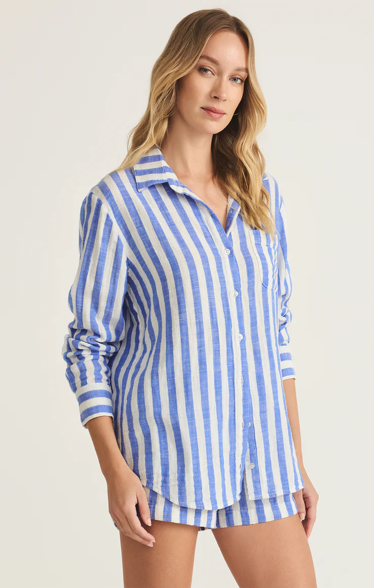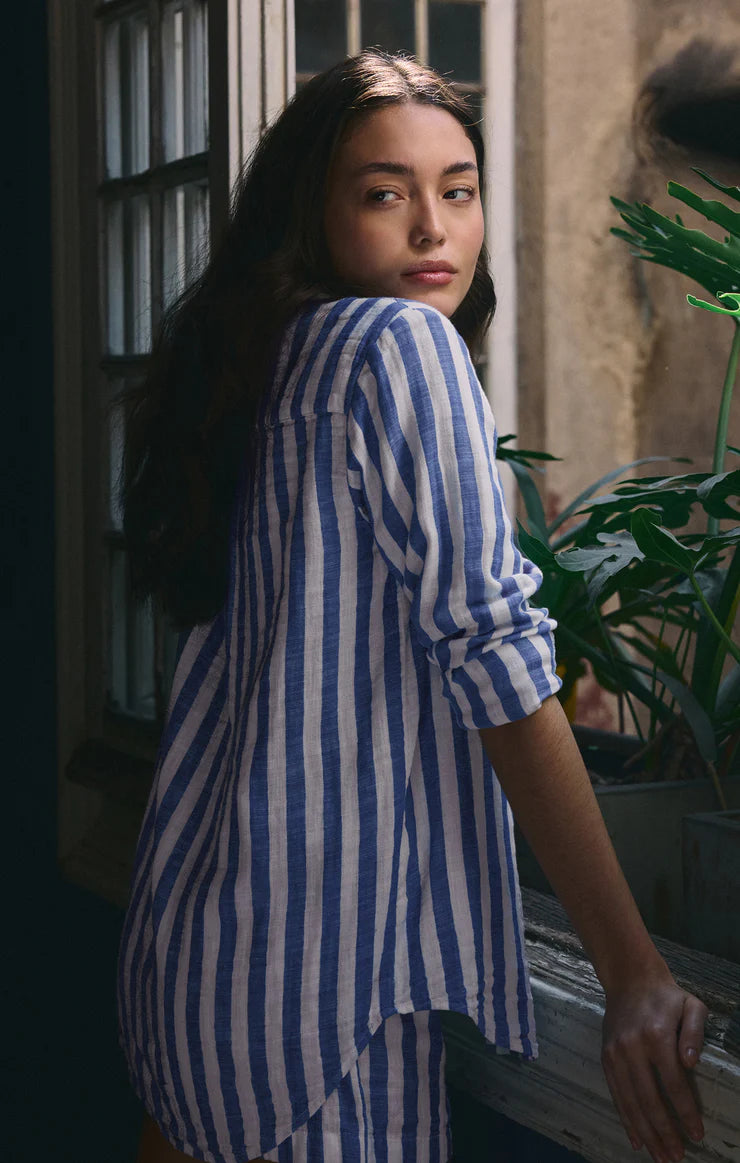 Relaxed and versatile, this striped button-up shirt is made from midweight double-layer gauze for a soft, breathable feel. With a classic collar and long sleeves, it’s the perfect layer for all your downtime moments.