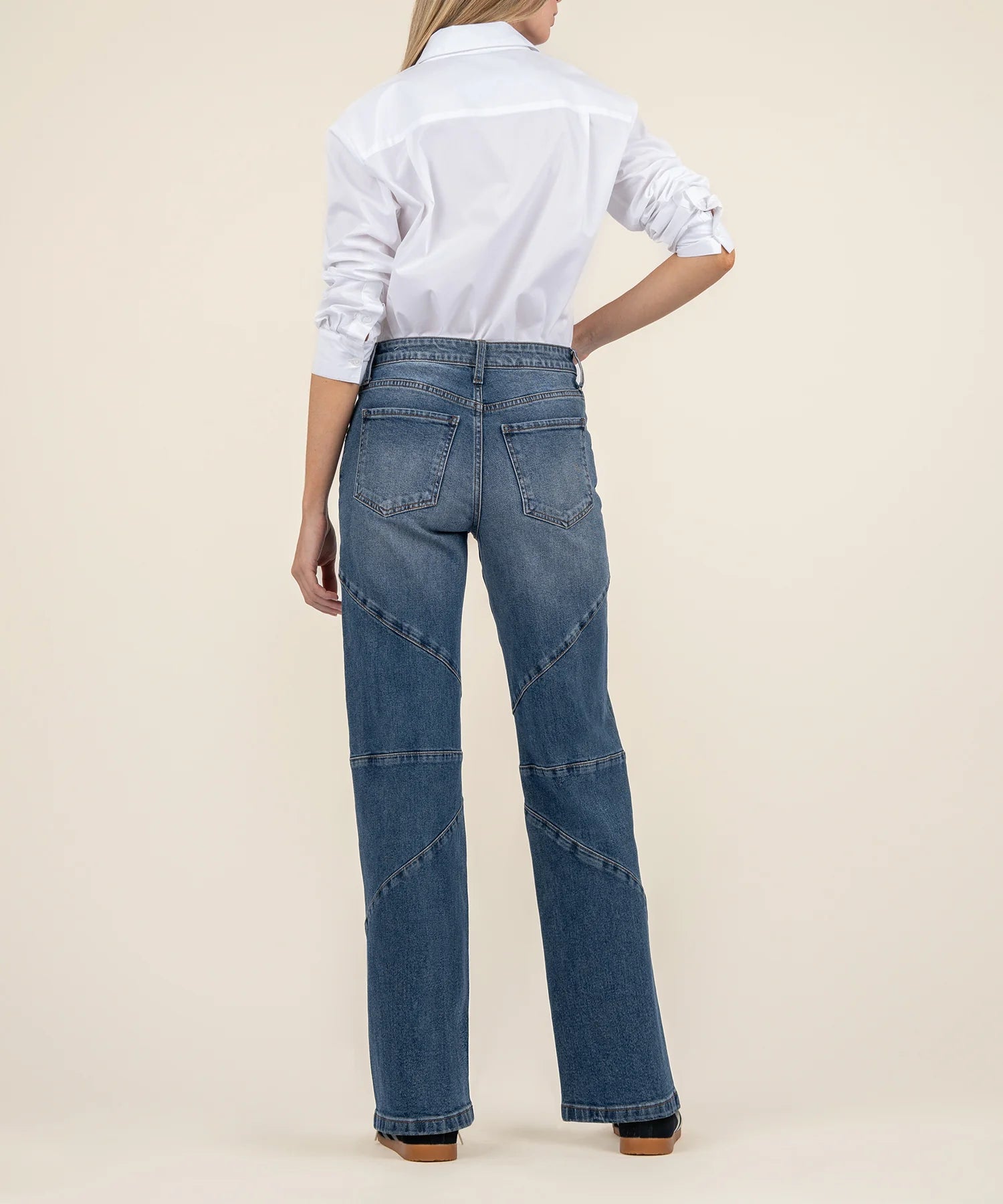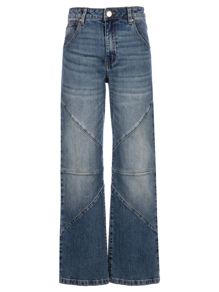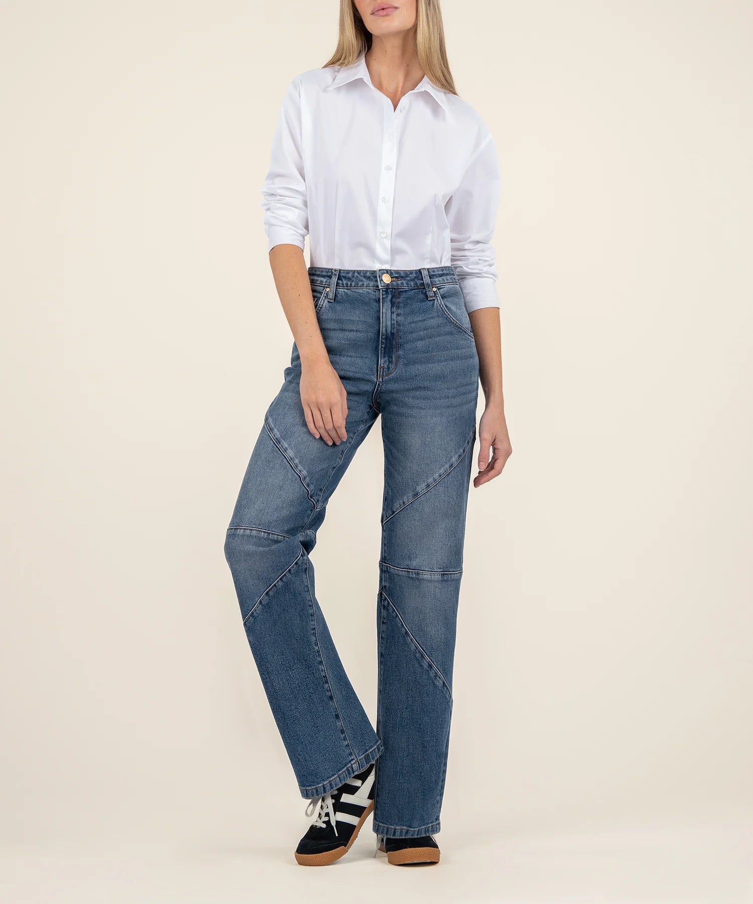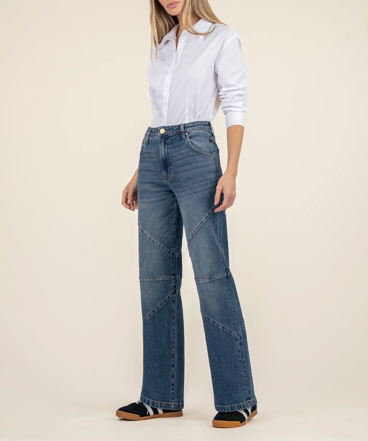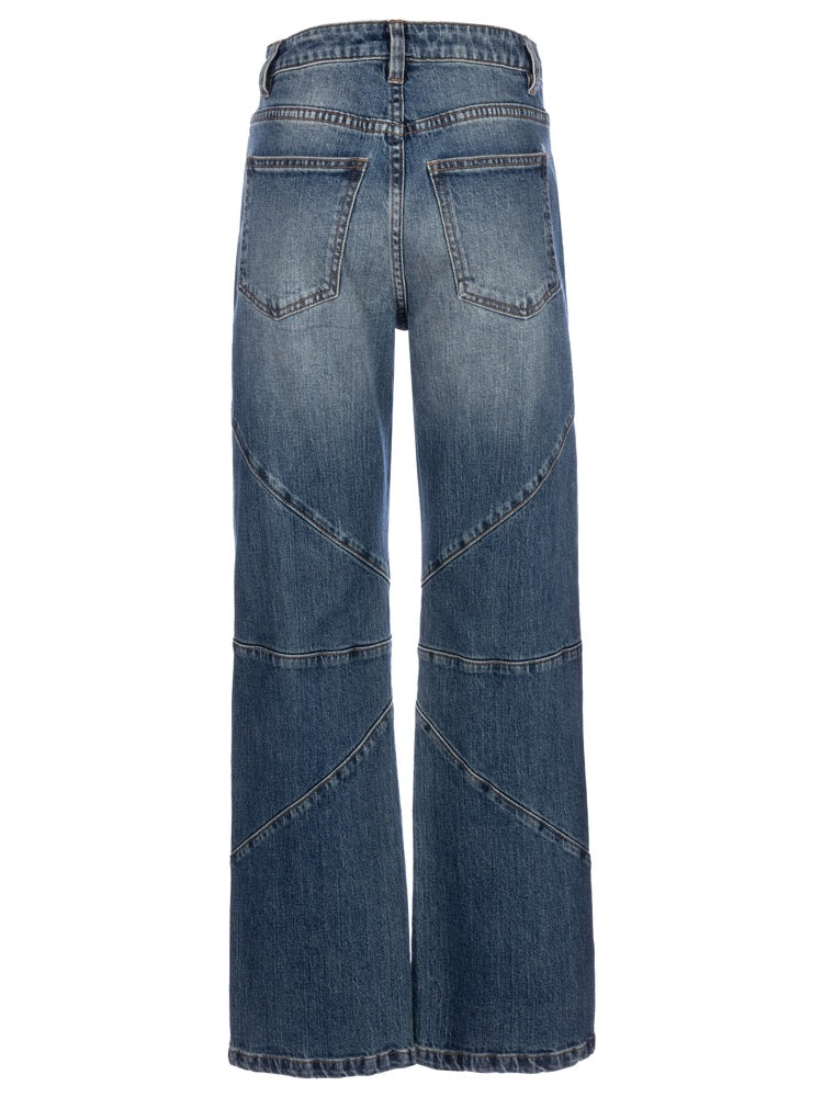 - Rock an iconic vintage look in low stretch, high-rise relaxed fit jeans made with full-length wide legs and stylish seams.