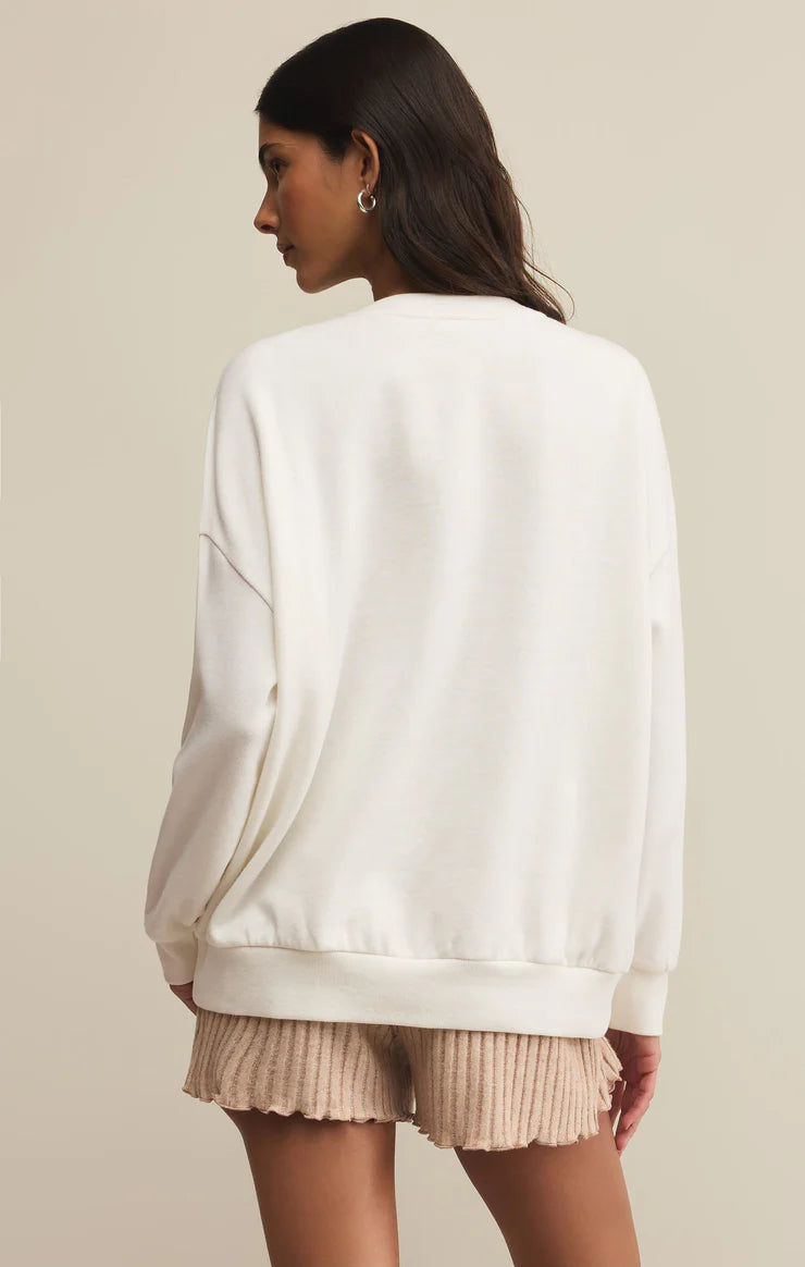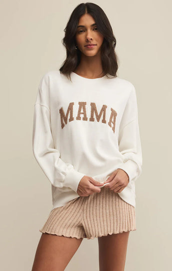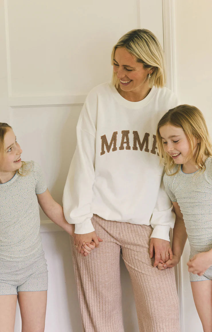 Soft fleece meets effortless style in this relaxed crew neck sweatshirt, featuring a bold “Mama” appliqué graphic with an embroidered border for a standout look. Perfect for layering or lounging, it’s a cozy essential you’ll reach for on repeat.