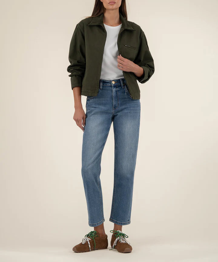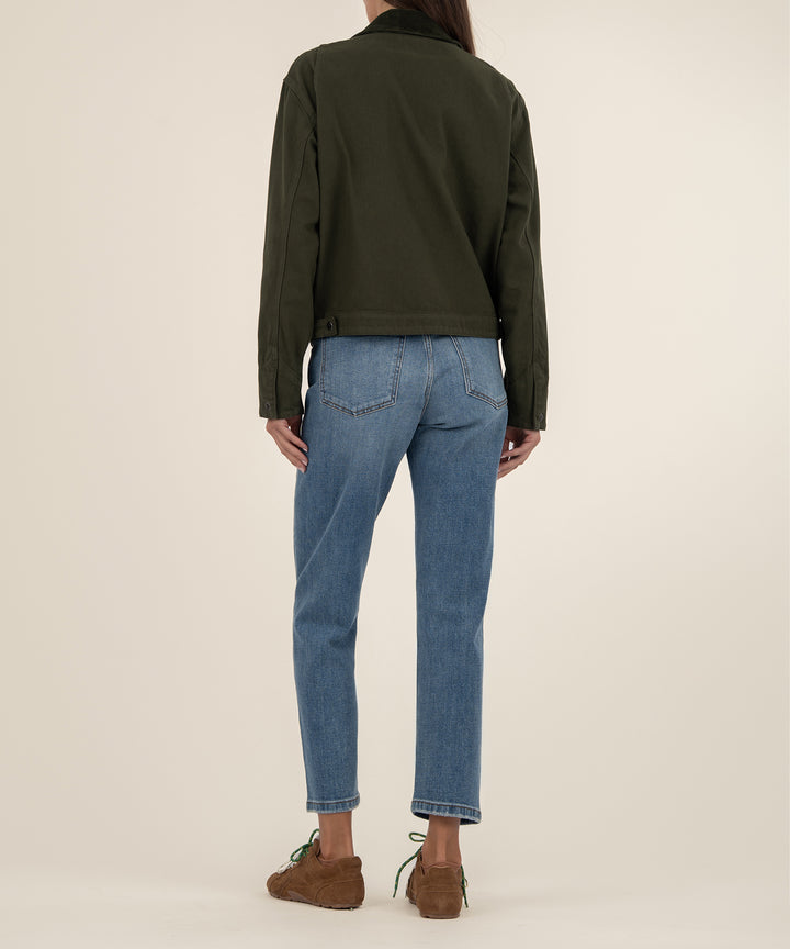 - Add a rugged touch to your wardrobe with this olive twill jacket, featuring a durable zipper front closure and sleek welt pockets for practicality. Its classic design and versatile color make it a perfect layering piece for any season.
