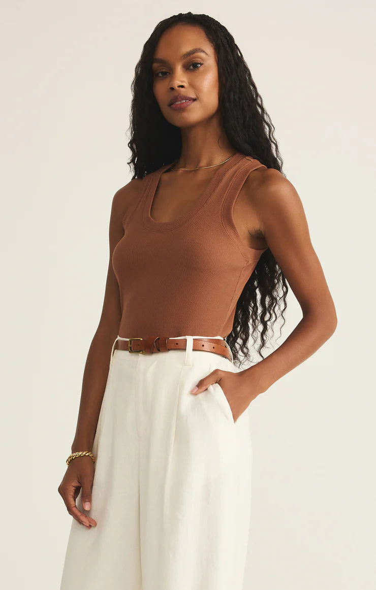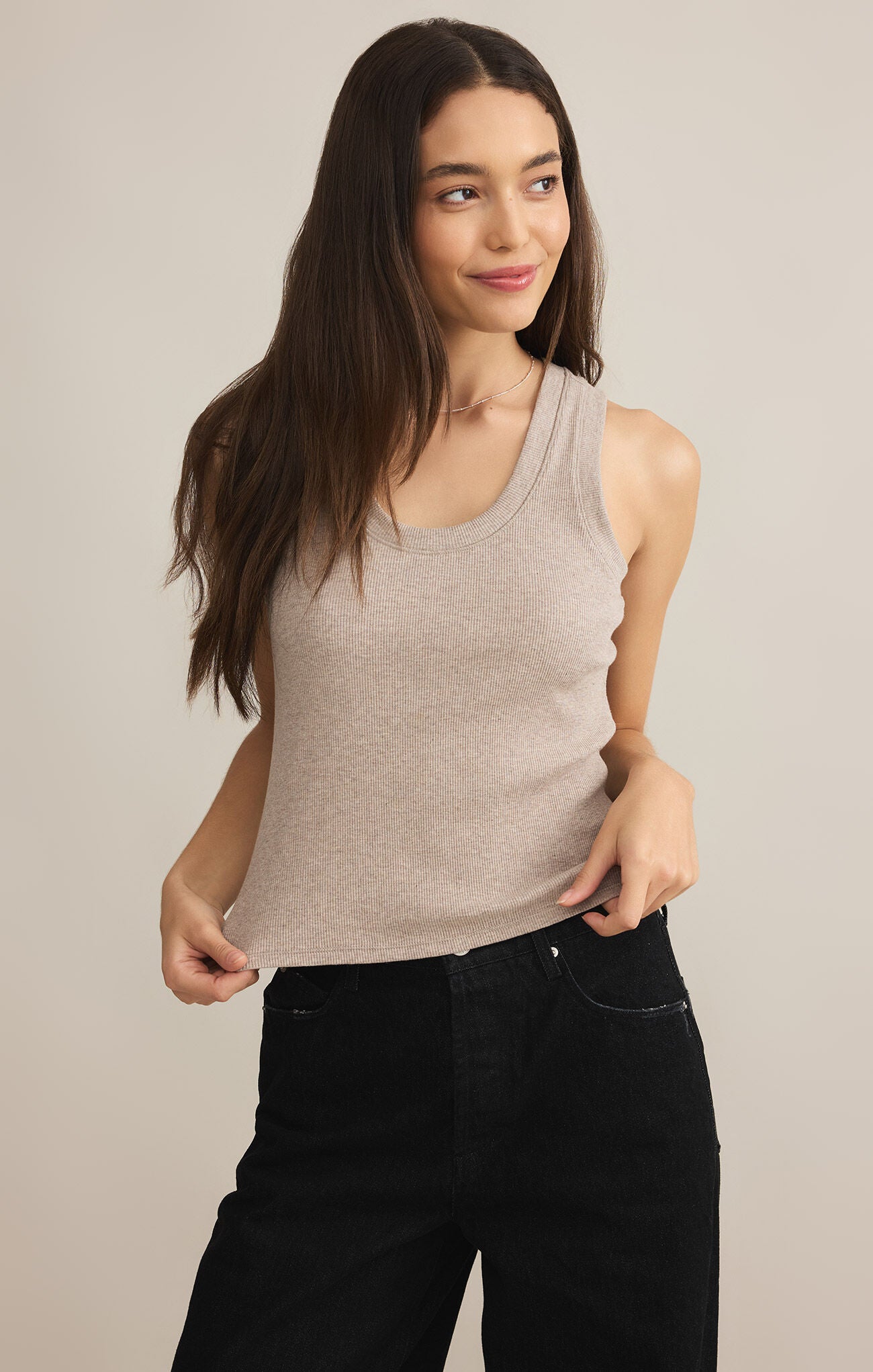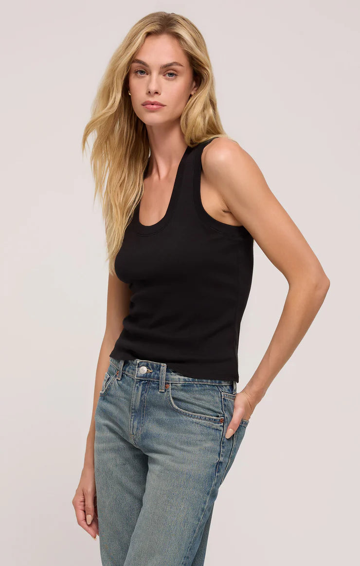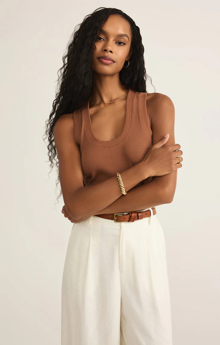 One of our most popular Essential tanks, made of our softly textured feather rib fabric, is a must-have whether worn on its own or as a fitted layer. We love this basic bra-friendly tank tucked or untucked.