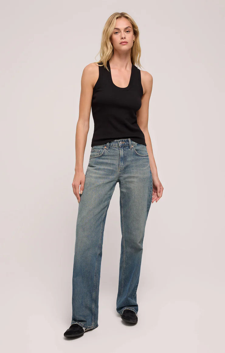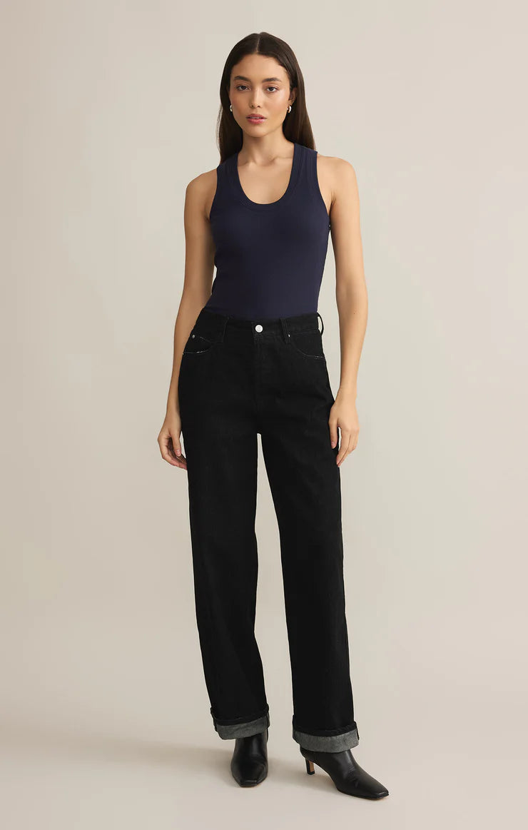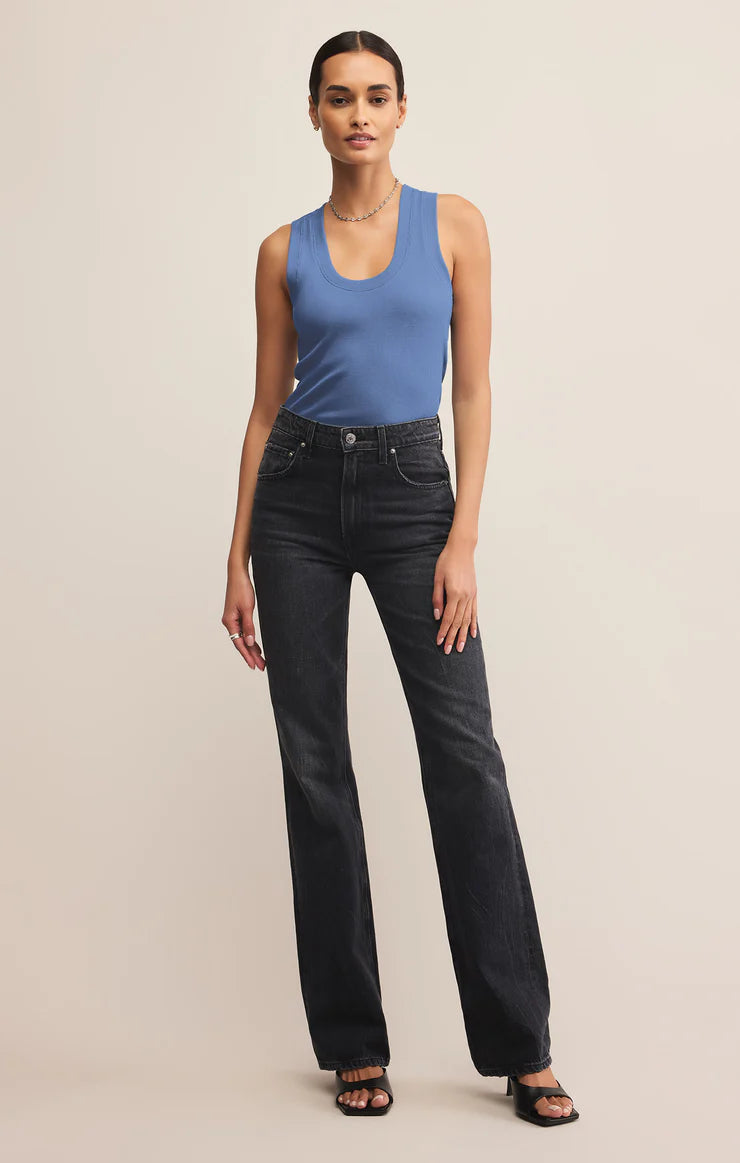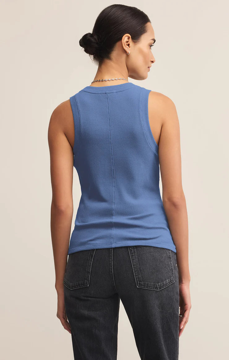 One of our most popular Essential tanks, made of our softly textured feather rib fabric, is a must-have whether worn on its own or as a fitted layer. We love this basic bra-friendly tank tucked or untucked.