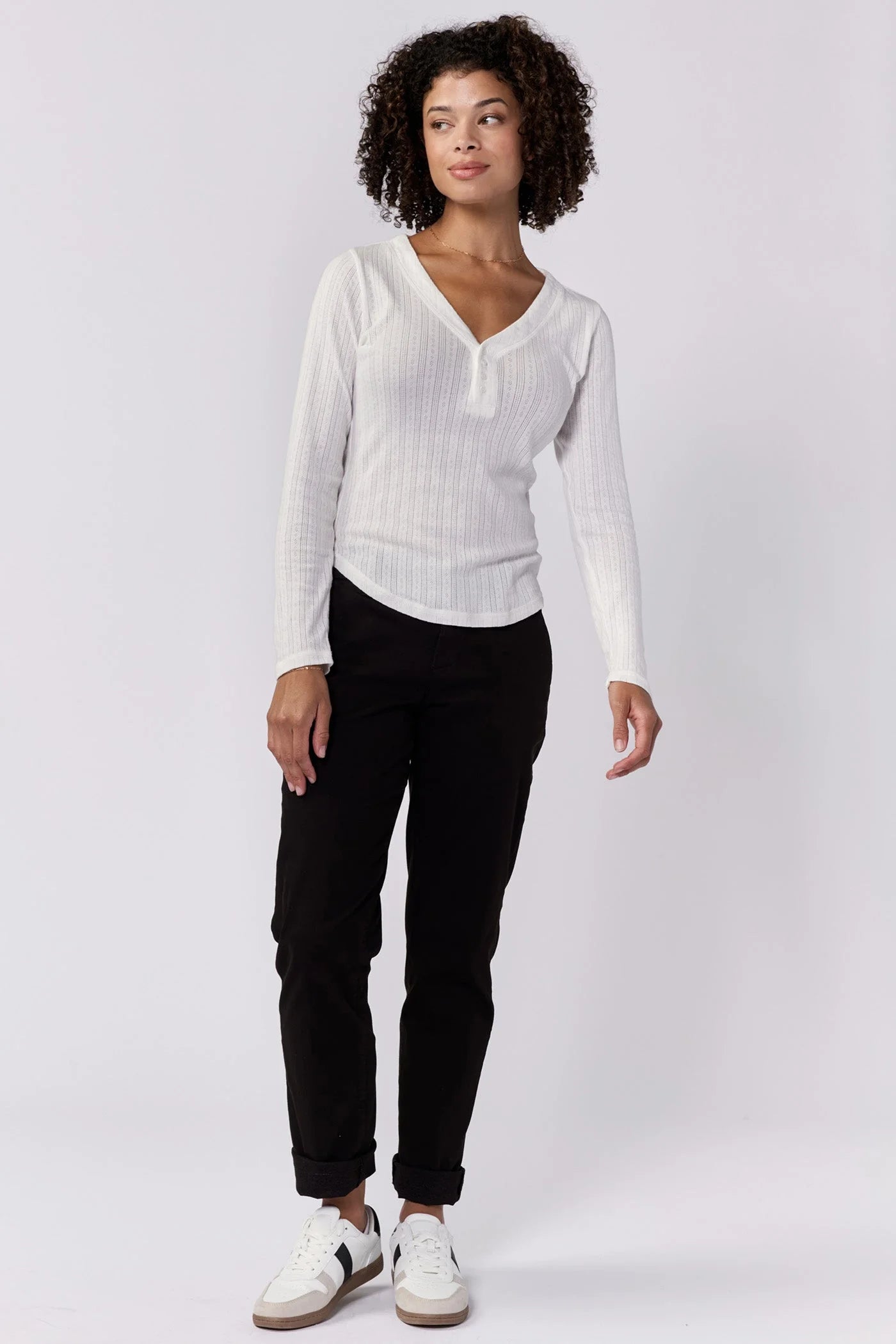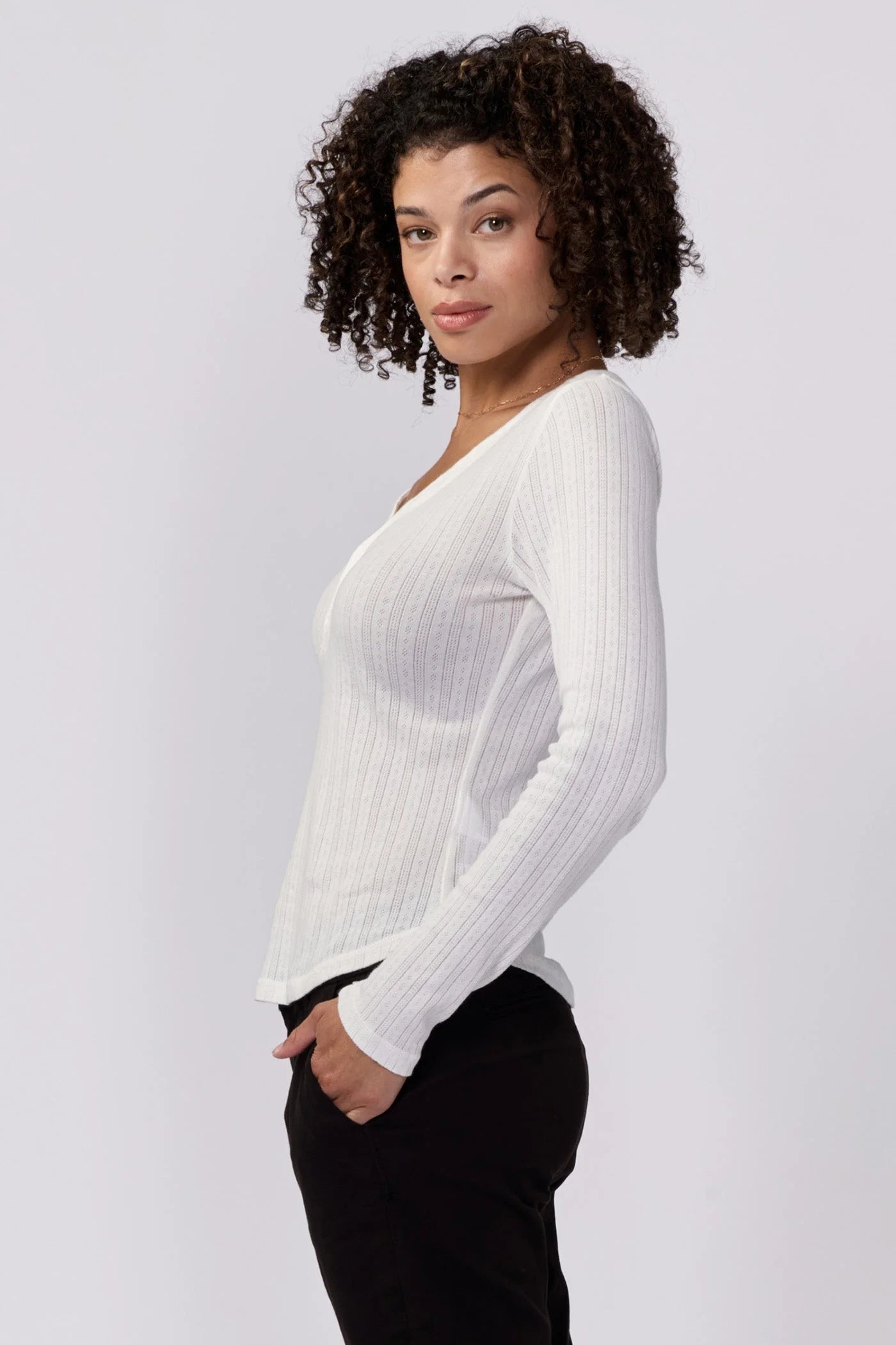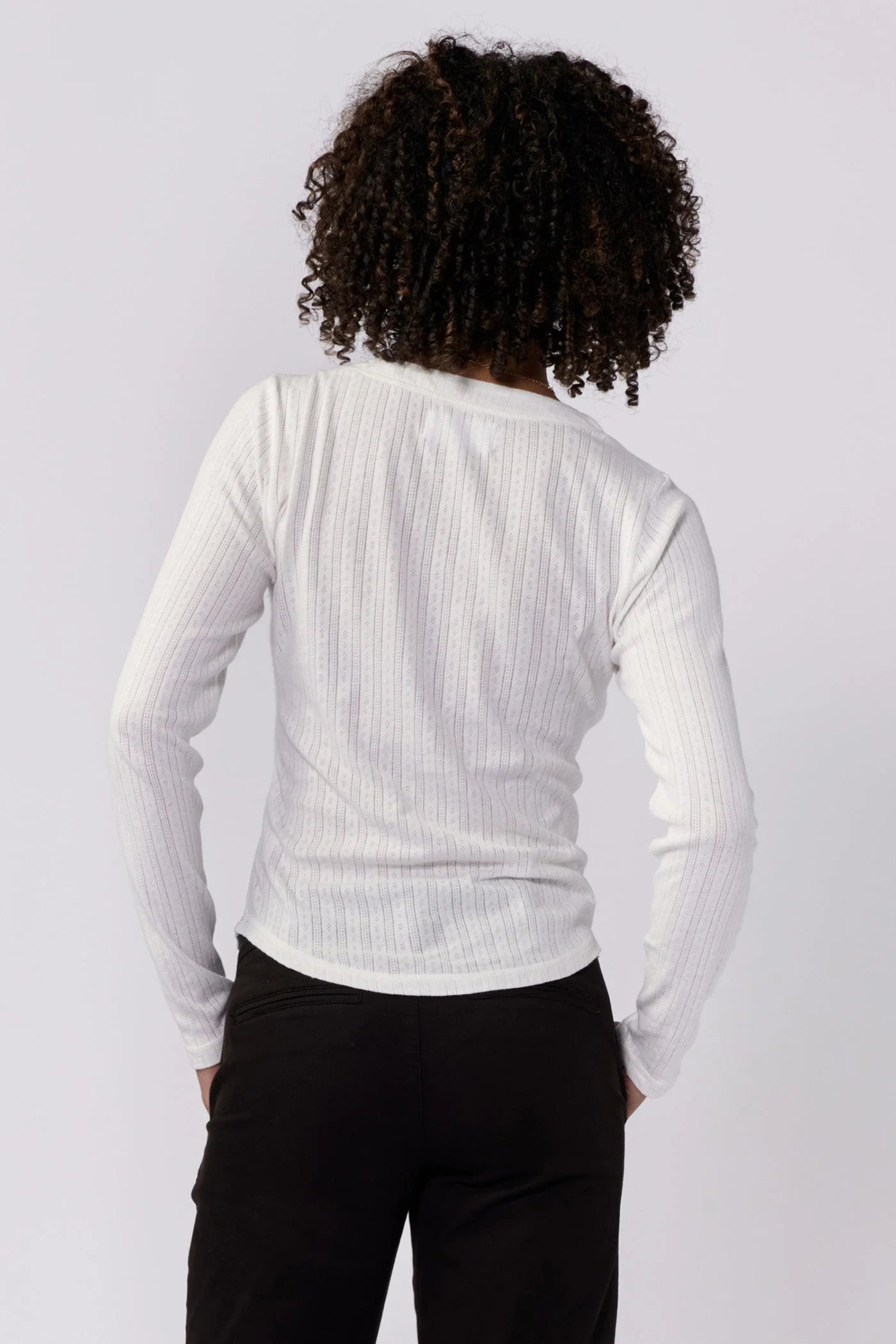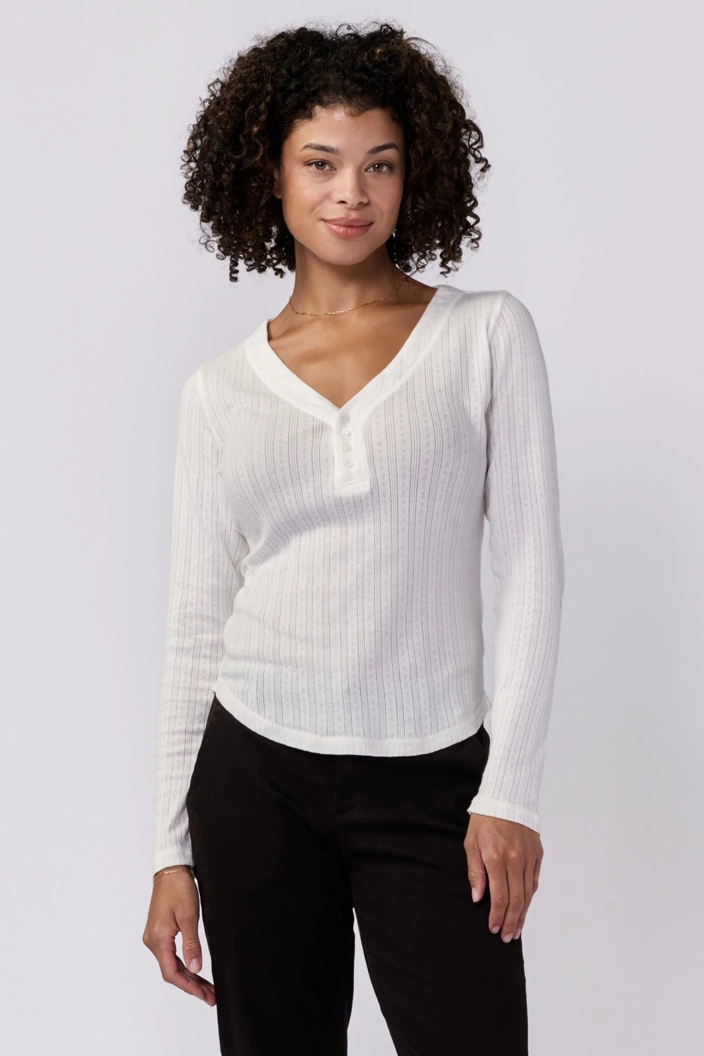 The unparalleled comfort and elegance with our Cortado long sleeve fitted henley, designed to elevate women's fashion with its classic yet modern appeal. This versatile outfit piece features a tailored fit that hugs your body in all the right places, providing both comfort and style. Crafted from high-quality pointelle knit with the color palette adds a unique touch, making it suitable for any occasion, from casual gatherings to more sophisticated settings.