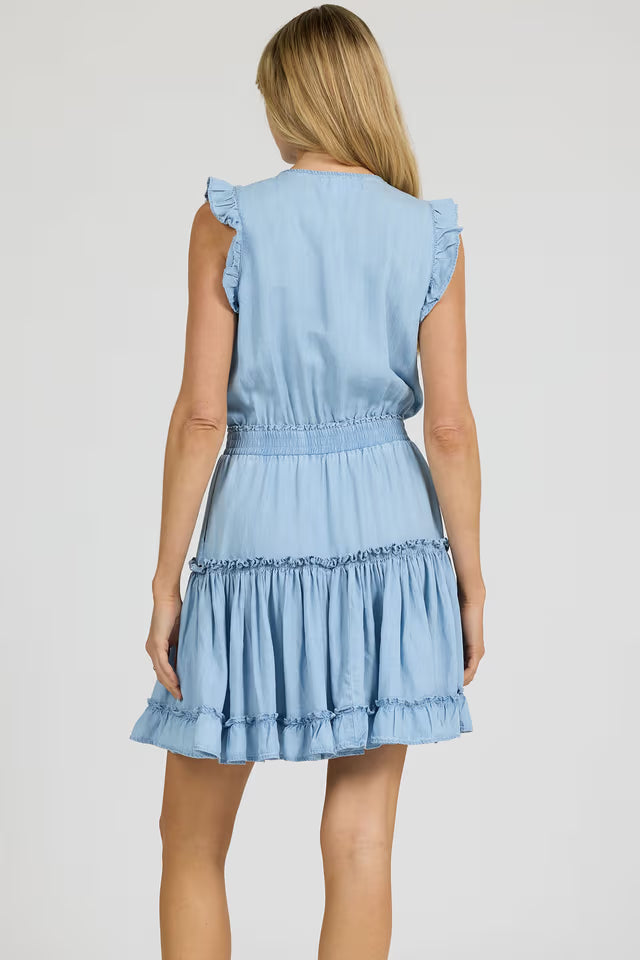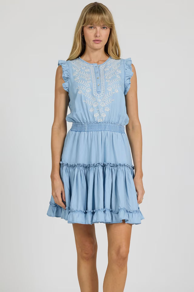 Embrace effortless elegance with this button front sleeveless embroidery dress in a charming Carolina blue color.