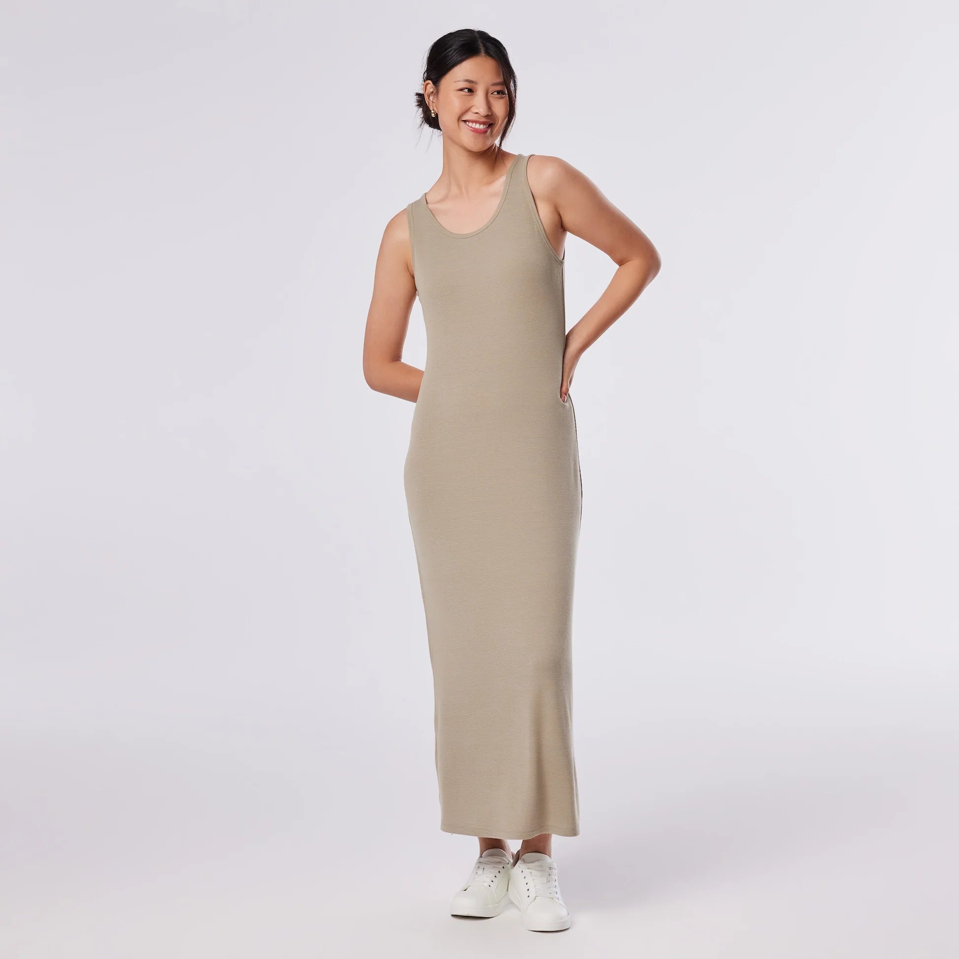The Ribbed Maxi Dress brings cool confidence to your everyday. Featuring a flattering scoop neck, sleeveless design, and 7/8 length, this fitted style is perfect for your active life.