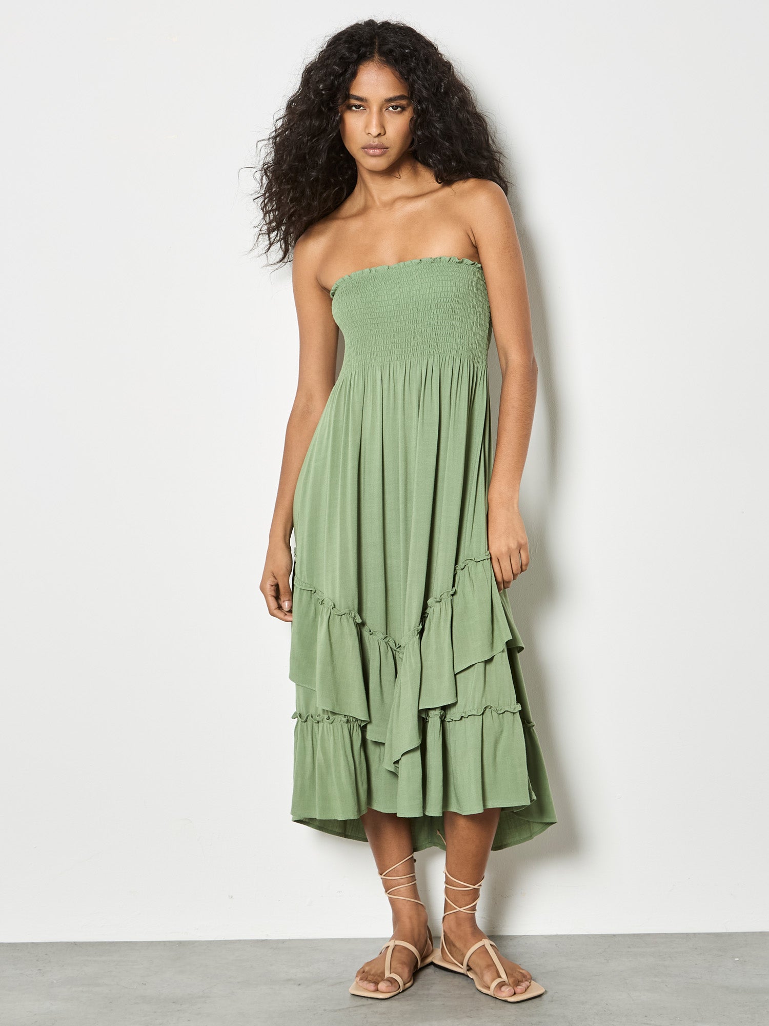 Tap into the boho chic trend with this must-have midi dress. Designed in a woven fabric, it features a smocked bandeau bodice for a flattering fit and tiered layers to create a free-flowing silhouette. Style this tiered midi dress with cowboy boots and layered necklaces for a festival-ready outfit.