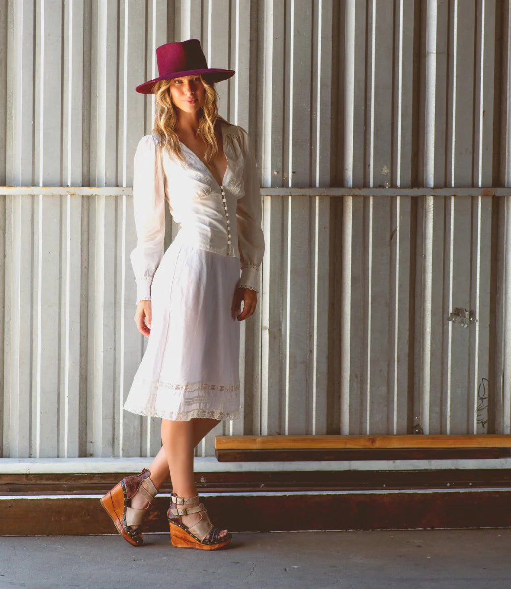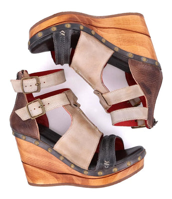 Princess is a remarkable fusion of precision and artistic design. The sustainable wooden wedge not only assures stability but also embodies eco-consciousness with grace. Meticulously woven strappy uppers accentuate both aesthetics and structural integrity in a seamless embrace. The double ankle buckle system offers adjustability, complemented by brass metal studs for both style and strength.