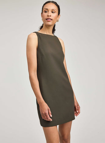 The Etta dress is made of a crepe suiting fabric and is fully lined for ease of wear. Features include a boat neckline and invisible zipper closure.
