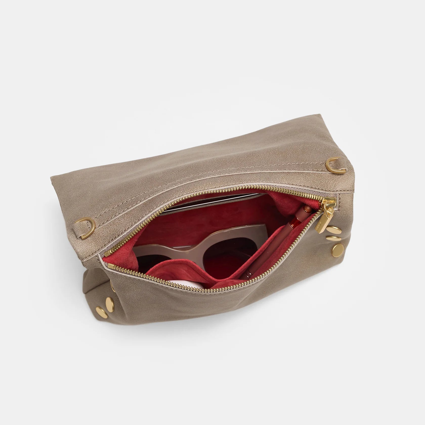 Because you're a VIP. Our all-time best-seller, this VIP in pewter leather features an optional strap and elevated brushed gold rivets. Plus, you'll find a subtle strip of luxe red peeking out along the bag's back seam. We're classy like that.