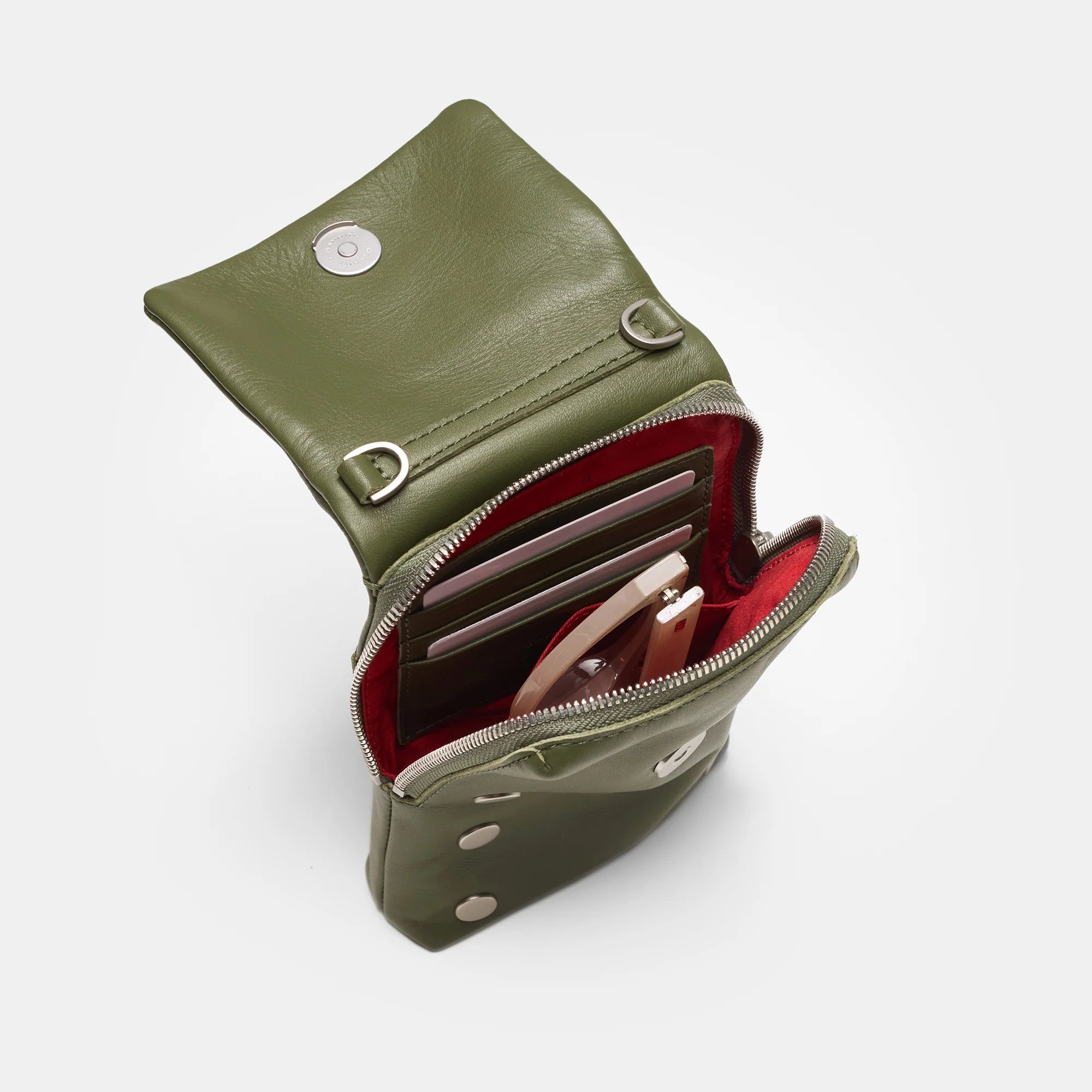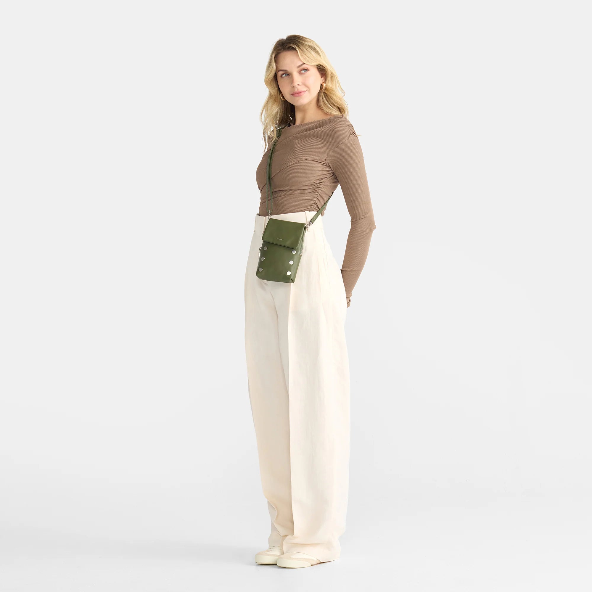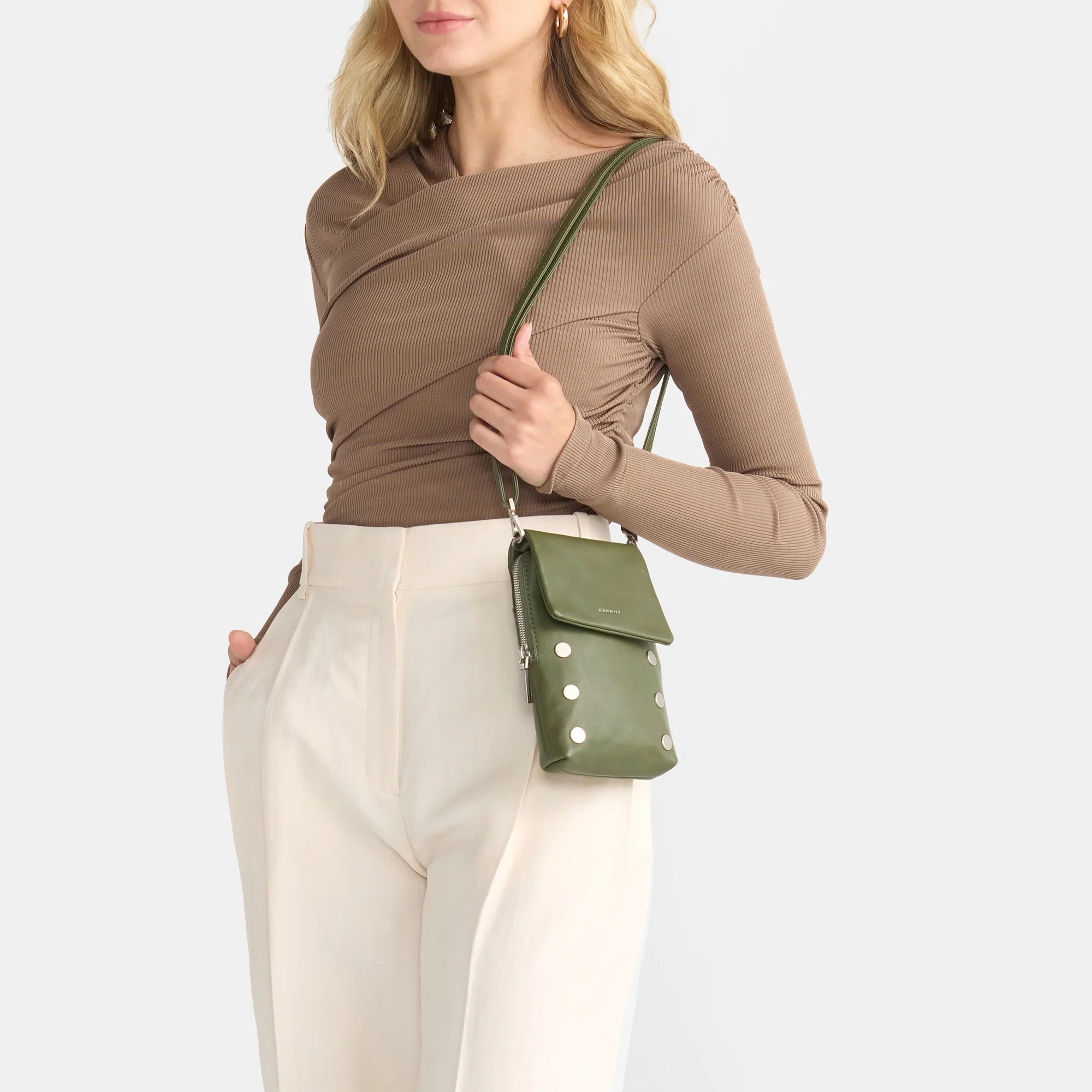 - Crafted with a smooth, warm olive leather