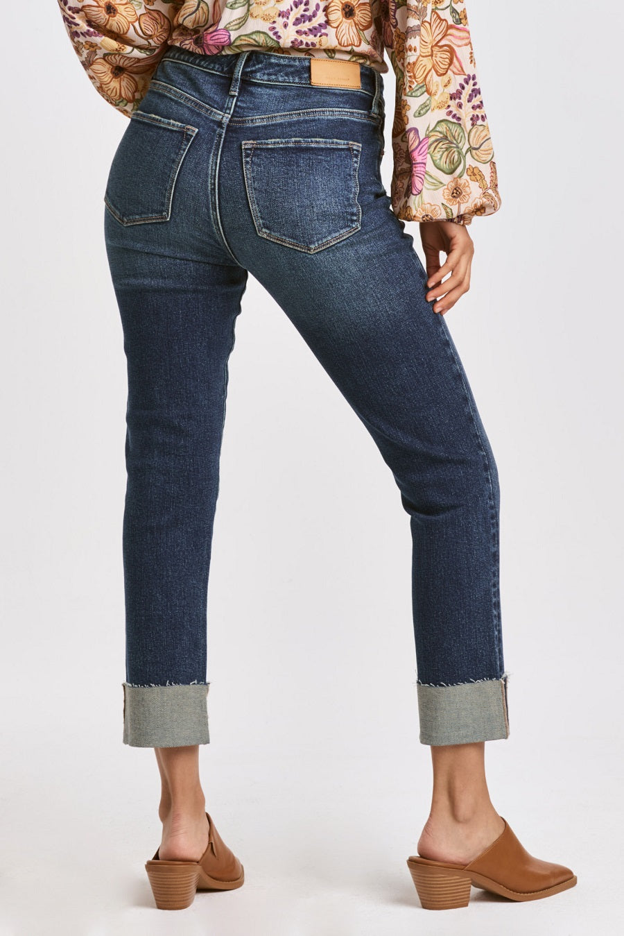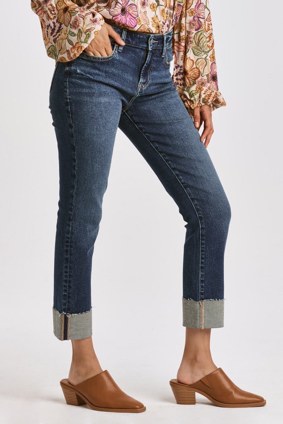 High rise cuffed slim straight leg jeans. The standout fit that comfortably rests slightly lower on the waist, shaping up effortlessly from the hip to mid thigh. Cuffed inseam on comfort stretch denim with touch of flair accenting hand sanding hip whiskers, random tears, pocket grinding & cut-off hem, rich indigo shade w/slubby characteristics.