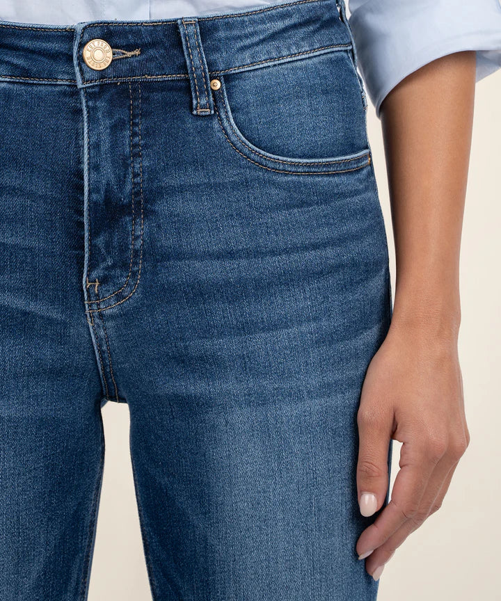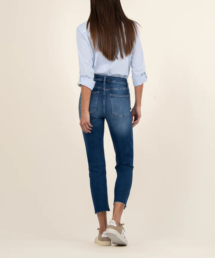 - Artfully faded for a vintage vibe, these stretchy, slim-cut jeans flatter with a dark wash with a raw hem and Fab Ab front pockets that comfortably shape and smooth.