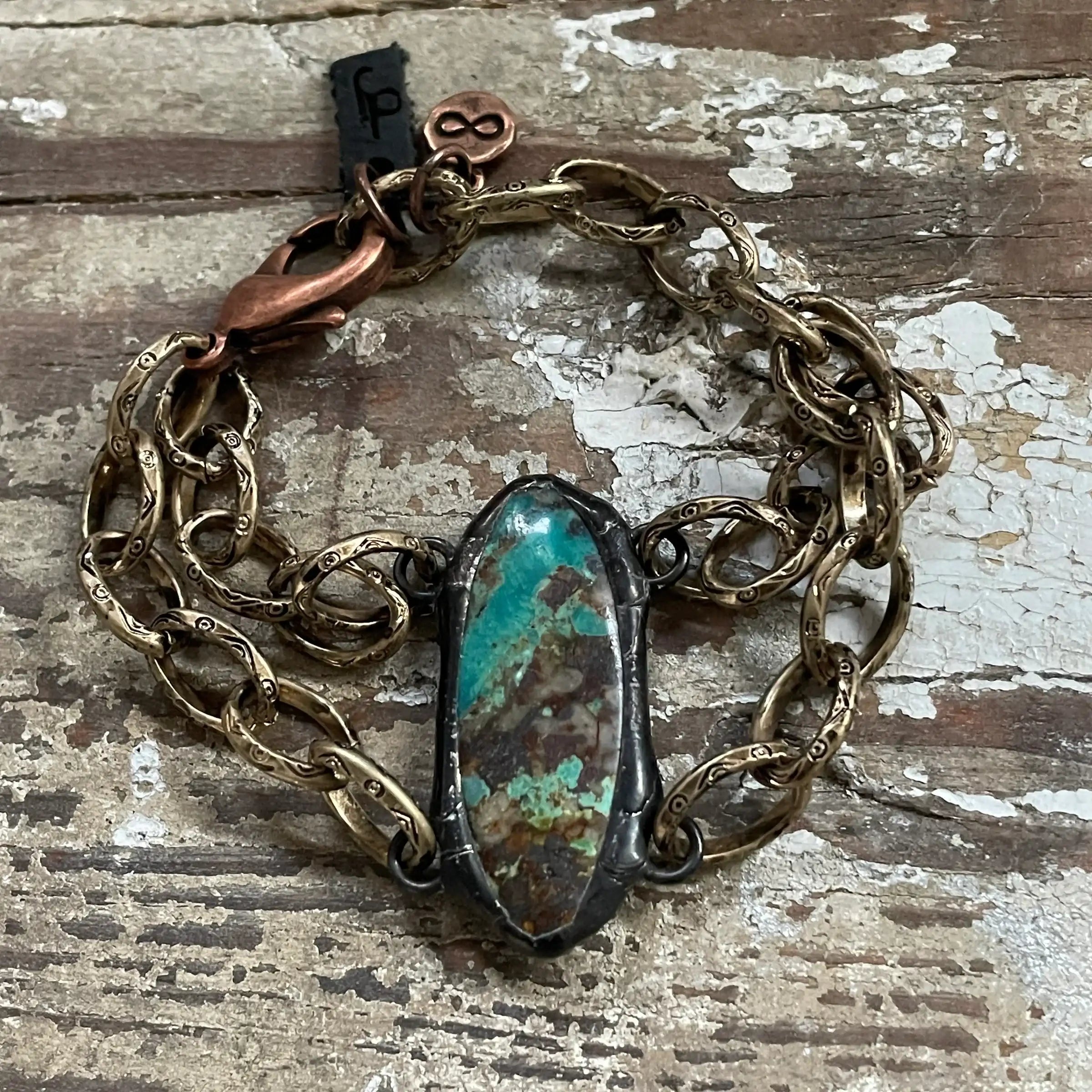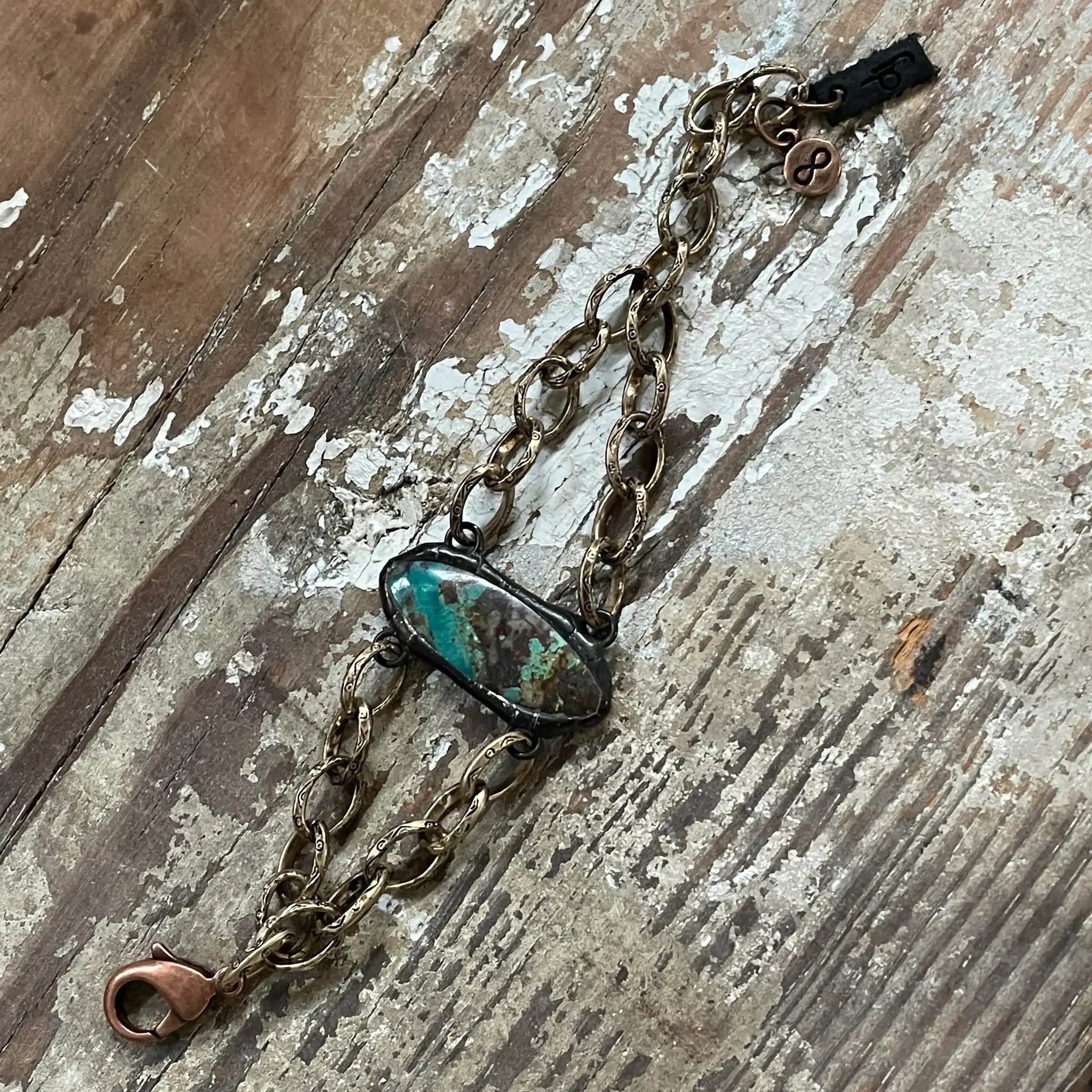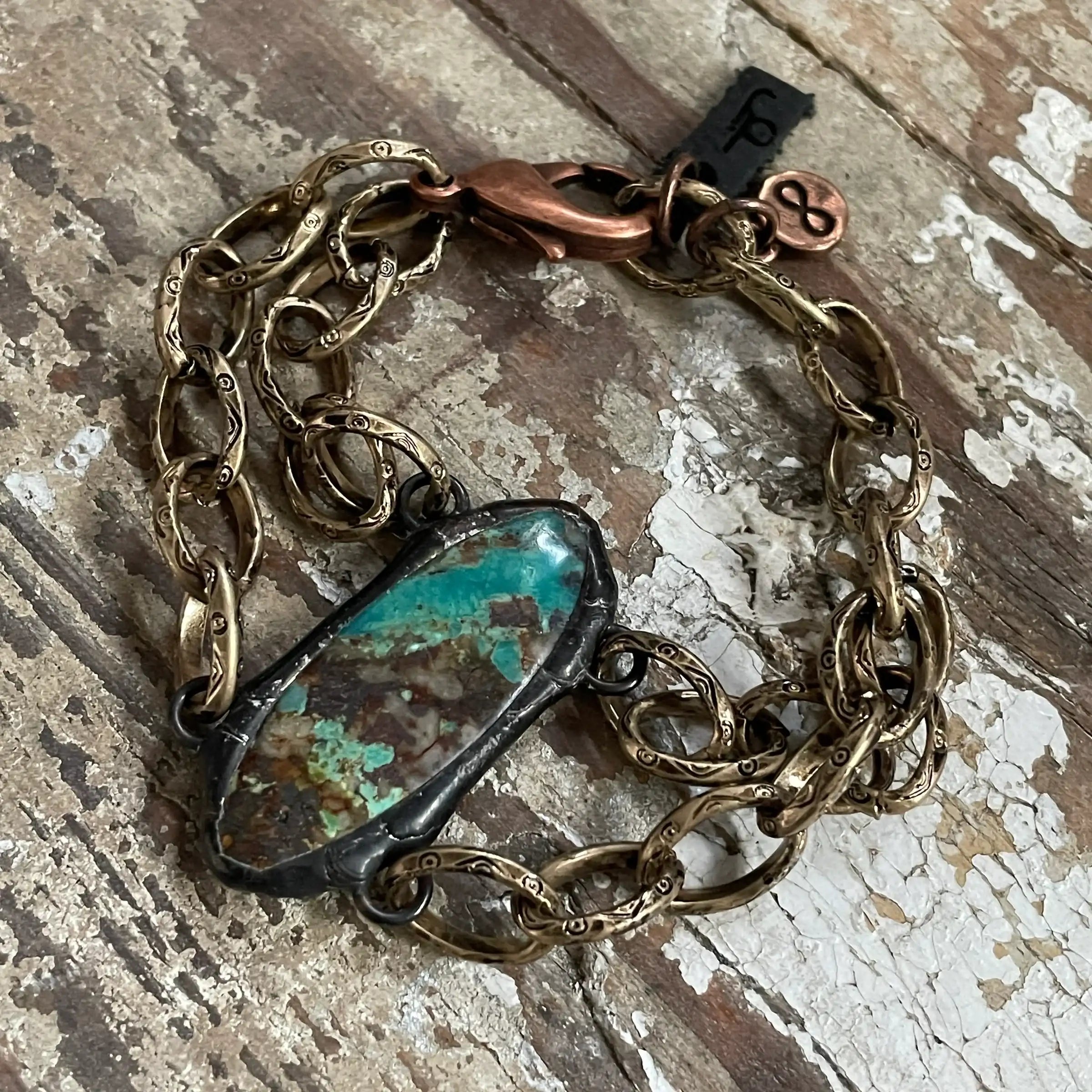 Experience the elegance and uniqueness of the Royal Rodeo Bracelet. Handcrafted by renowned designer dawn josephine. This one-of-a-kind piece features a stunning turquoise stone connected with gold chains. Elevate any outfit with this exquisite bracelet that embodies luxury and style.