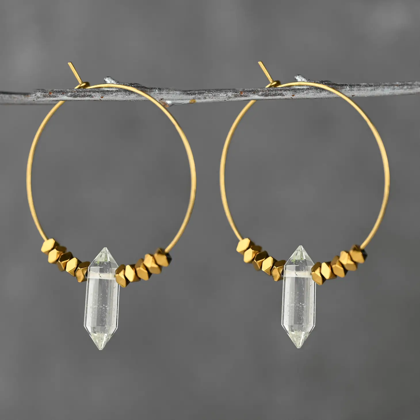 Double Pointed Crystal w/ Golden Hematite Beads Hoop Earring