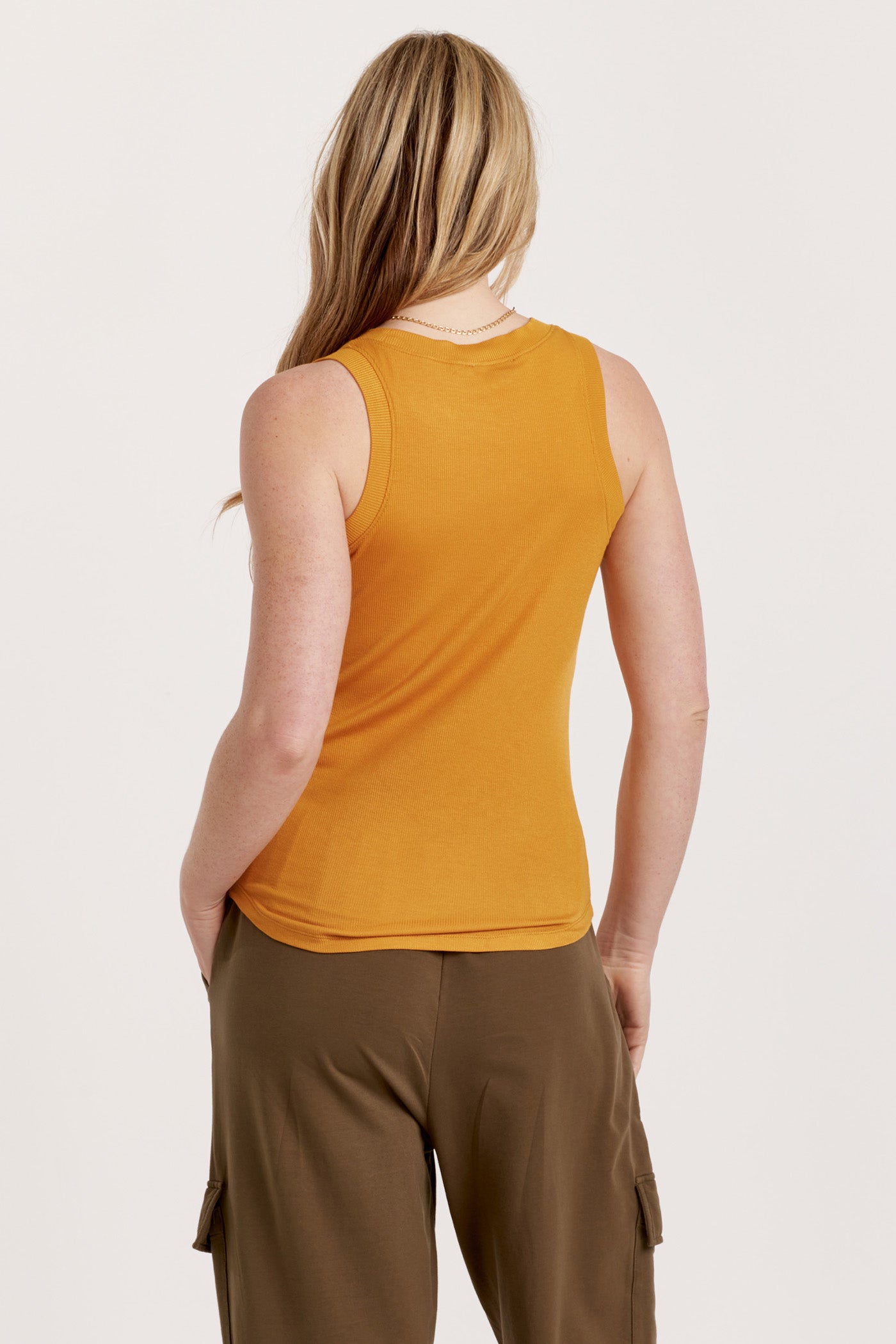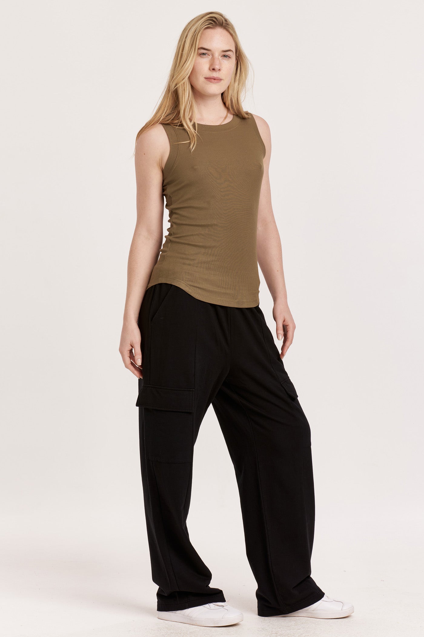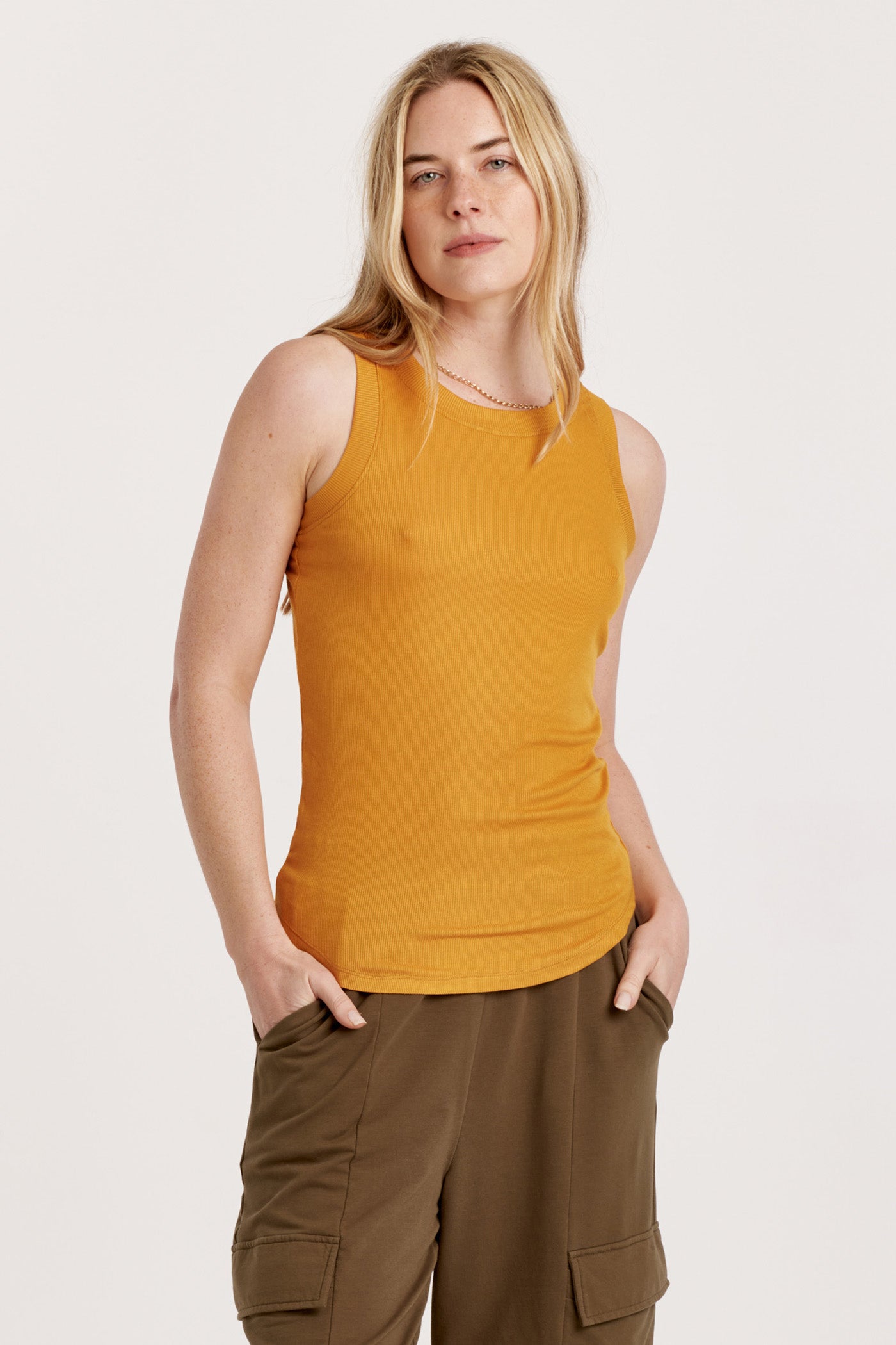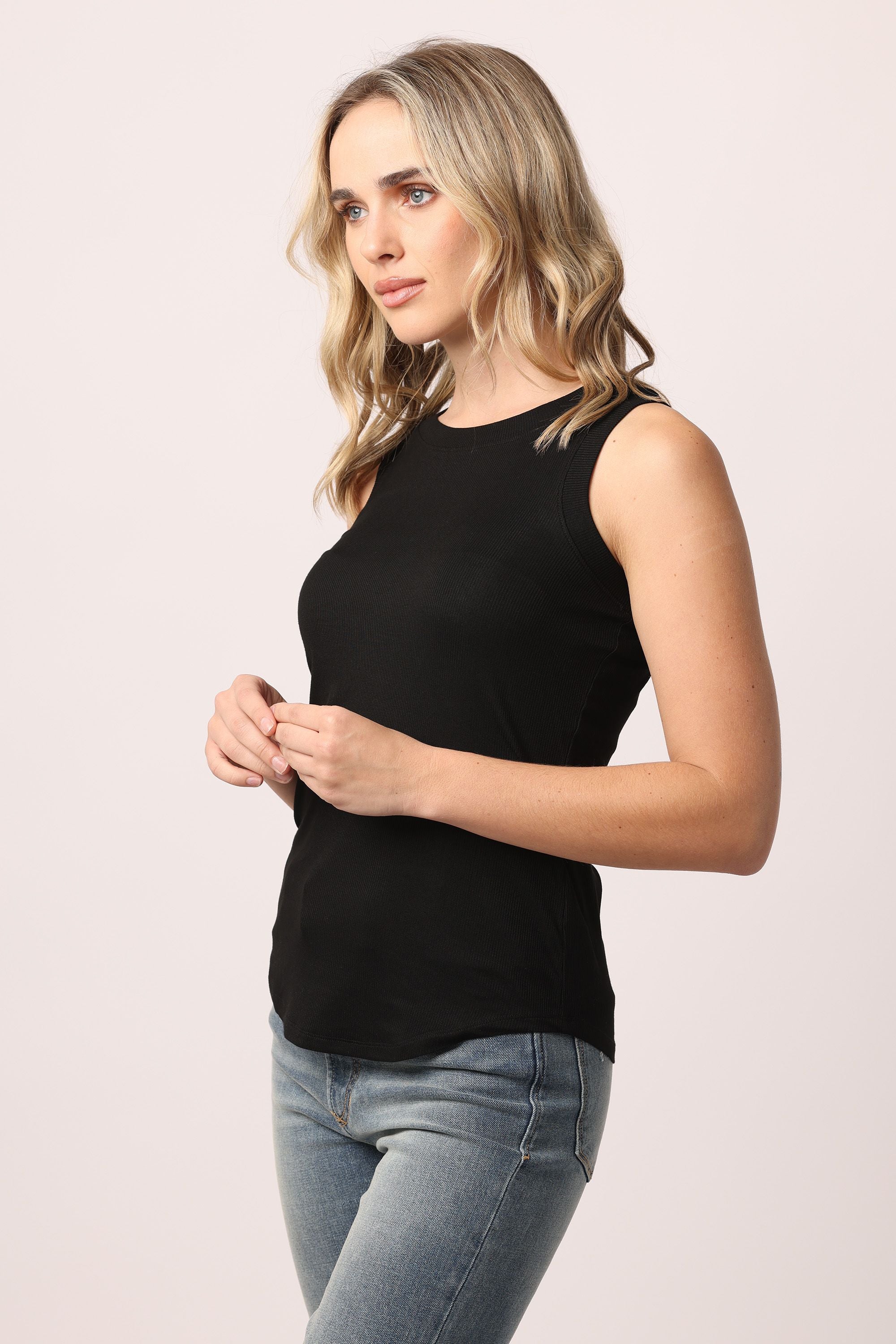 Ribbed crew neck tank finished sleeveless and curved hem. Pair with our Sparkle black straight leg pants for more of a dressy look or just relaxing at happy hour. Solid color knit fitted.
