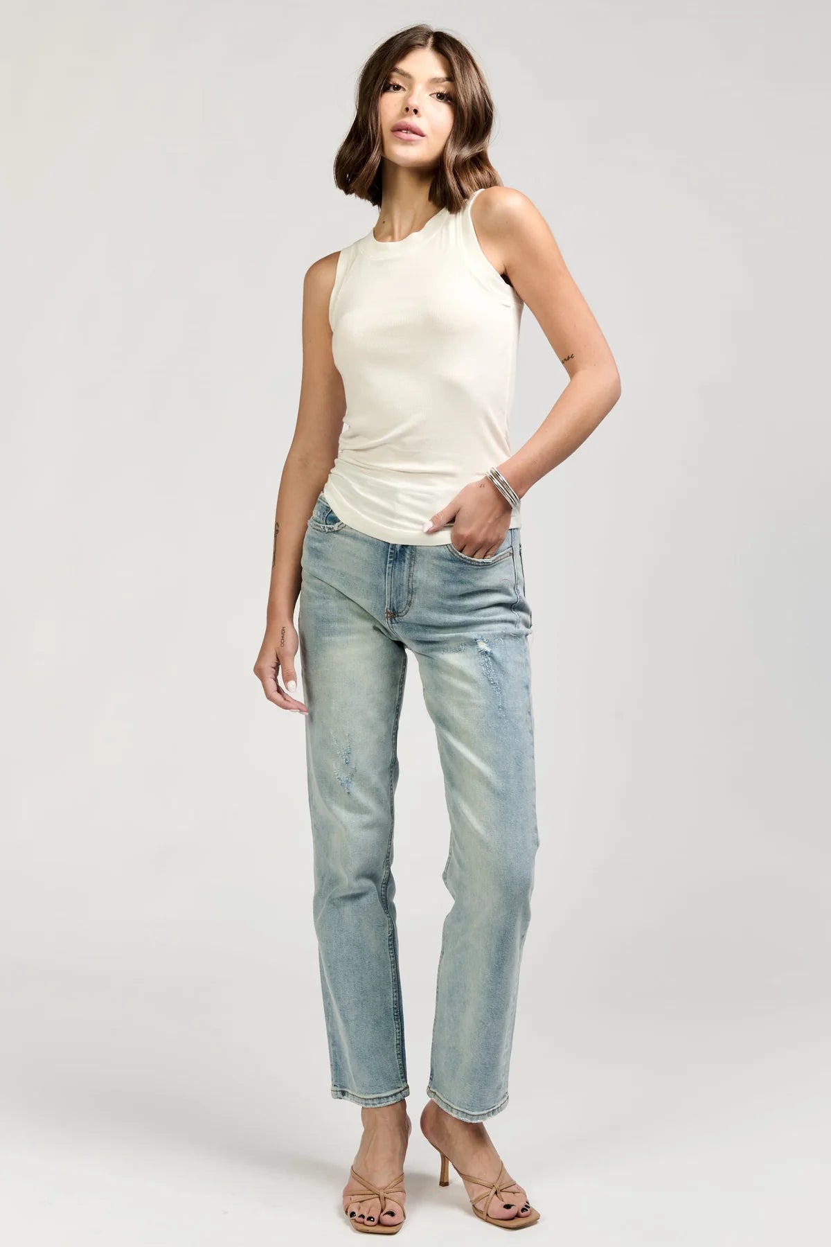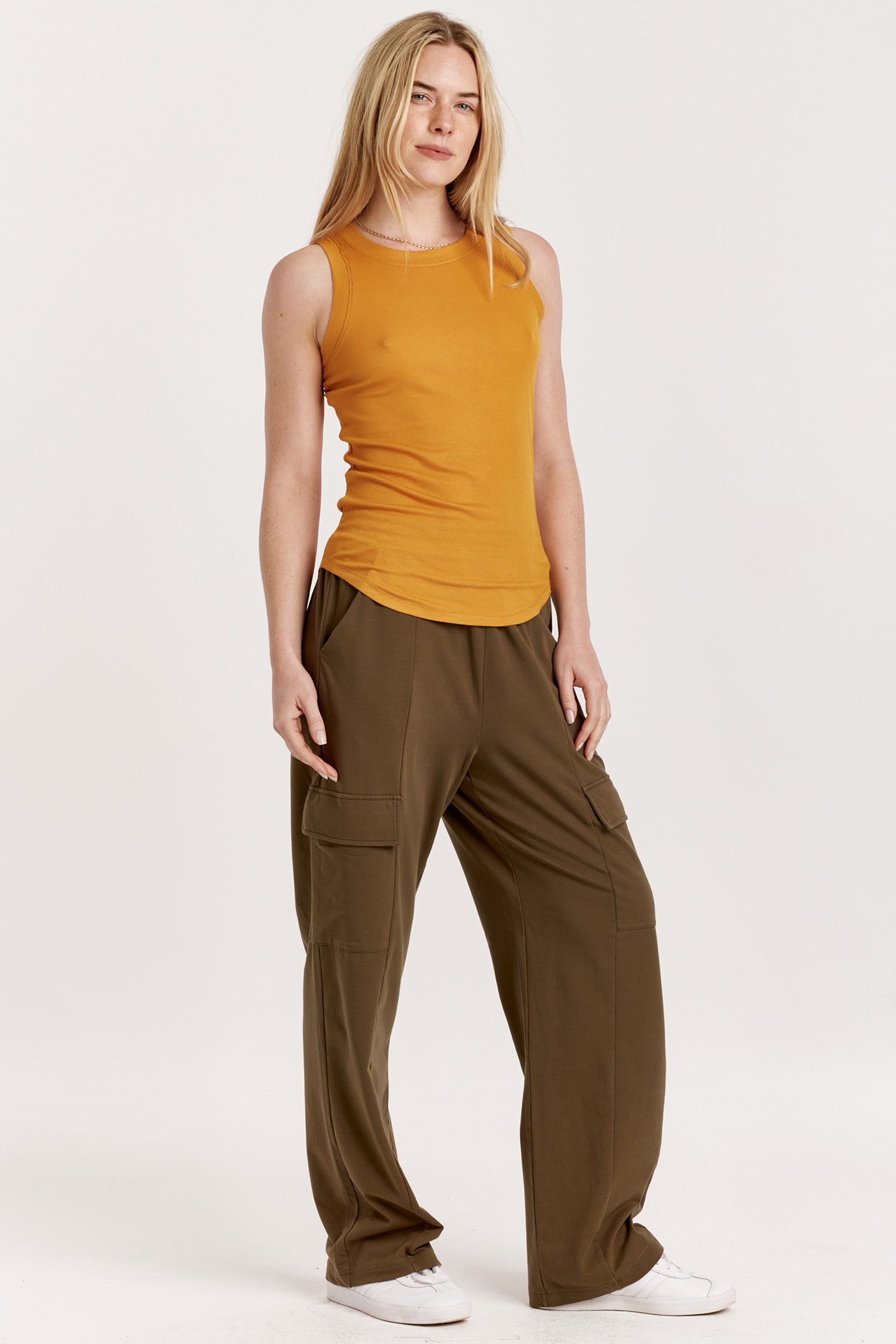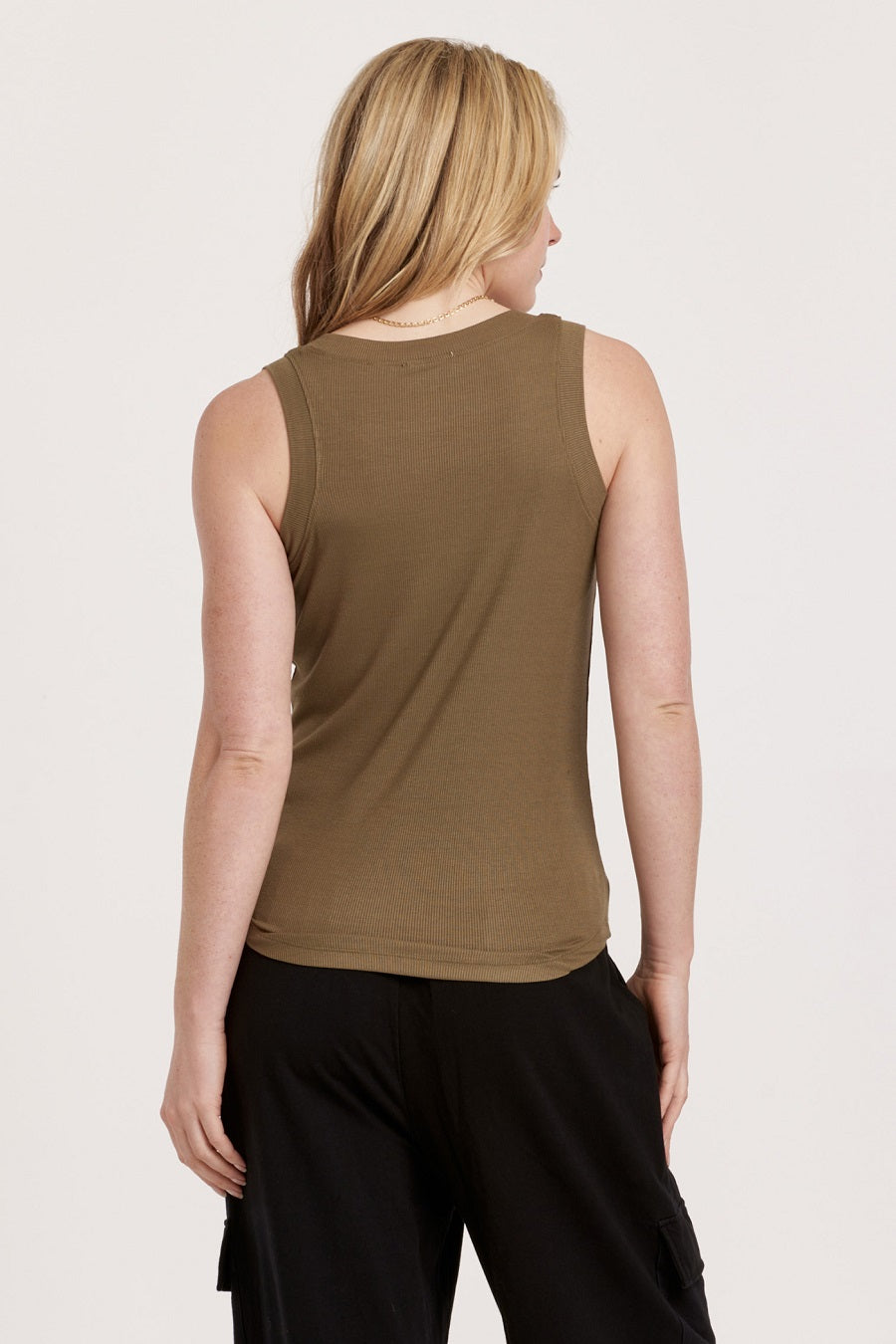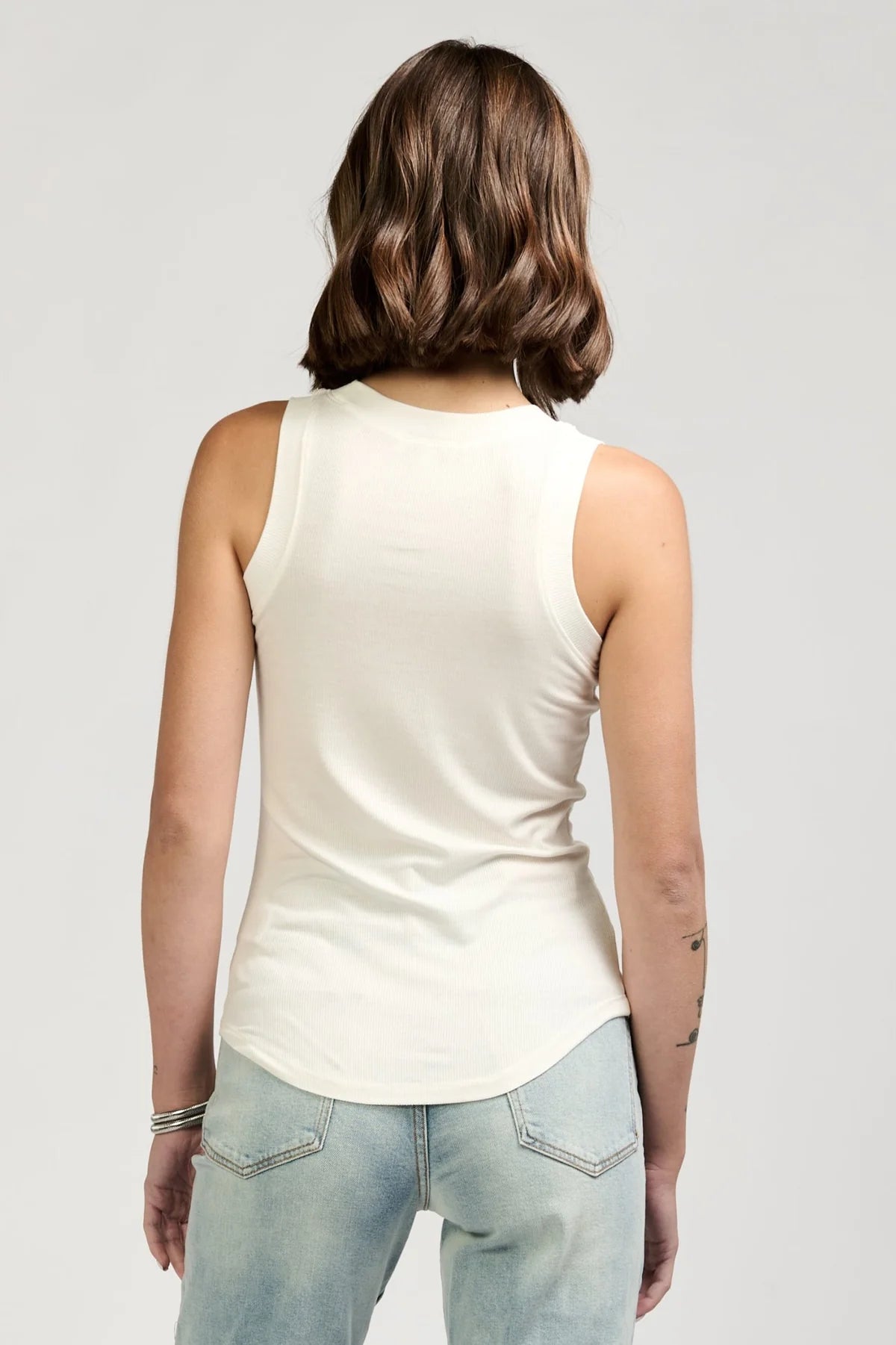 Ribbed crew neck tank finished sleeveless and curved hem. Pair with our Sparkle black straight leg pants for more of a dressy look or just relaxing at happy hour. Solid color knit fitted.