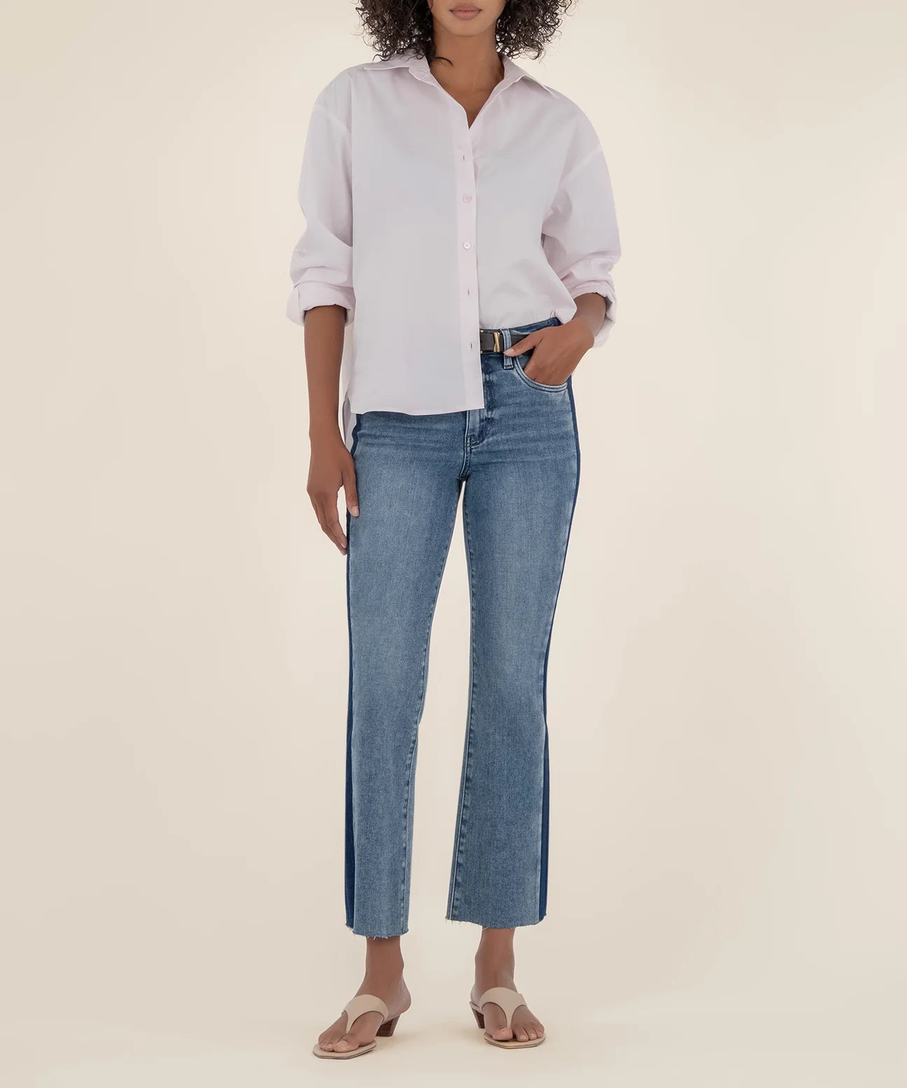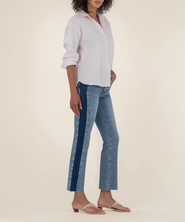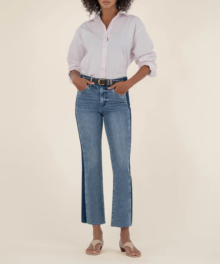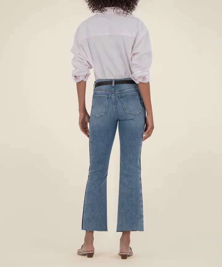 Make a bold statement with these high rise ankle flare jeans, featuring a raw hem, side inset, and eye-catching contrast detail down the sides. The dark wash adds a sleek, elevated touch to this standout style.