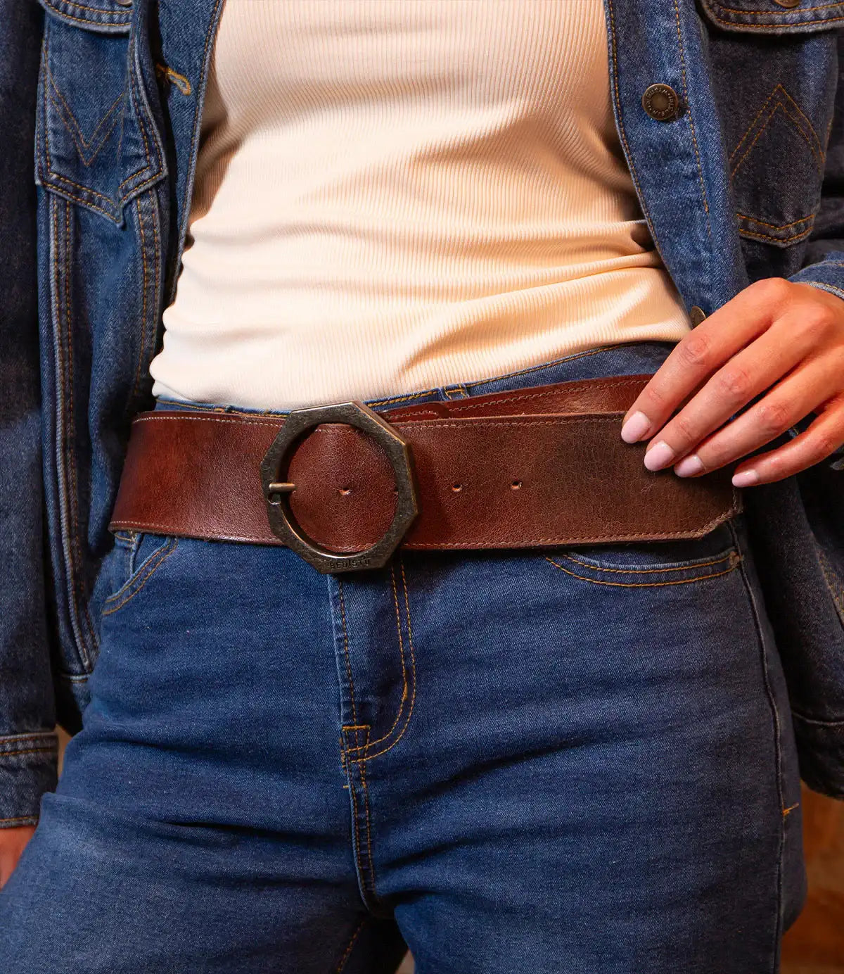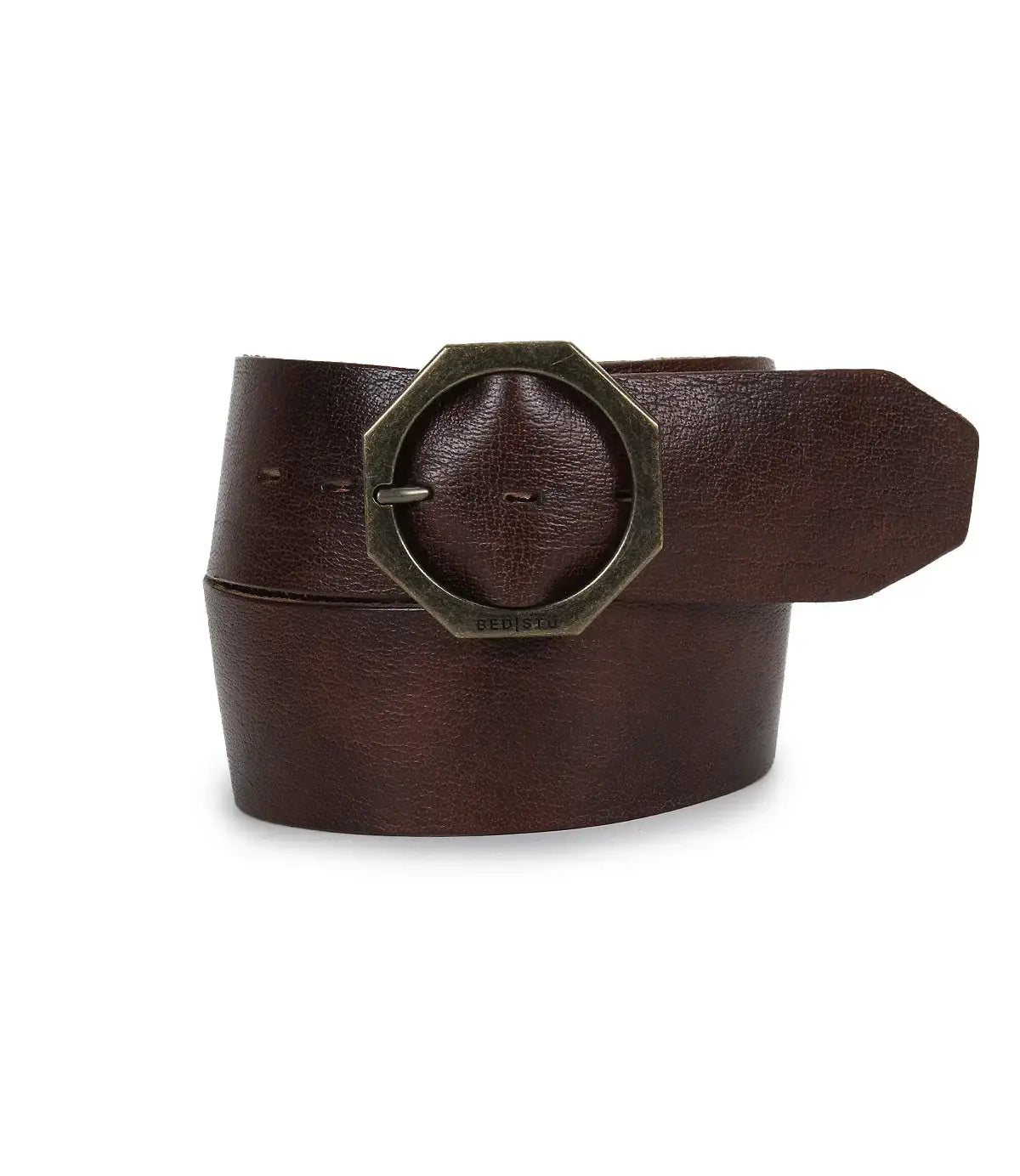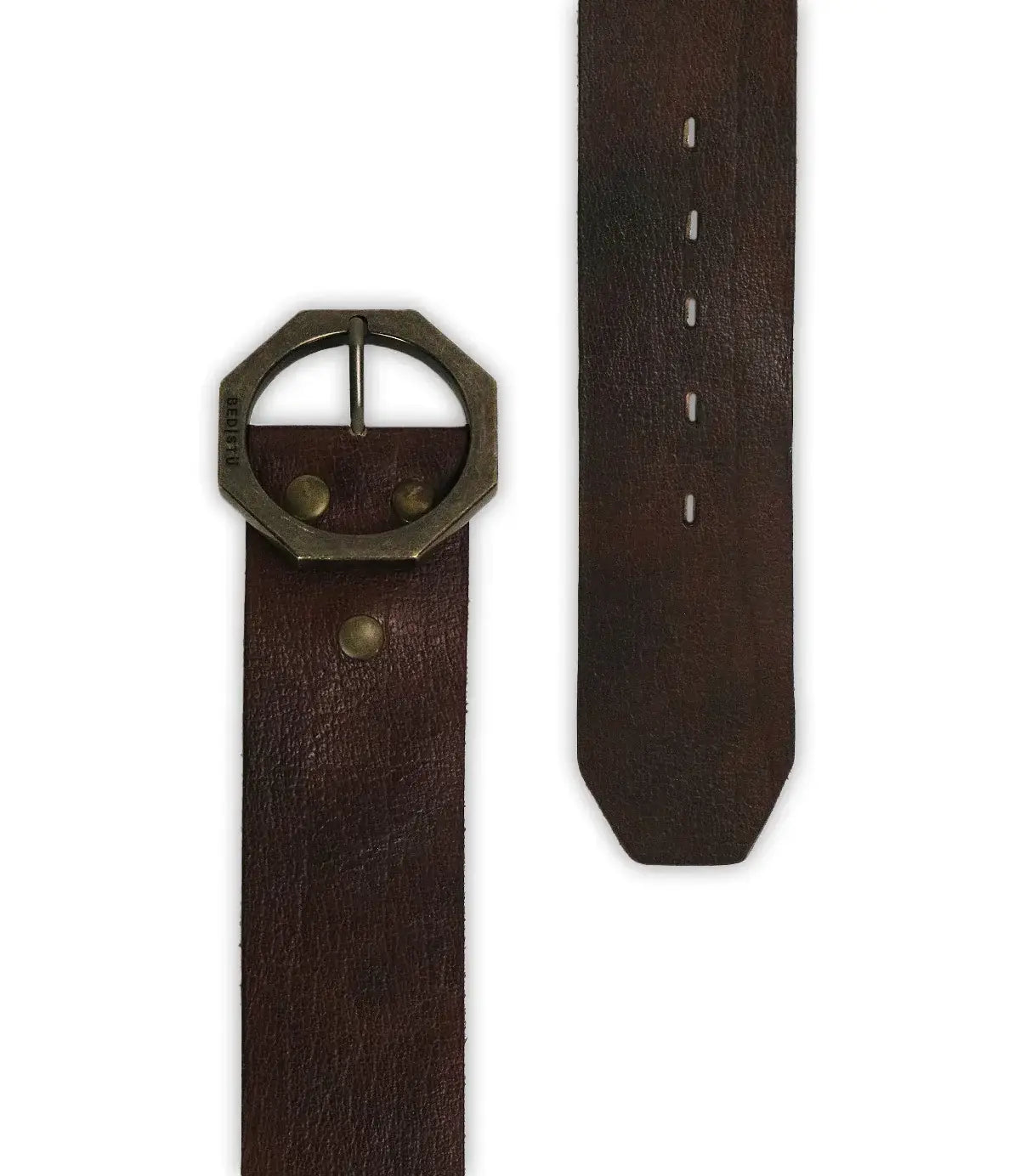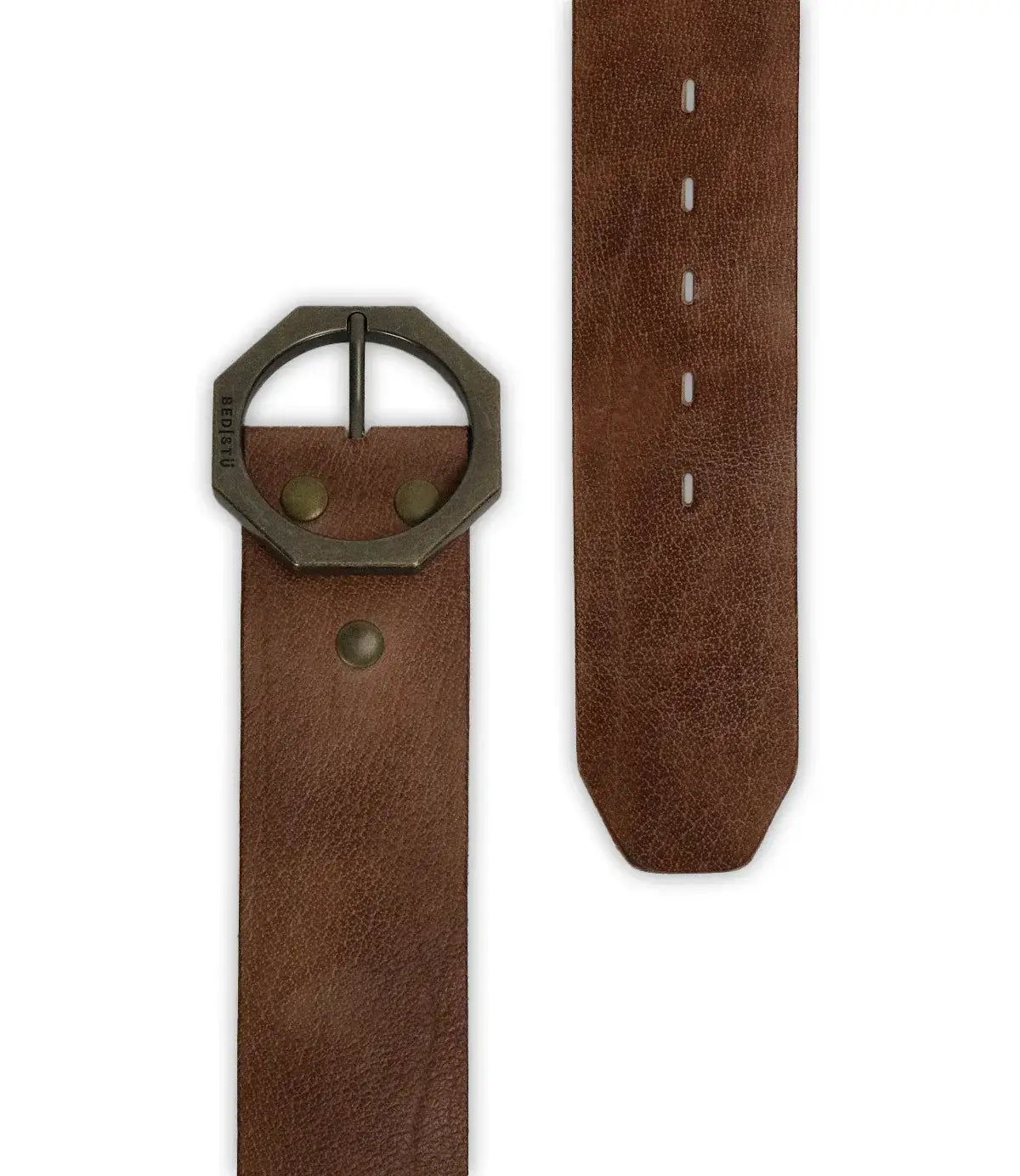 Dreampath the perfect blend of rugged durability and modern style. Crafted from genuine leather and finished with clean edge stitching, this belt is designed to make a statement. Its bold octagon-shaped metal buckle, stamped with the BED|STÜ insignia and reinforced with three oversized rivets, delivers an edgy yet refined look. Built to last and elevate every outfit.