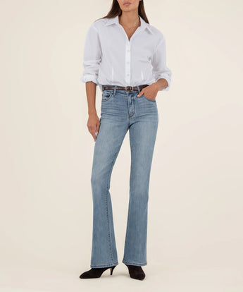 - Elevate your style with these high-rise flare pants featuring Fab Ab fit for a flattering silhouette. Crafted in a medium wash with very stretchy material, they offer all-day comfort and a sleek, trendy look. Perfect for dressing up or down, these pants are a versatile wardrobe essential.