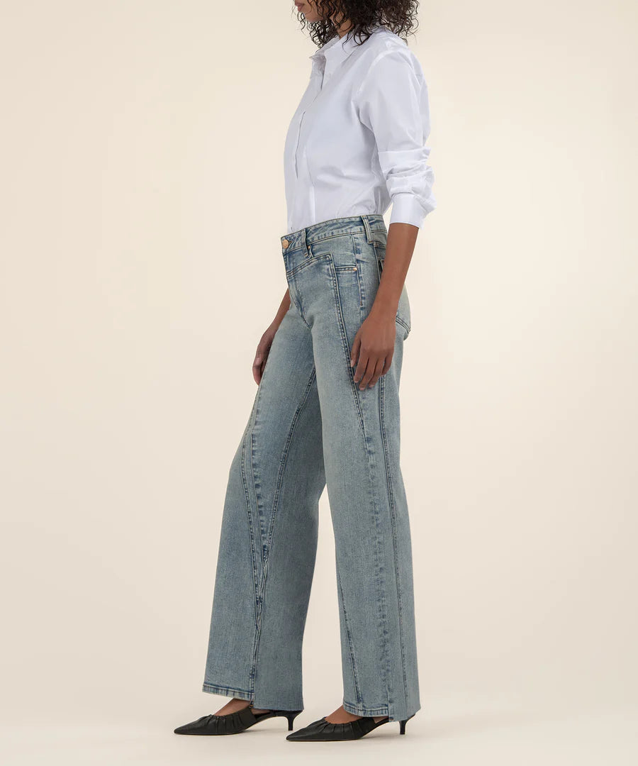 • These high-waisted, wide-leg jeans showcase a unique paneled design, featuring clean-finished front hems and raw, textured hems at the back for a modern, stylish touch.