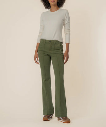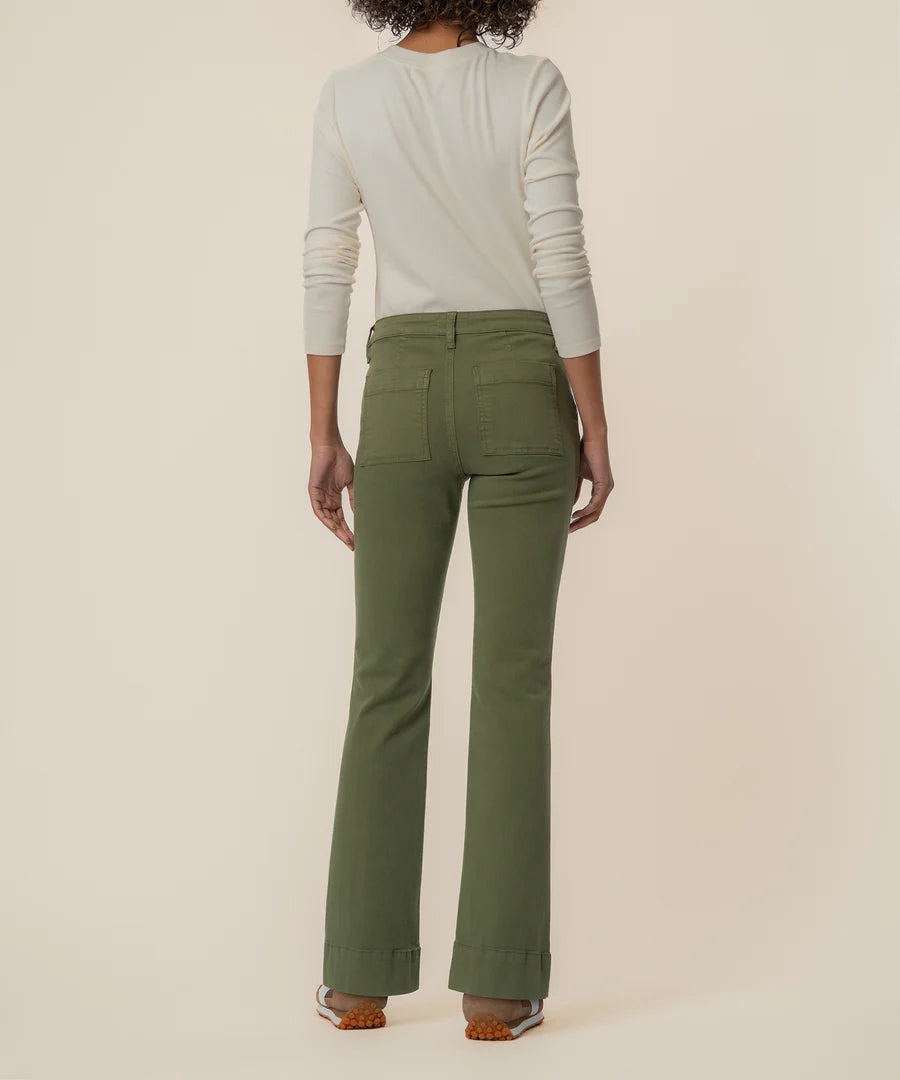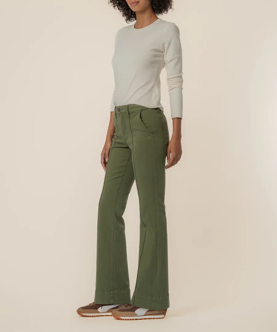 - Step into effortless style with these high rise flare jeans in a unique dill color. Featuring Fab Ab pockets for a flattering fit and front pin tuck details that elongate the legs, these jeans are crafted from super stretchy fabric for ultimate comfort. A perfect blend of bold color and flattering design, ideal for elevating your everyday wardrobe.