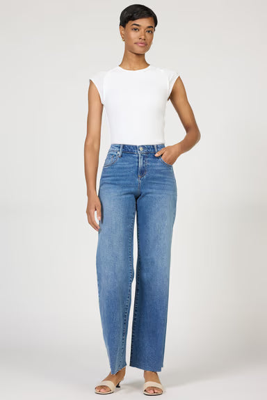 The Skagway arrives in a versatile medium wash denim featuring a fashion-forward raw hem for an edgy flair.
