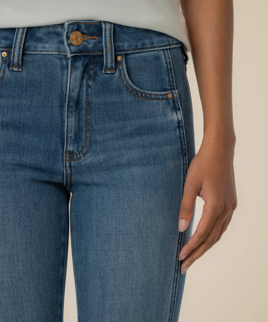 - Flattering and flexible, these high rise bootcut jeans are a perfect blend of comfort and style. Designed with a unique side inset and a wide hem, they create a leg-lengthening silhouette that feels both modern and timeless. The medium wash adds a classic touch, while the super stretchy material ensures a smooth, comfortable fit that moves with you all day.