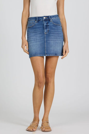 High rise clean hem mini skirt in a dark wash hue offer a stylish and comfortable fit for any occasion.