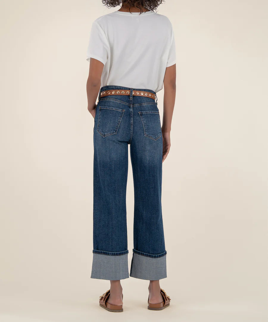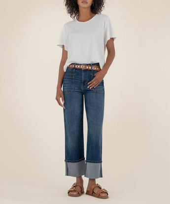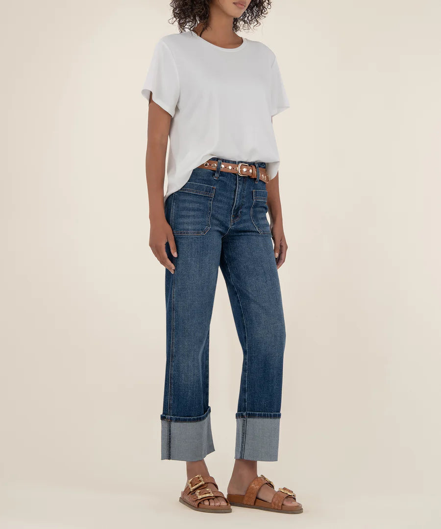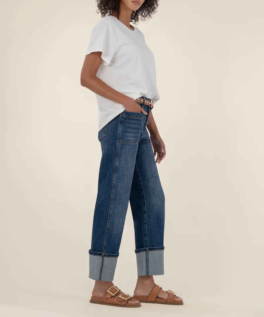 - Timeless meets modern in these high-rise straight leg Jeans in a classic dark wash. Designed with flattering patch pockets and casual roll-up hems, they offer effortless style and everyday comfort. The straight leg cut creates a clean, streamlined look perfect for dressing up or down.