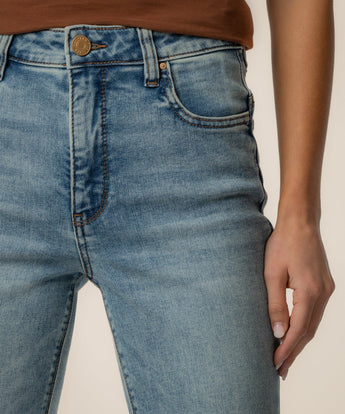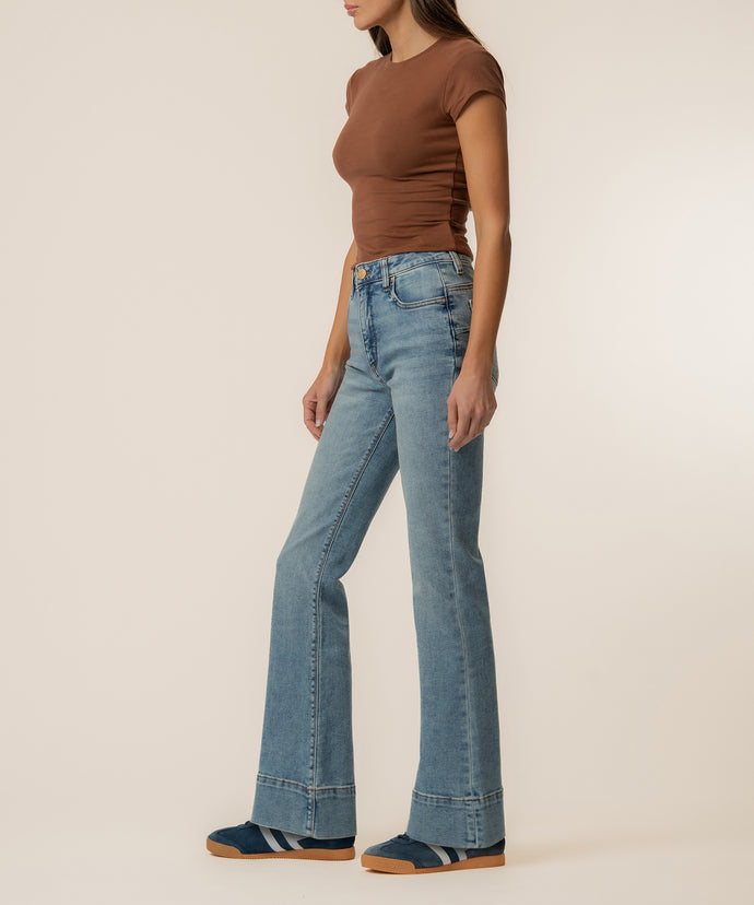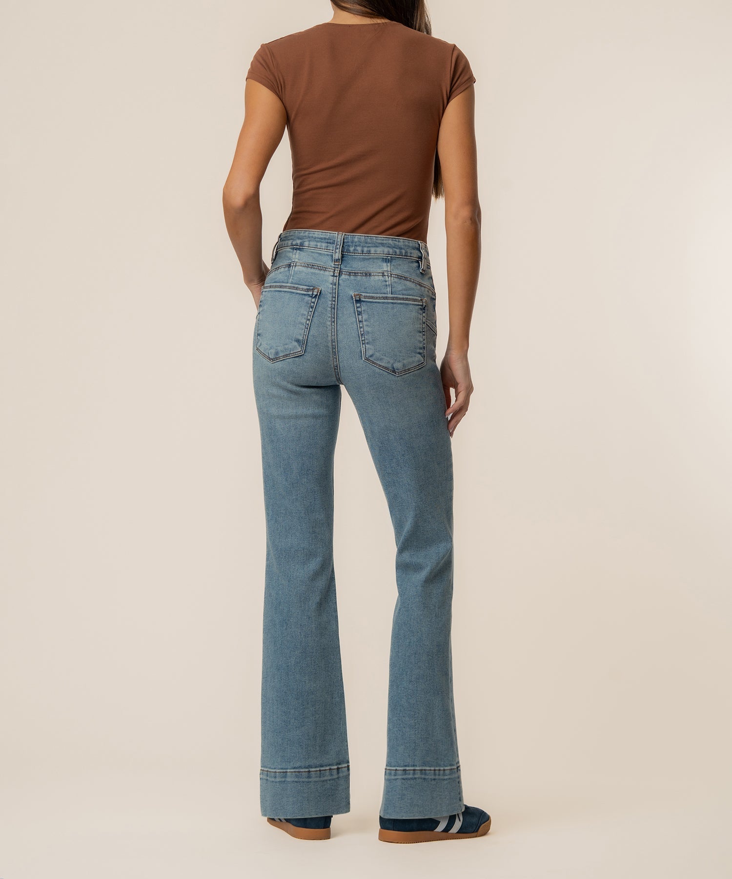- Make a statement in these high-rise flare jeans, designed to flatter and elongate. Featuring built-in Fab Ab pockets for a smooth, supportive fit, they combine style with confidence-boosting comfort. The dramatic flare silhouette flows into a bold wide hem for a modern, leg-lengthening finish. Crafted from very stretchy material and finished in a versatile medium base wash, these jeans deliver all-day comfort with standout style.