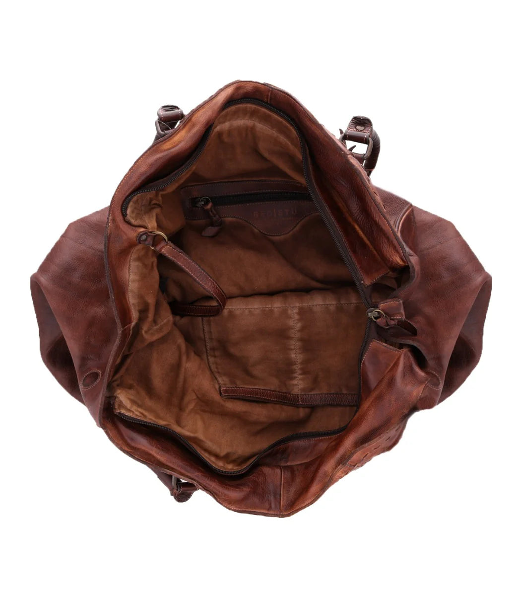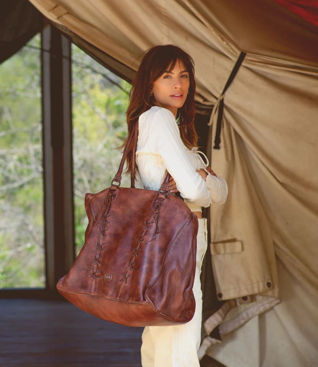 Headed home for the holidays? Have a creative career which requires lugging materials or samples? We have the bag for you. REBEKAH is a giant tote bag with a very roomy interior for all the things to bring in one trip. REBEKAH is cotton lined with one zipper pocket, and two small slip pockets, also has a key fob attached. A zip-top closure will keep contents secure, padded shoulder straps keep this giant bag from being painful and an outer zipper pocket is convenient for phone or sunglasses anything needed in a rush. REBEKAH has beautiful x inlays up the front panel and has reinforced handles with a tie detail, giving this tote a touch of femininity. We challenge you to fill this baby, she big, but oh so beautiful!