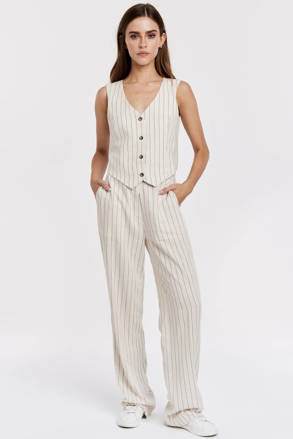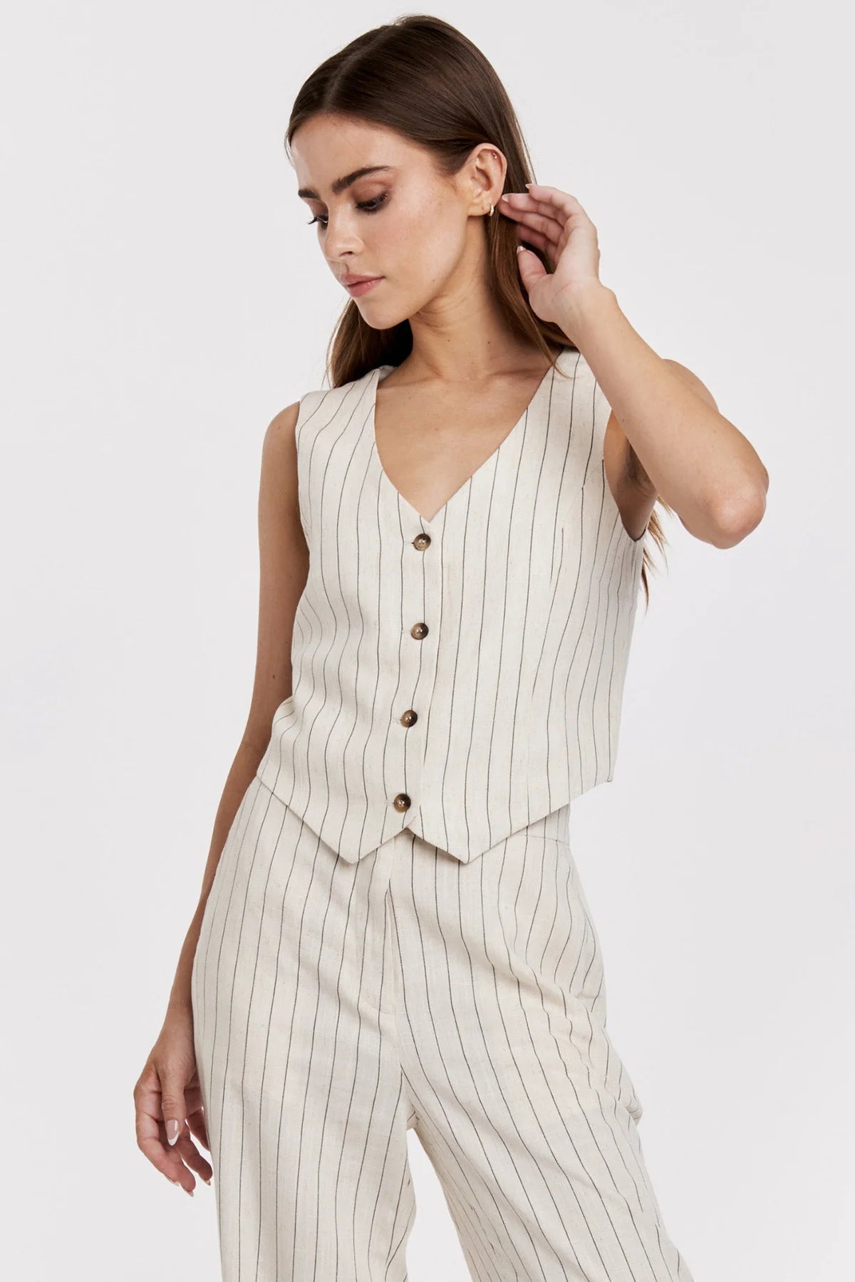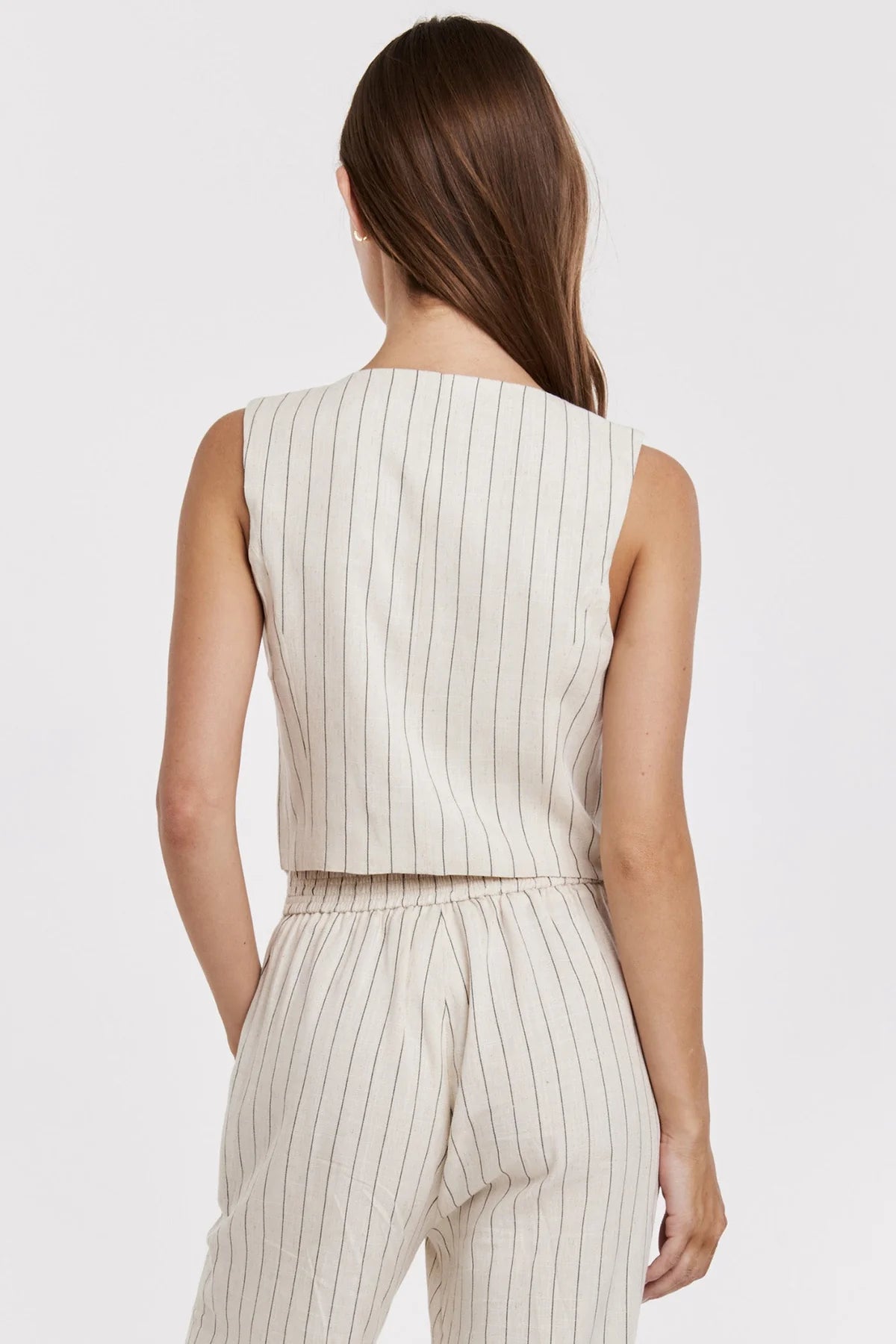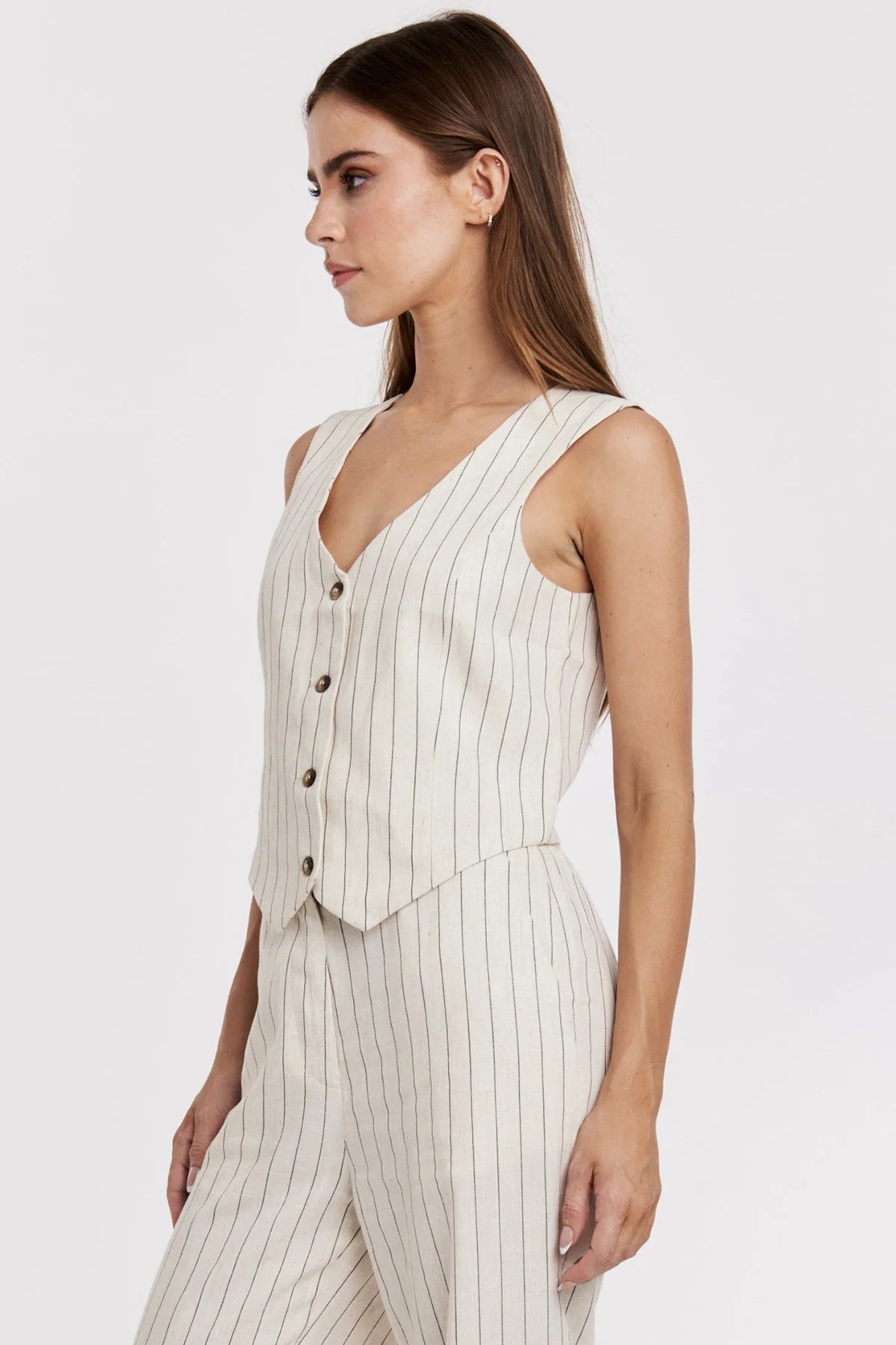 The Cecilia stripe linen fitted vest, crafted to provide ultimate comfort and style. This chic vest features a classic tailored fit, designed to accentuate your silhouette, while the classic cream and black stripe pattern adds a touch of timeless elegance. Made with draping linen and viscose fabrics, this vest ensures you are cool while maintaining a sophisticated look. Embrace the comfort yet structured fit with this vest for adaptable styling options.