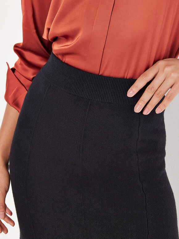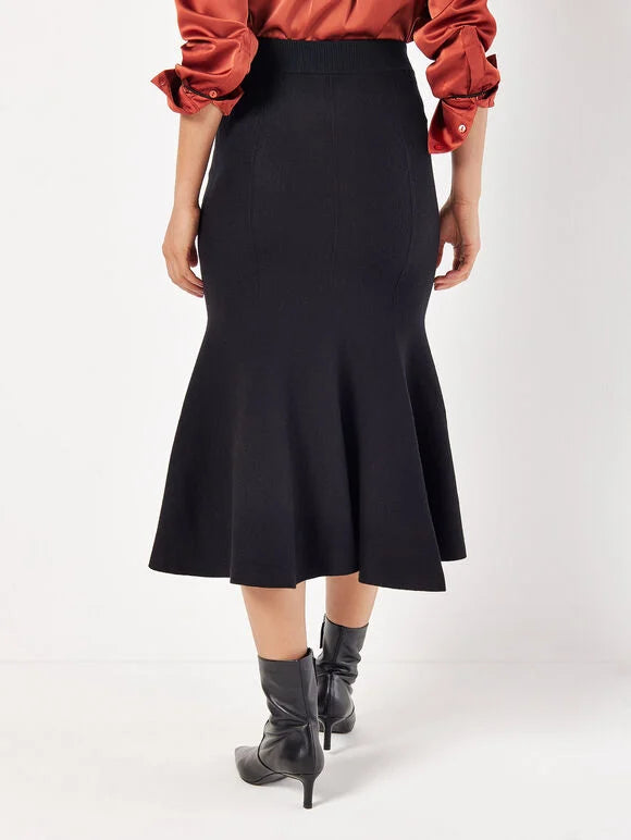 Carve a striking silhouette in this knitted midi skirt. In a figure-hugging fit, it features an elastic waist and an asymmetric flute hem.  Dress yours up or down depending on the occasion. Pair with a silk blouse for elevated on-duty dressing.