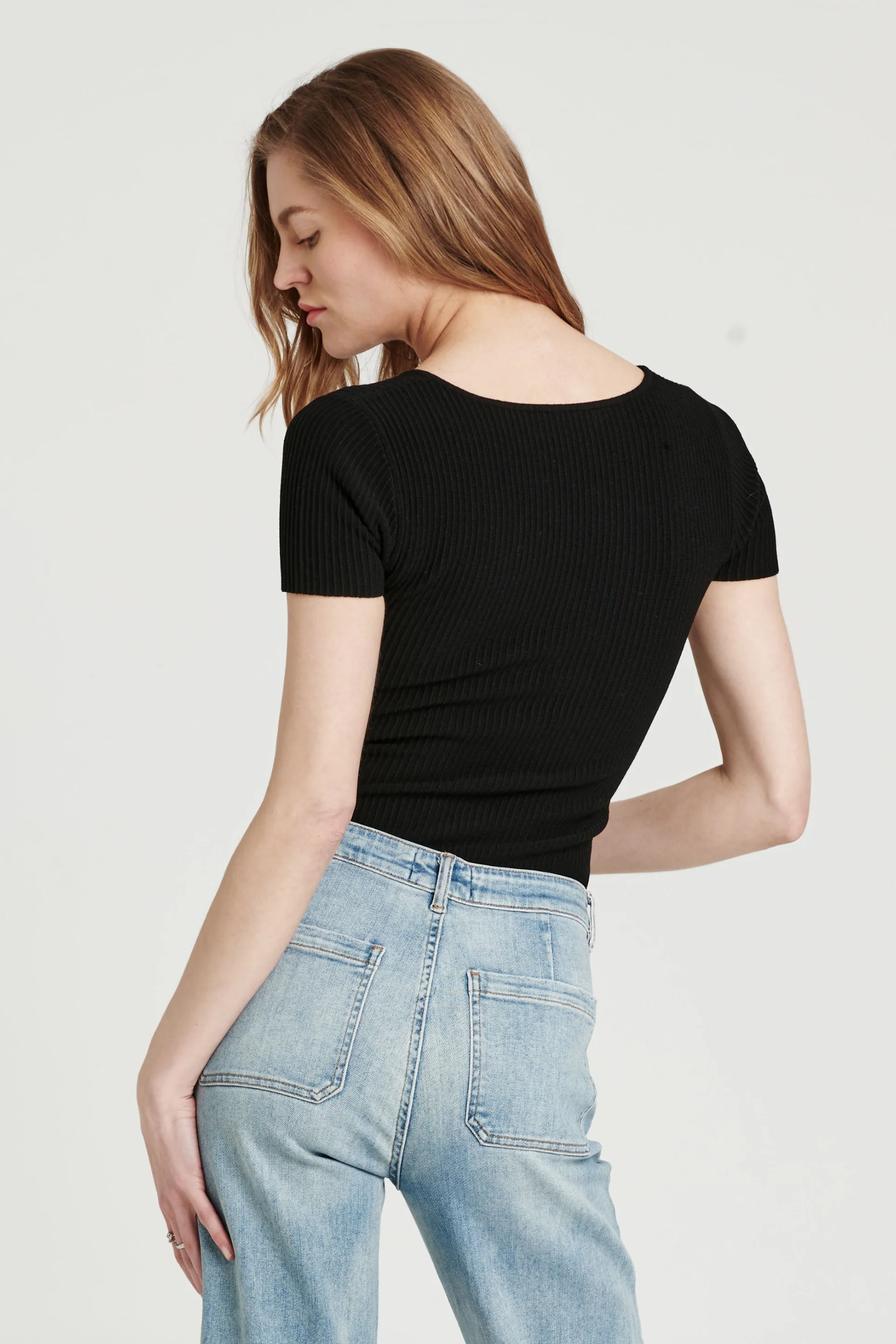 Short sleeve v-neck ribbed tee. Solid color yarn fitted. Casual with touch of sophistication.