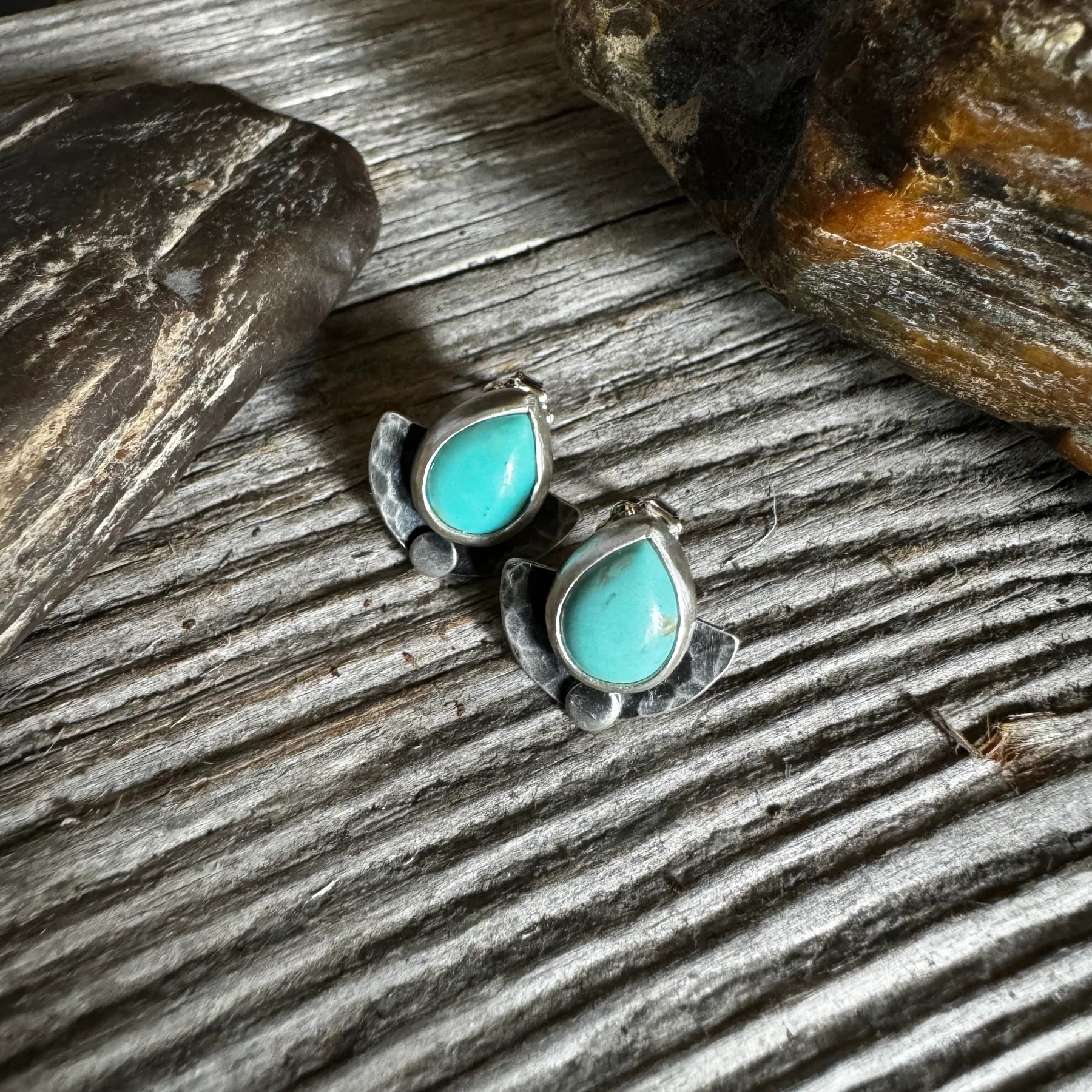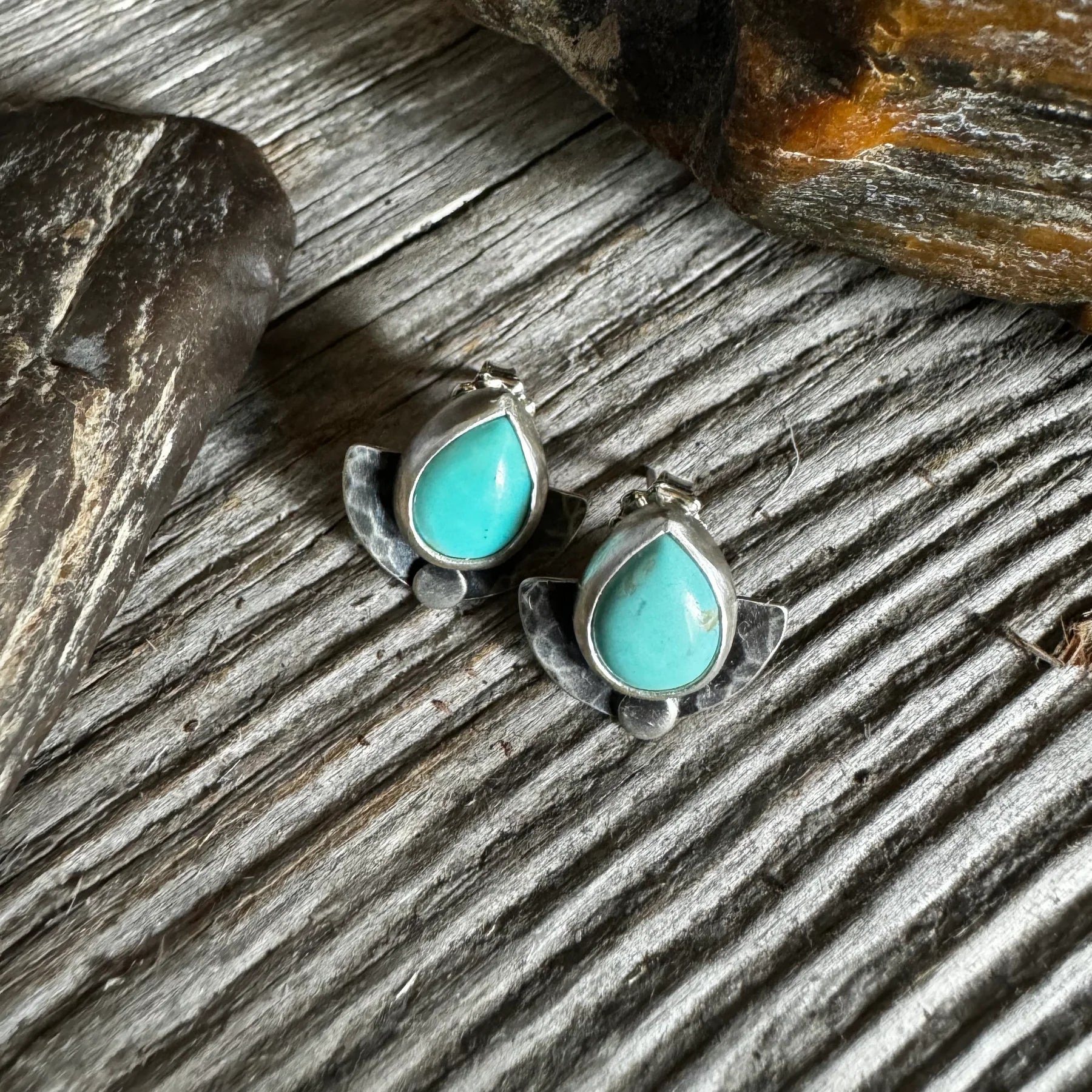 Sterling silver and 8x10 mm Kingman turquoise pears.