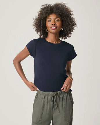The Faye Crewneck Tee is an everyday essential. This soft tee is made from Splendid's Classic Layering Knit fabric so it's finely ribbed and ultra soft. It stretches to shape to your body but bounces back to its original form. An ideal essential to wear alone or as a layering piece, this tee has a slim fit and cap sleeves for all day comfort.