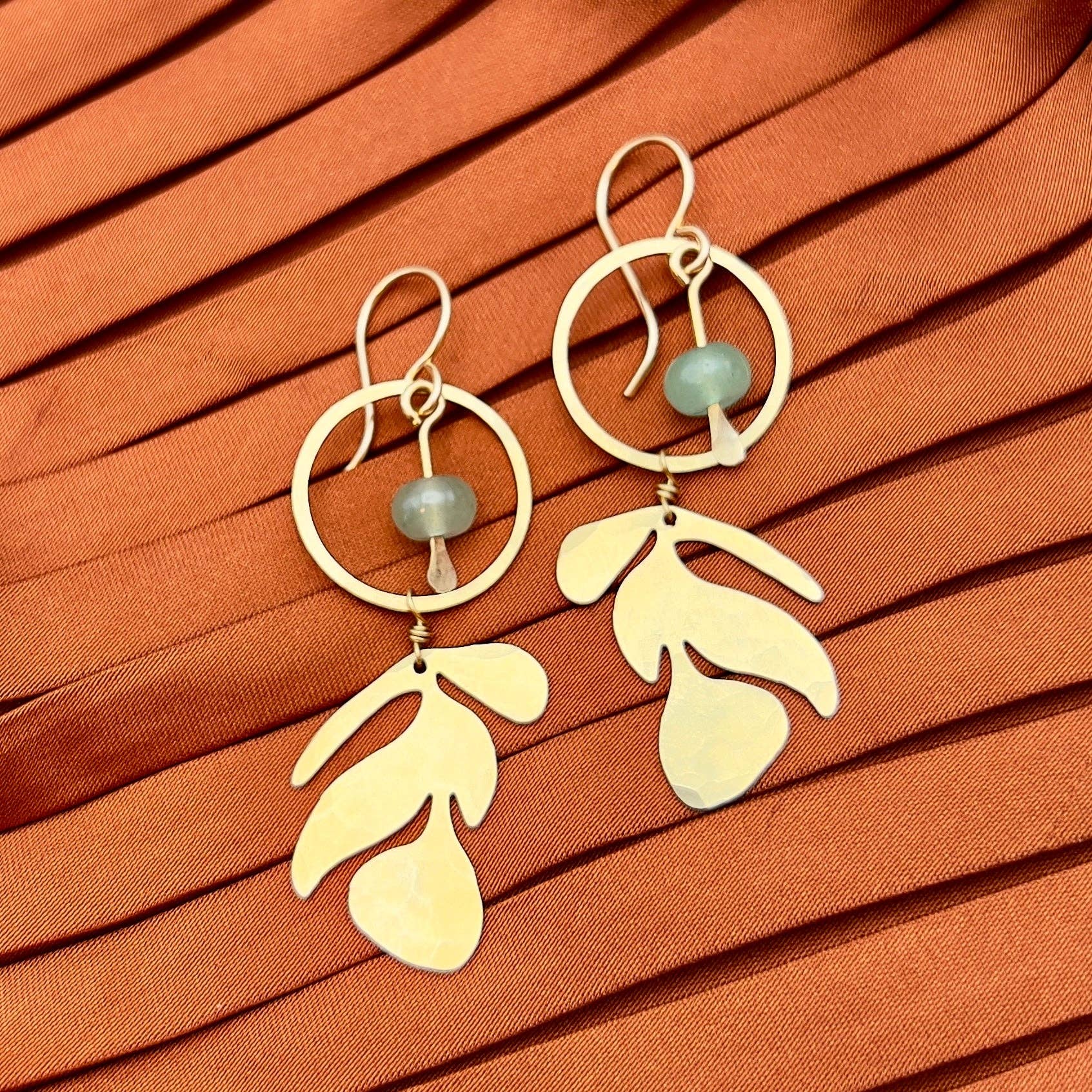 Textured brass or sterling silver plated brass pieces with green aventurine, dangle from 14k gold filled or sterling silver ear wire.