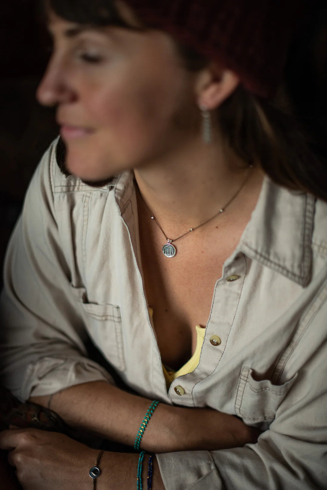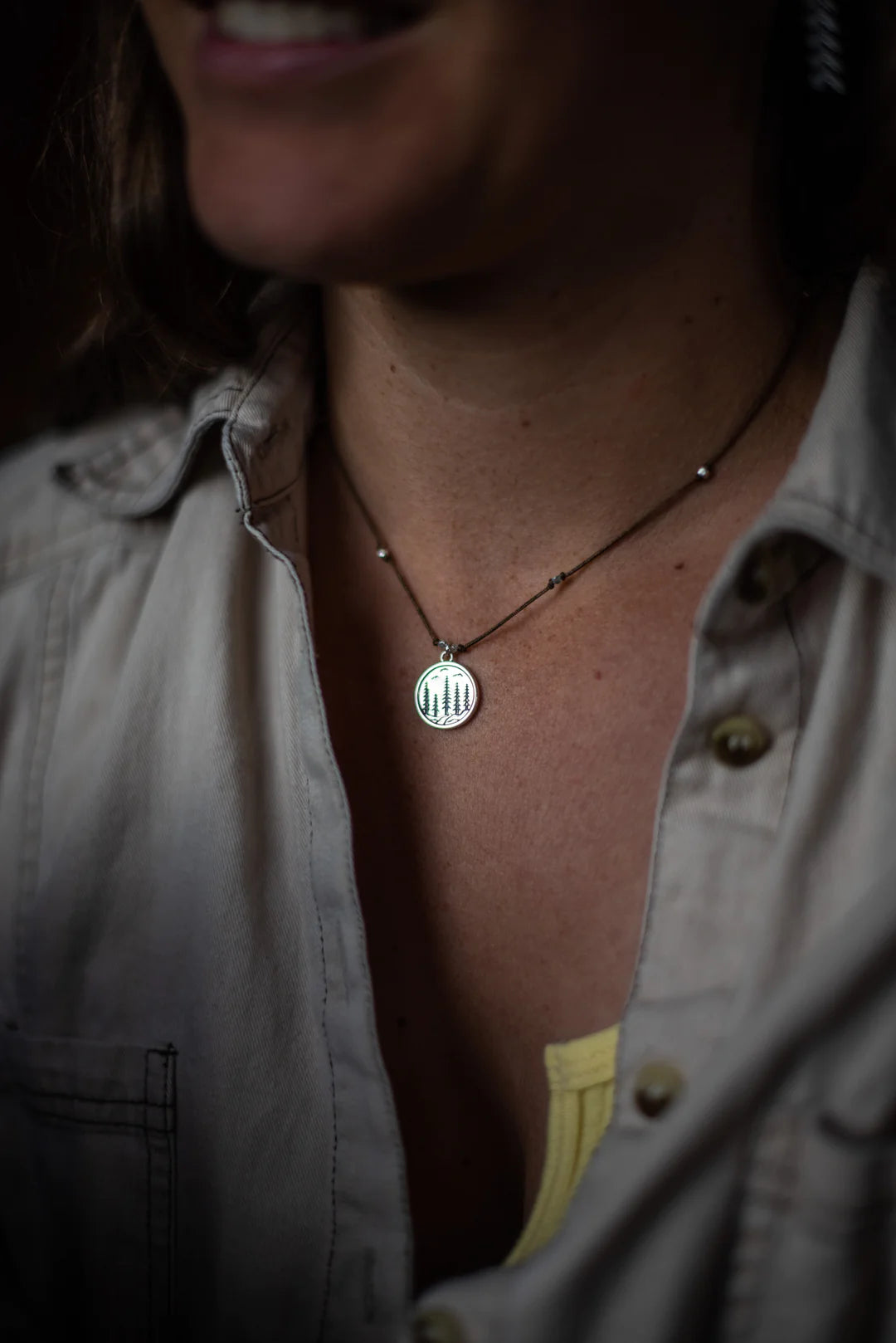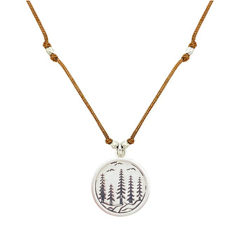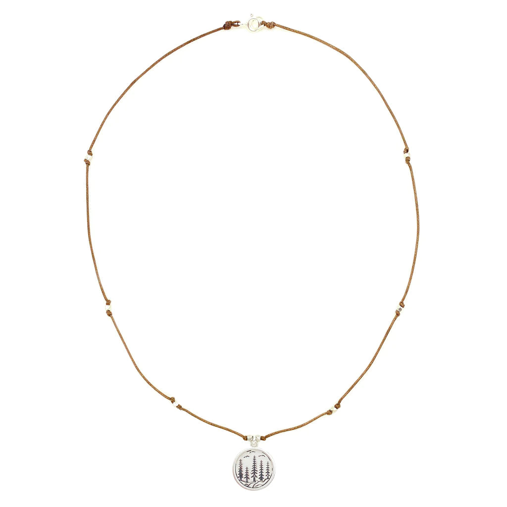 Dreaming of those Happy Trails with this one!  Towering trees, flowing waters, and  soaring birds above the trees.  What great peace and solace we find when we venture out to our favorite local trails.  Beautiful sterling silver pendant has etched and oxidized details.  Water friendly nylon cord is adorned with silver accent beads throughout.  Available in Espresso cord, 16” length.