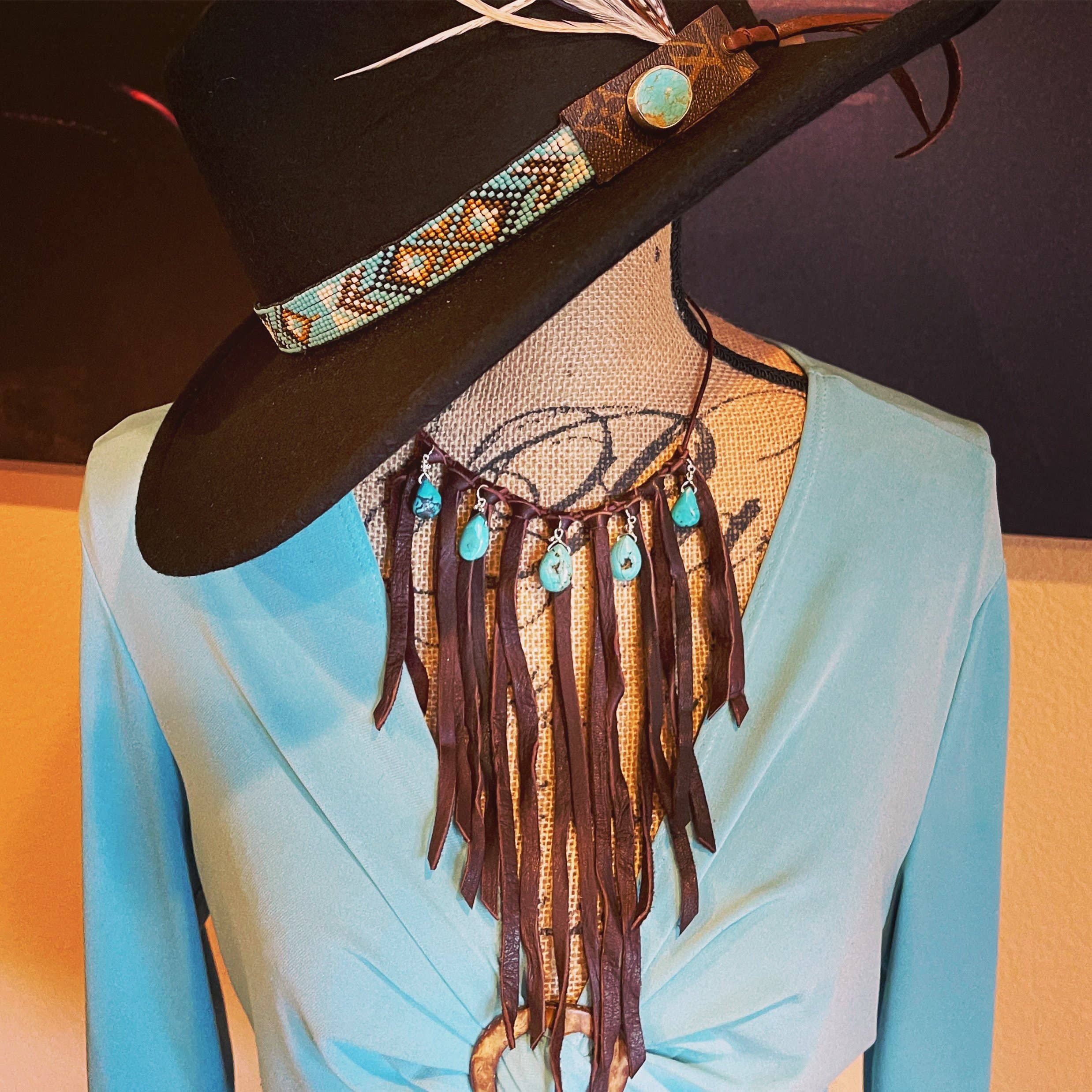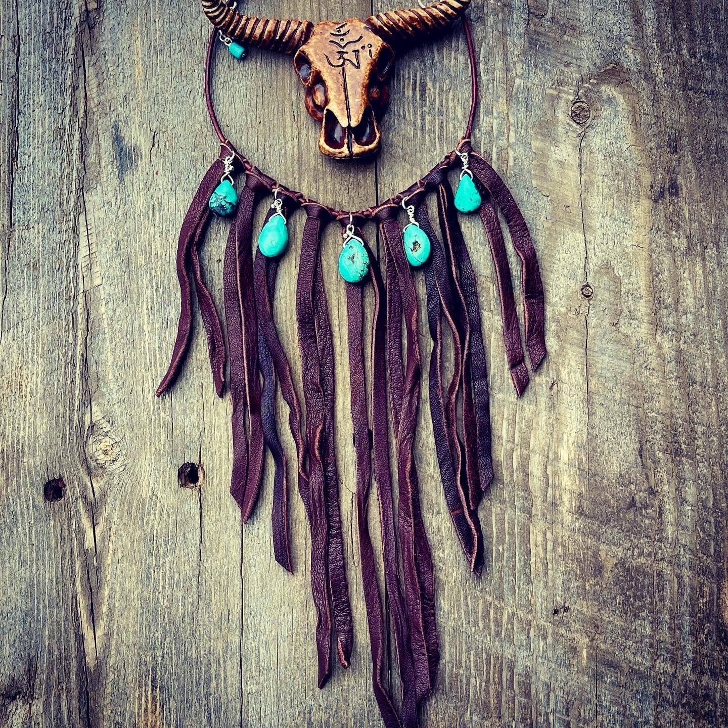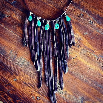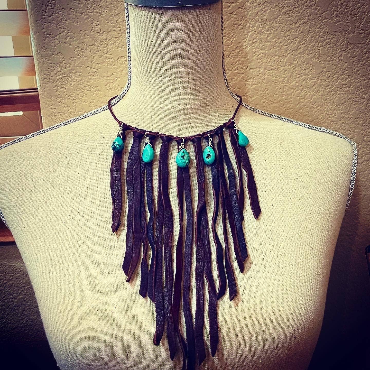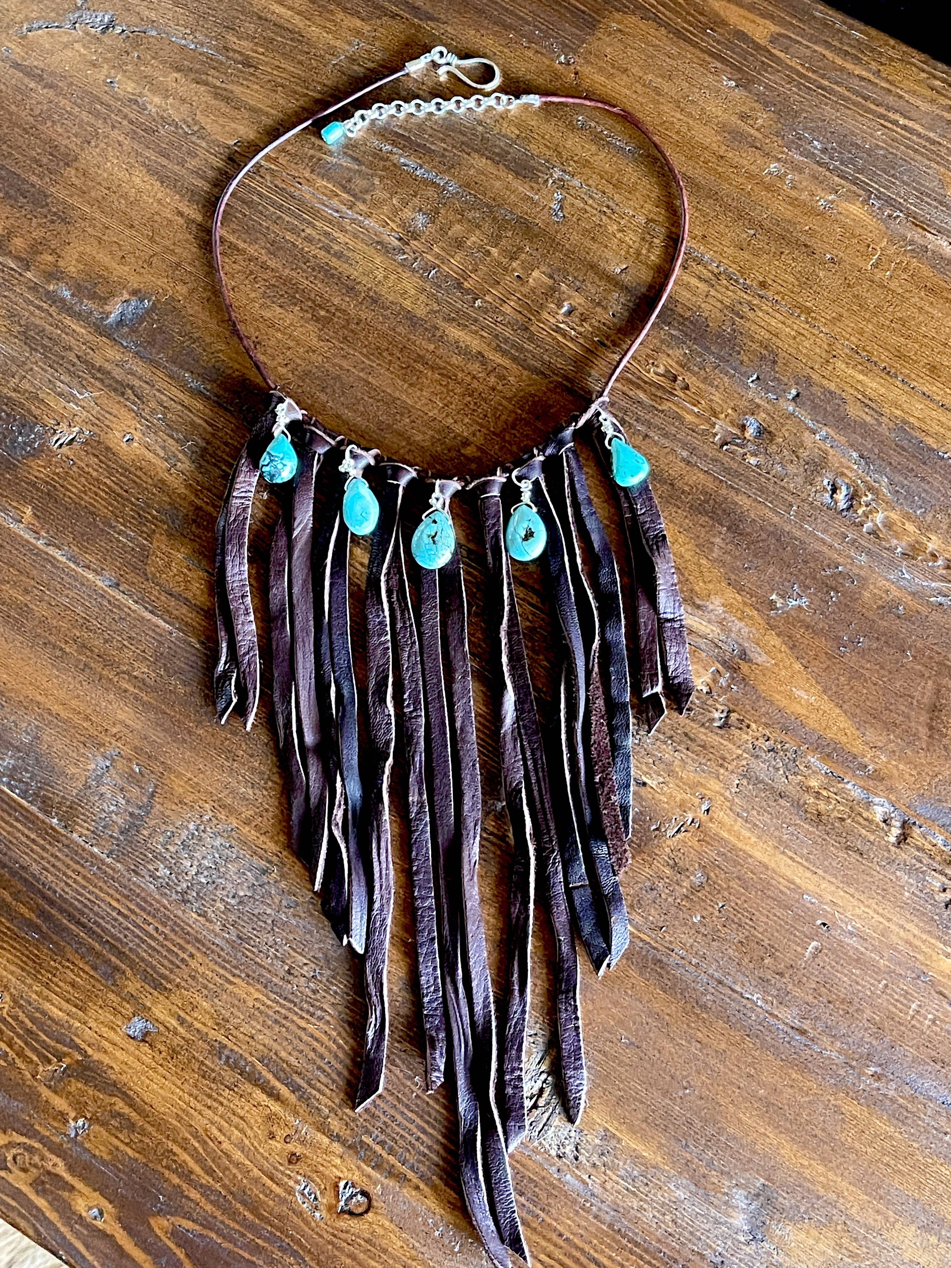 Leather Fringe Bib Necklace, Turquoise Bib Necklace, Fringe Choker, Deerskin Suede Necklace Our finest combination of Bohemian and Western, this bib necklace features ultra soft deerskin suede leather, turquoise drops, and sterling silver accents/closure. *Versatile in every way..rodeo, a night out, or dress up your favorite T! * The collar(leather strand) is adjustable from 15"" - 17"" with a 2 "" adjuster chain in the back. Longer adjuster chain available by request. *Length of fringe = hangs 7"" from collar *Width of fringe = 5""