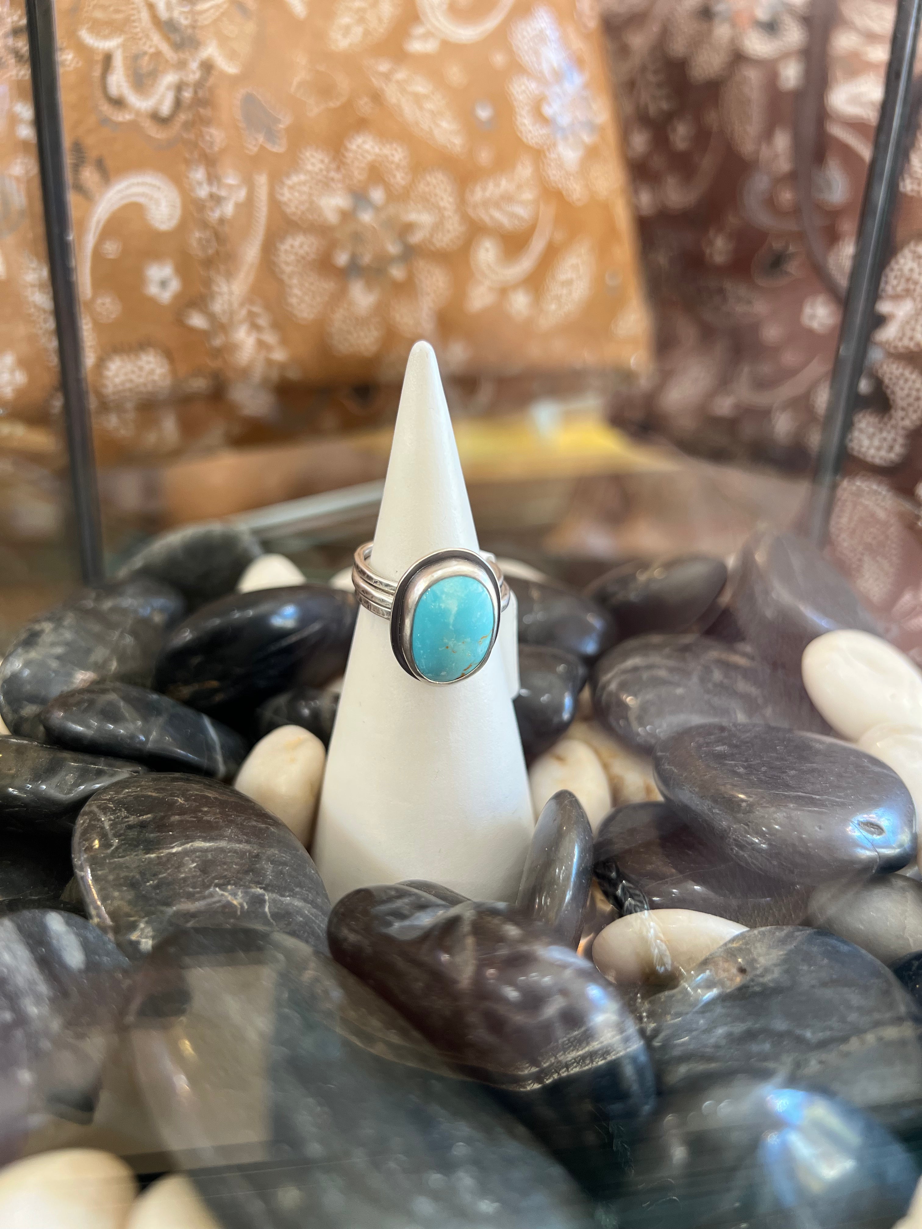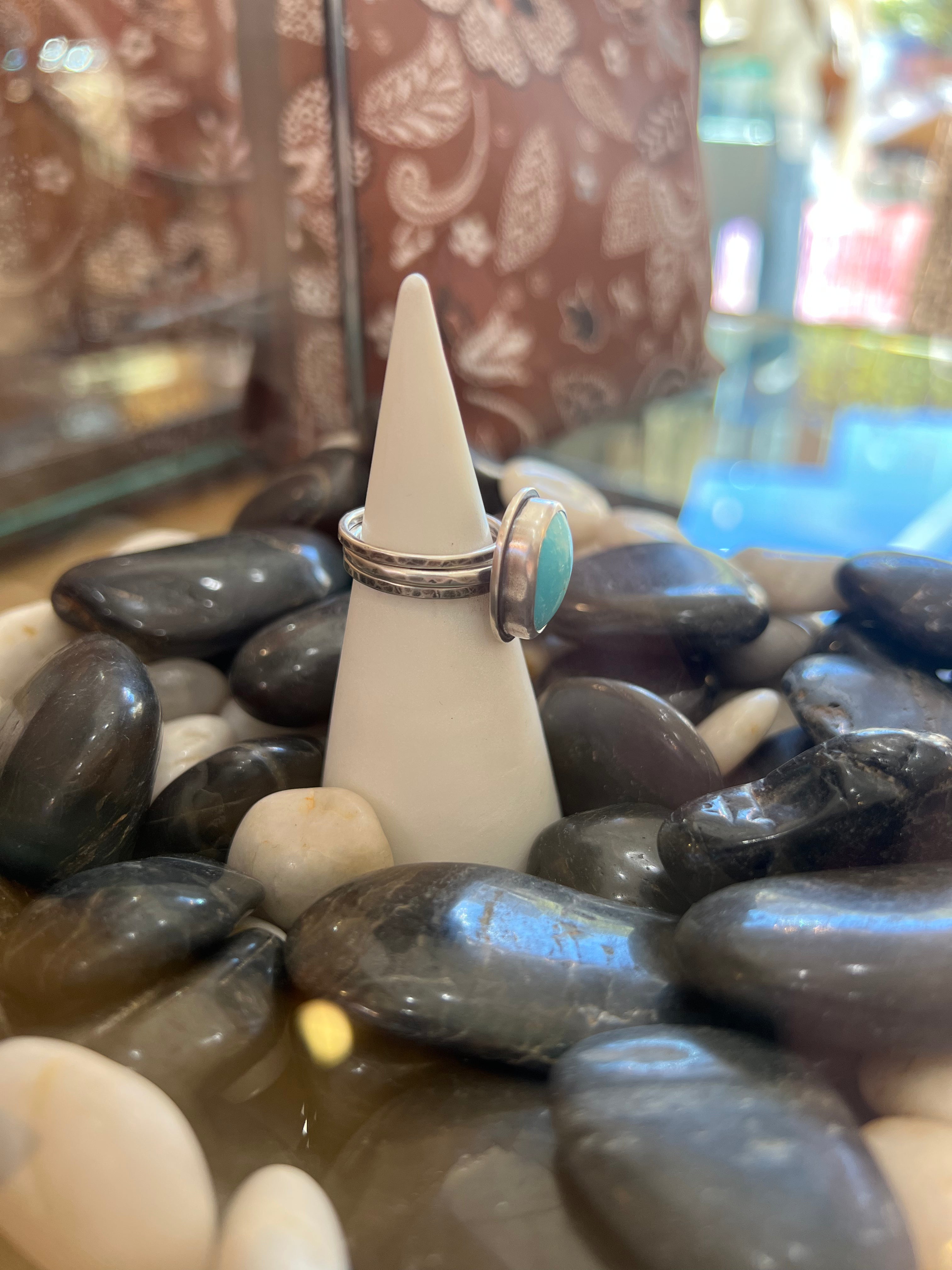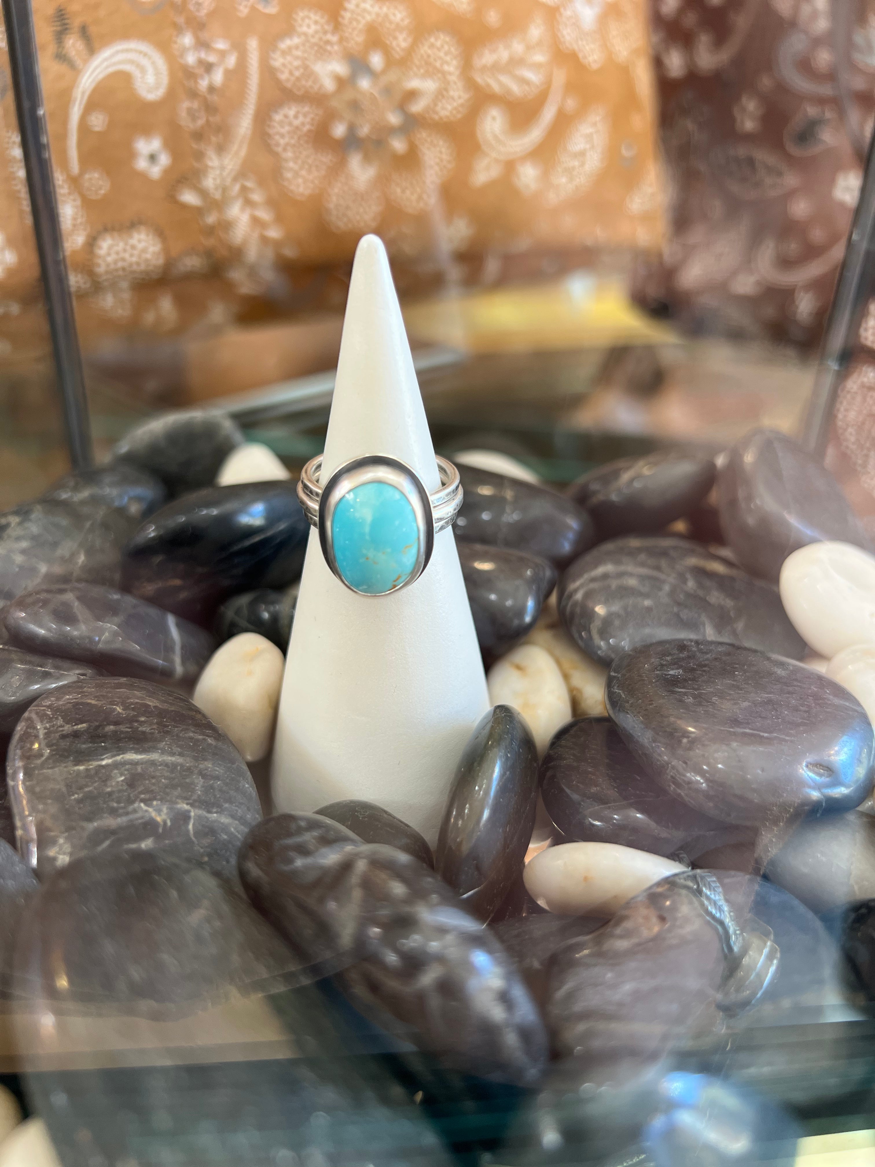 Blue Gem Turquoise in a sterling silver setting with a unique stackable silver band.