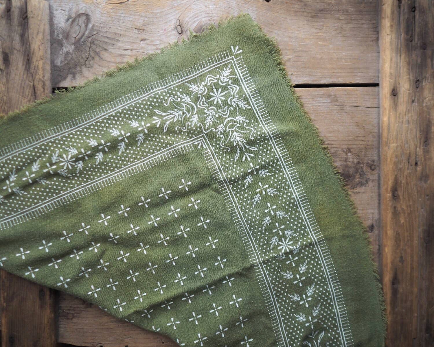 Olive Green Classic print Naturally Dyed Bandana (White ink)
