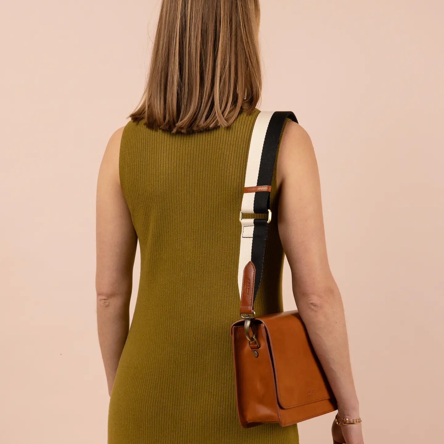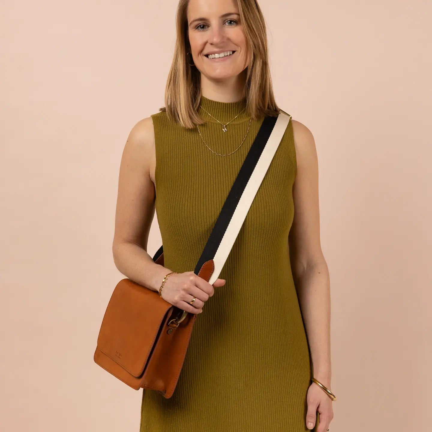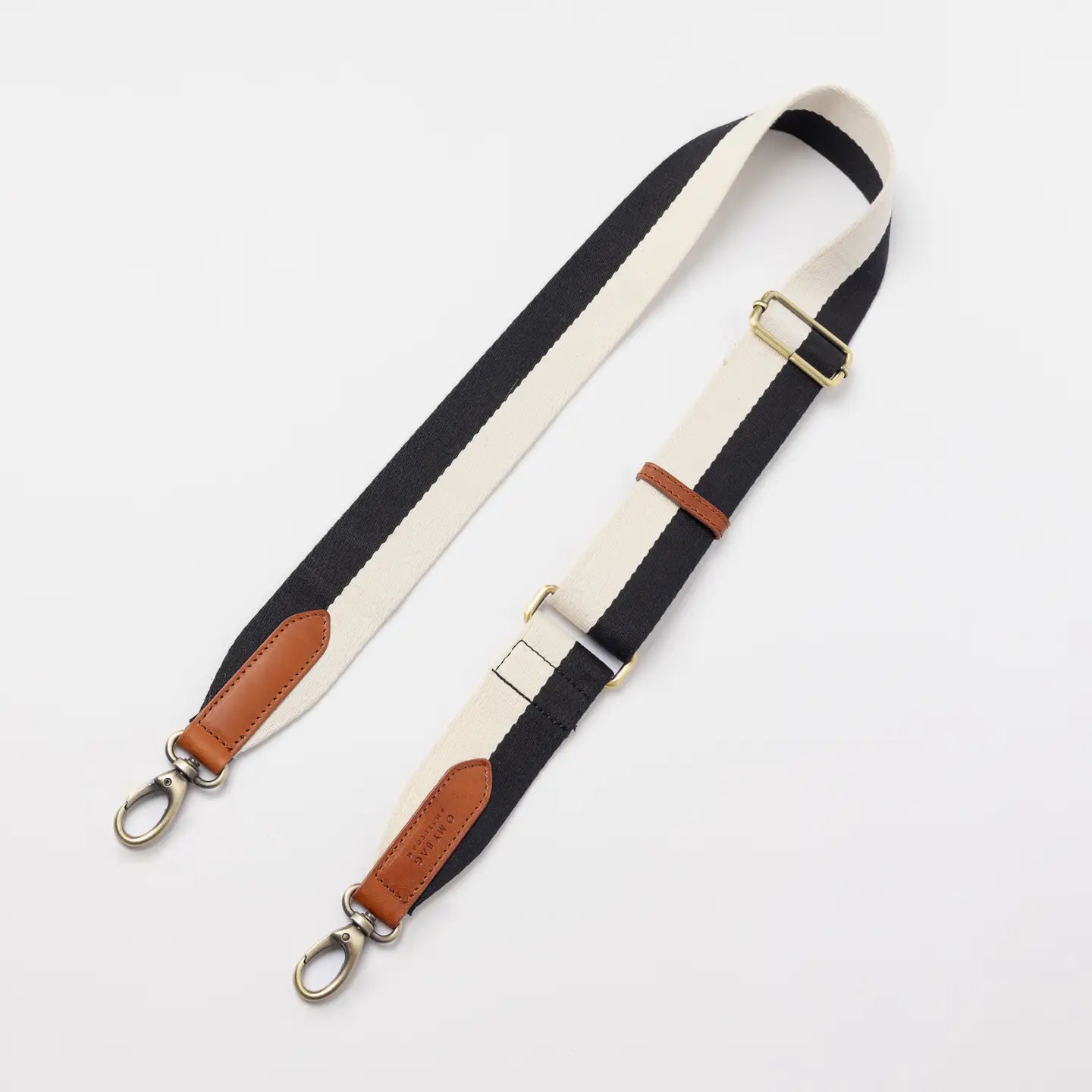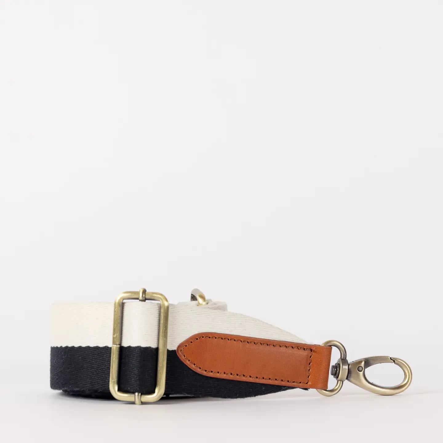 Transform your handbag with our striped webbing strap made from GOTS certified recycled cotton and smooth classic leather. The two tone white and black colourway matches any outfit while making that statement you are looking for. Convenient dog hooks make for an effortless swap. Add this strap to any bag, our favorites are Audrey and Bobbi Midi.