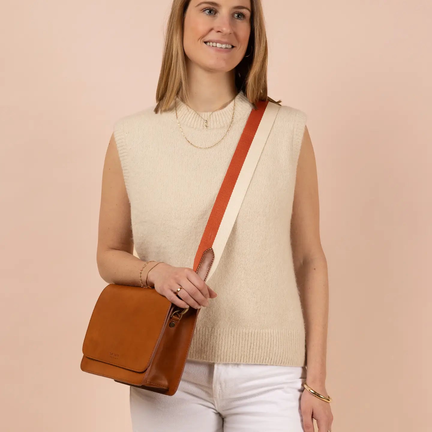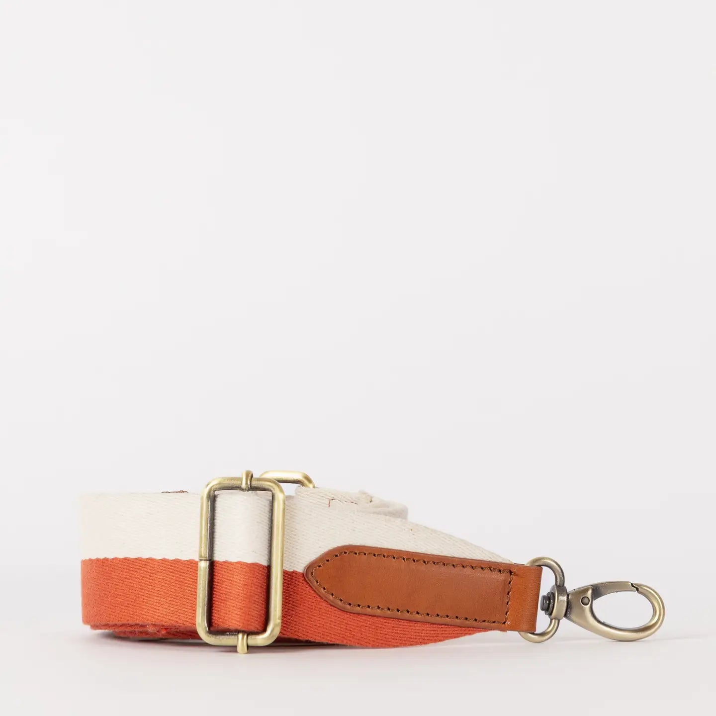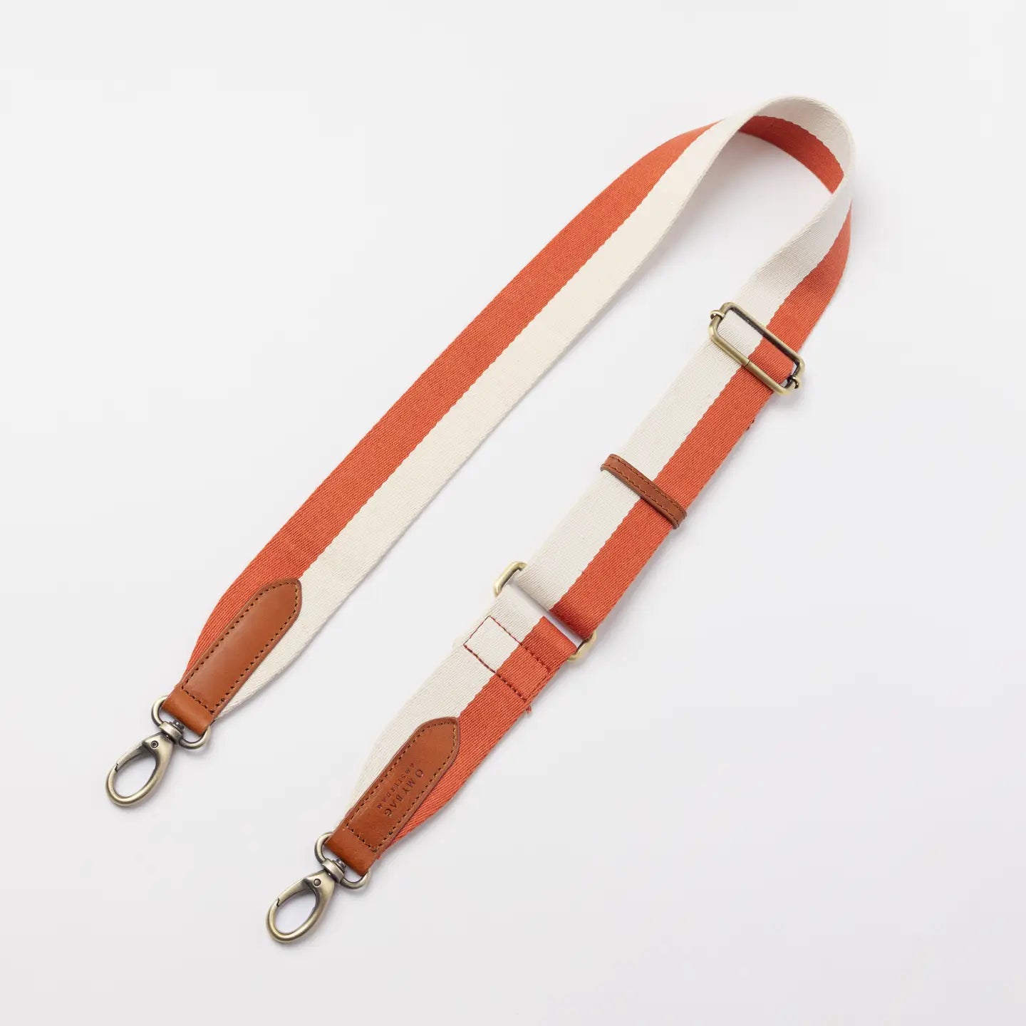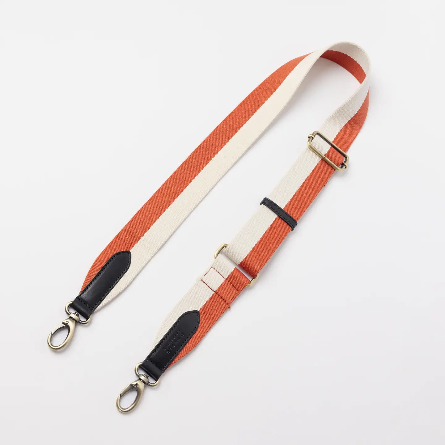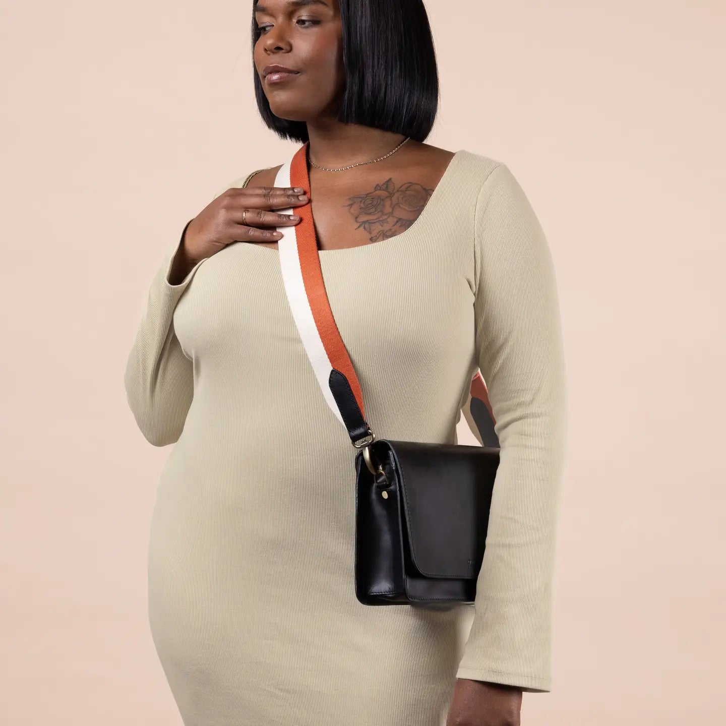 Transform your handbag with our striped webbing strap made from GOTS certified recycled cotton and smooth classic leather. The two tone white and black colourway matches any outfit while making that statement you are looking for. Convenient dog hooks make for an effortless swap. Add this strap to any bag, our favorites are Audrey and Bobbi Midi.